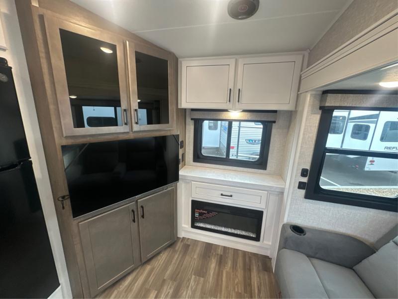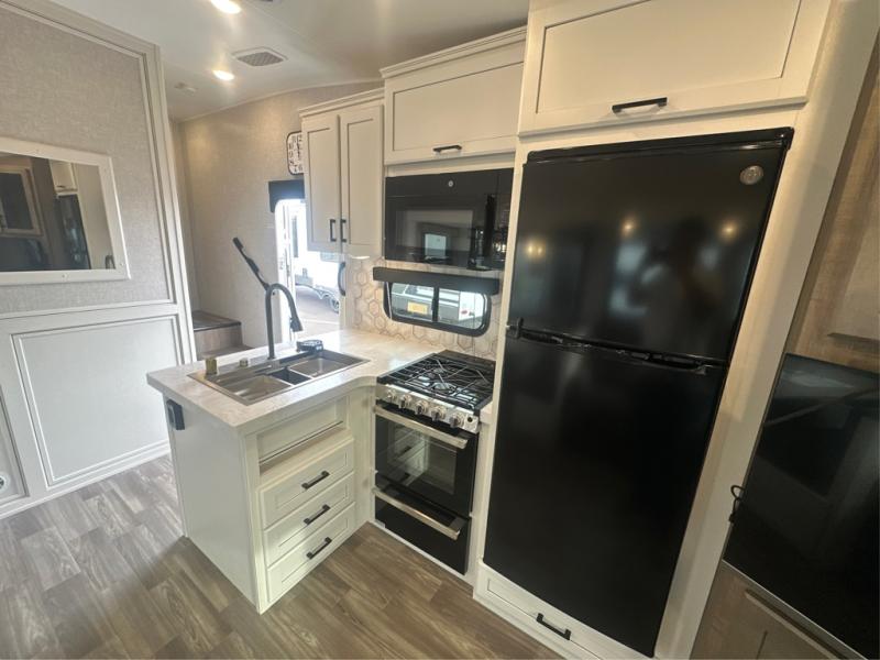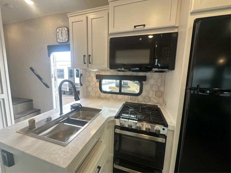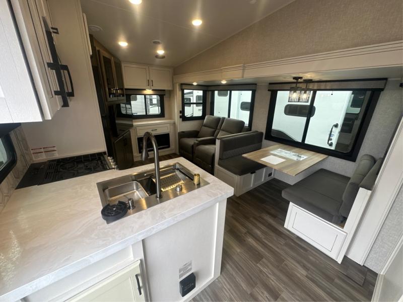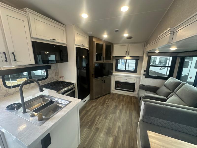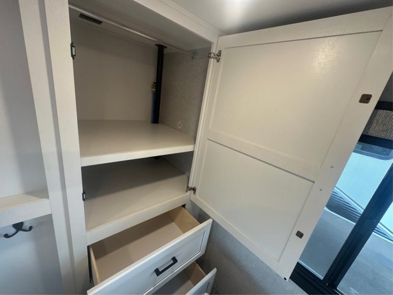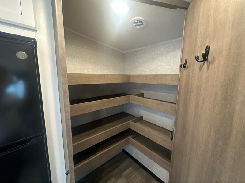 This is the perfect couple's fifth wheel since it features sleeping space for two up front! You can use the dual bedroom wardrobes to store your clothes in, and the full bath is close by so you can get ready each morning. After you've whipped up breakfast in the kitchen, you can dine at the table and chairs with bench seating, then relax with your coffee on the theater seat. There is an entertainment center across from the sofa for convenience, plus a hidden walk-in pantry behind the TV. You might even like to add the fireplace option to make it feel more like home!