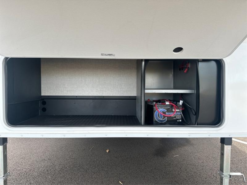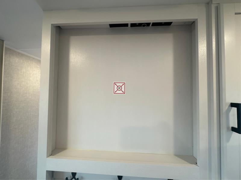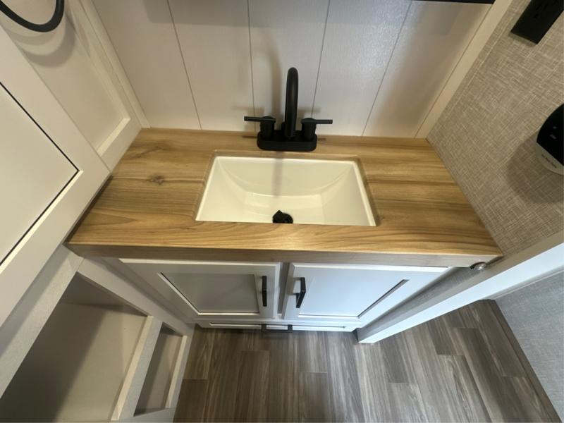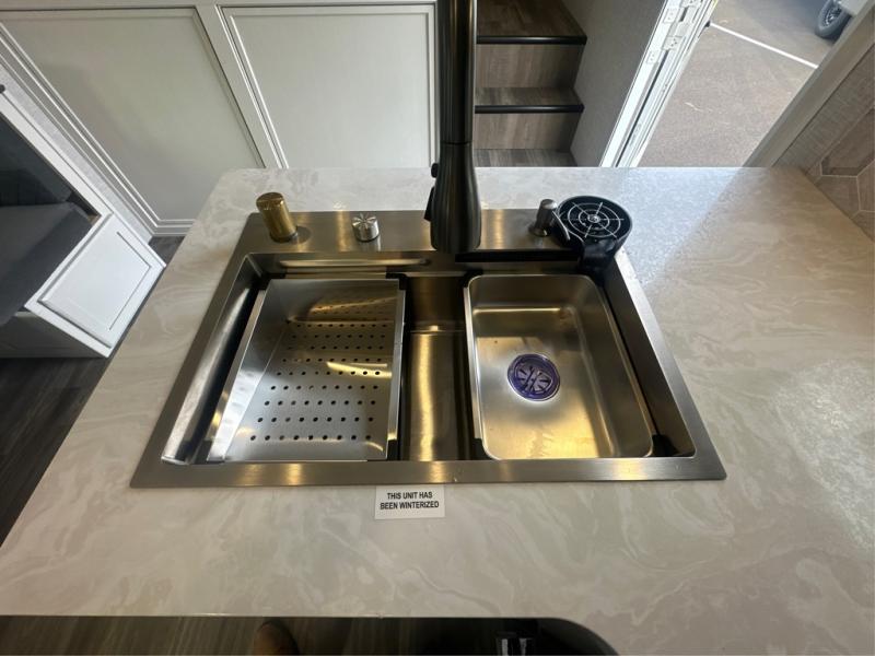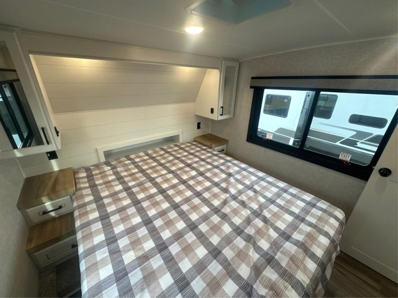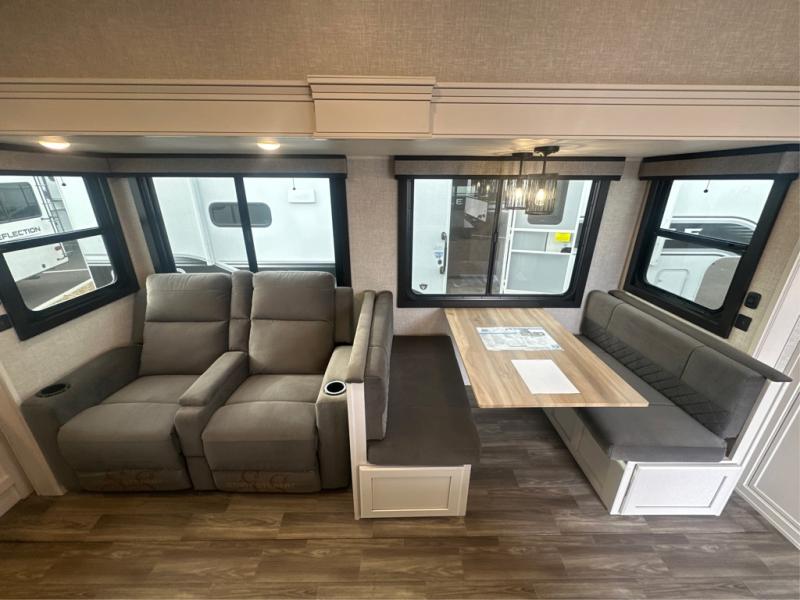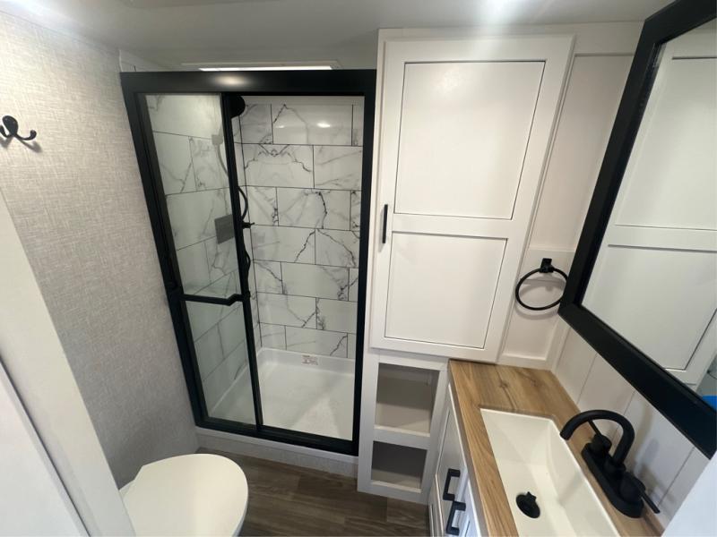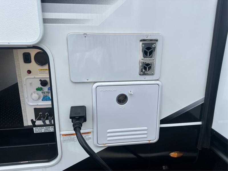 This is the perfect couple's fifth wheel since it features sleeping space for two up front! You can use the dual bedroom wardrobes to store your clothes in, and the full bath is close by so you can get ready each morning. After you've whipped up breakfast in the kitchen, you can dine at the table and chairs with bench seating, then relax with your coffee on the theater seat. There is an entertainment center across from the sofa for convenience, plus a hidden walk-in pantry behind the TV. You might even like to add the fireplace option to make it feel more like home!