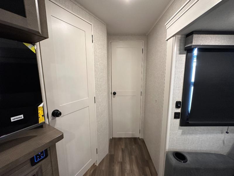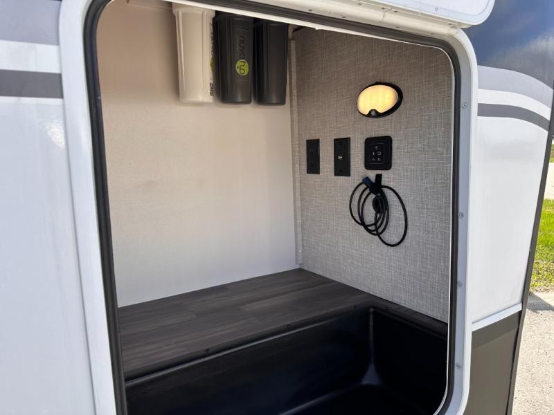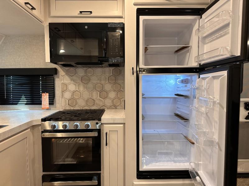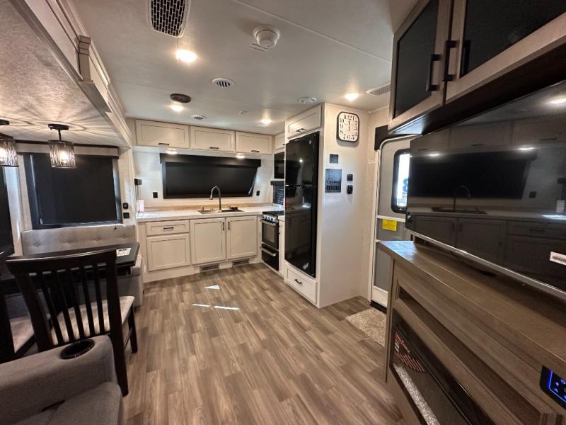 Escape the busyness of life for tranquil trips to the campground with this trailer. You will love the front kitchen with generous counter space, GE appliances, and a pantry by the entryway that can be used for food and more. If you're all hiked out, stay inside to relax on the theater seat across from the fireplace and entertainment center. There is also a free-standing table to dine at or play a game of cards. The dual entry bath will create a rear master suite, complete with a 66" x 80" Olympic queen bed across from a dresser, a private exit door, plus a full-width wardrobe with washer and dryer prep!