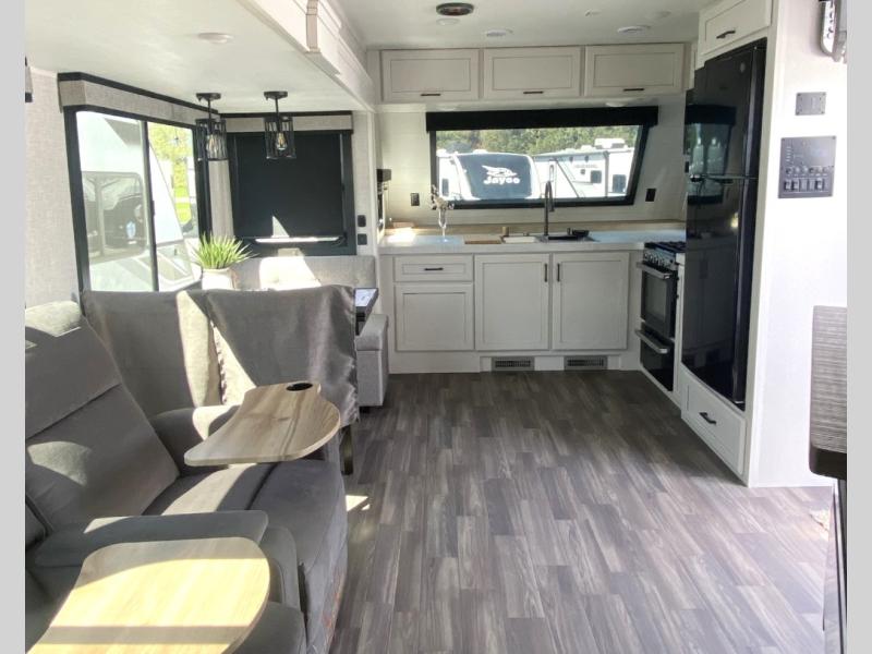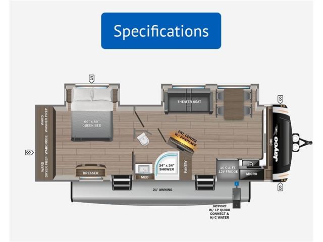 With any Eagle HT fifth wheel or travel trailer by Jayco you will enjoy a smooth drive thanks to the 4 Star Handling Package, Goodyear Endurance tires, and MORryde CRE-3000 rubberized suspension. The Customer Value Package includes amenities that are sure to make camping easier than ever, like the 60K on-demand water heater, Keyed-Alike lock system, 15,000 BTU "Whisper Quiet" A/C, and more. Handcrafted and glazed door/drawer fronts will make your space feel more like home, along with residential vinyl flooring throughout, GE appliances, and blackout roller shades with reflective side throughout to keep the sun out when you want to sleep in. Each model also includes a NuVo H2O water treatment system with filters included, interior and exterior "Blue Sync" audio connect with MB Quart Sound for your TV and phone, and 100% no floor vents for added comfort and convenience!