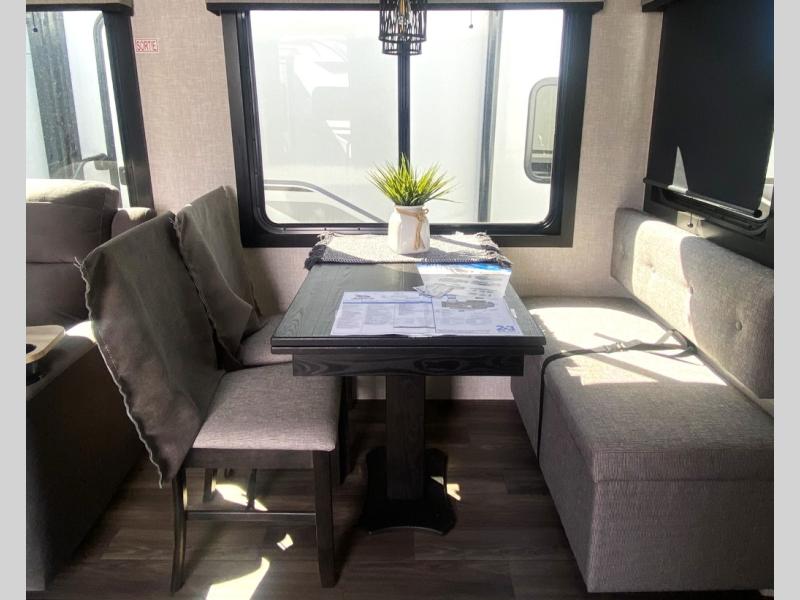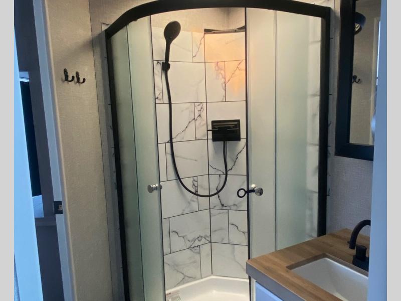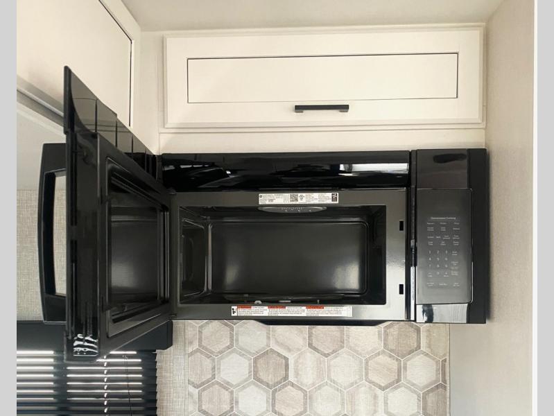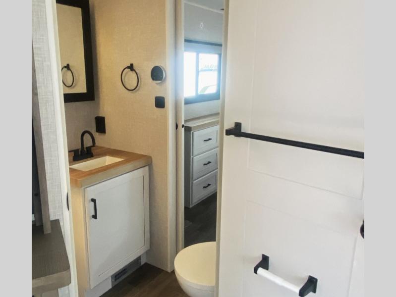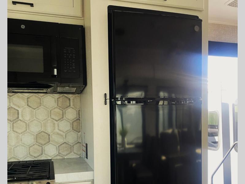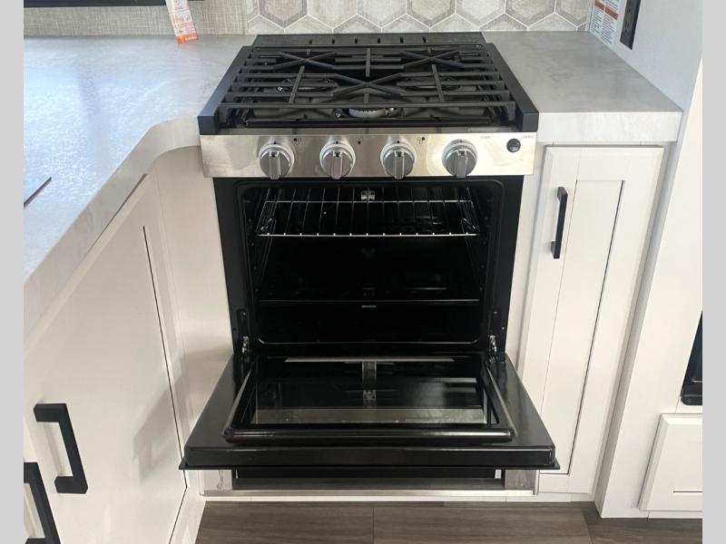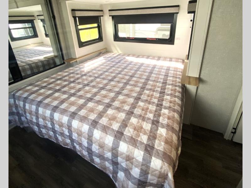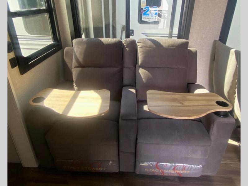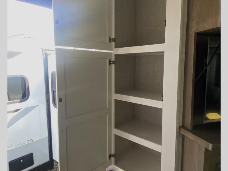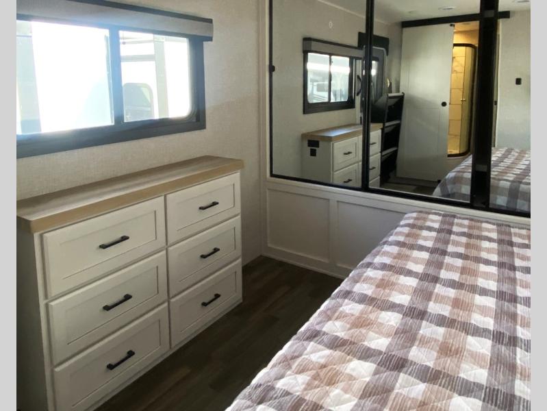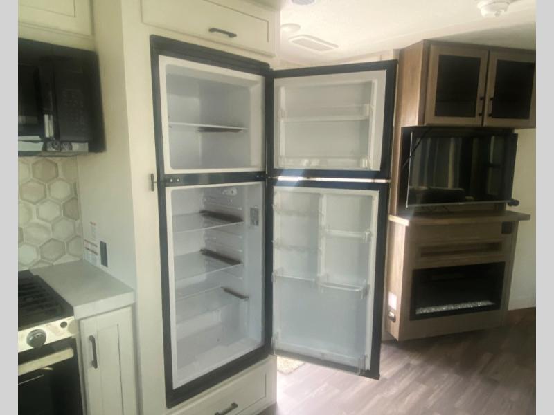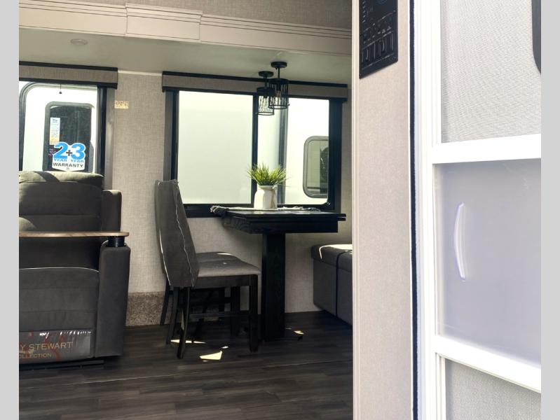 Escape the busyness of life for tranquil trips to the campground with this trailer. You will love the front kitchen with generous counter space, GE appliances, and a pantry by the entryway that can be used for food and more. If you're all hiked out, stay inside to relax on the theater seat across from the fireplace and entertainment center. There is also a free-standing table to dine at or play a game of cards. The dual entry bath will create a rear master suite, complete with a 66" x 80" Olympic queen bed across from a dresser, a private exit door, plus a full-width wardrobe with washer and dryer prep!