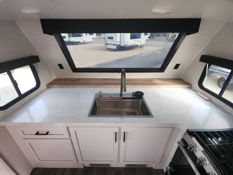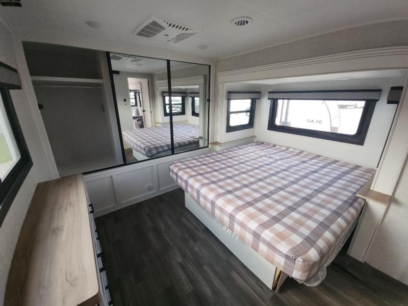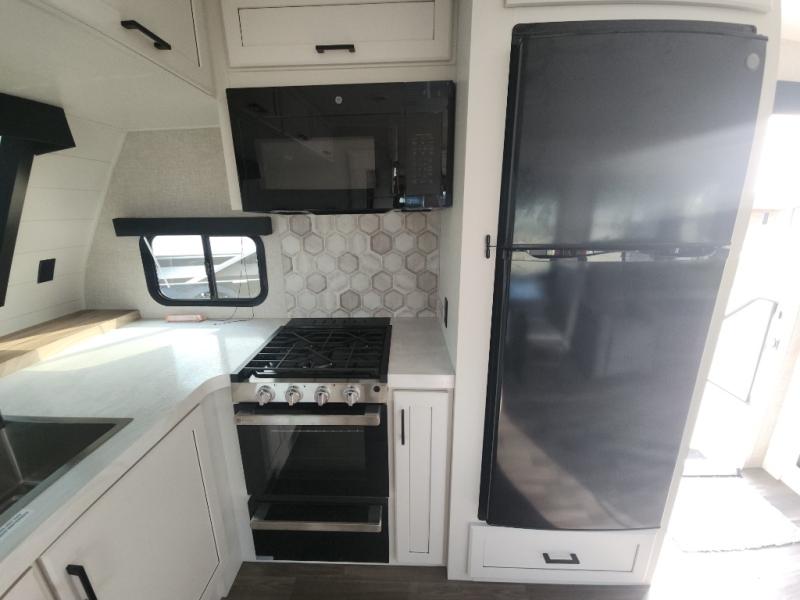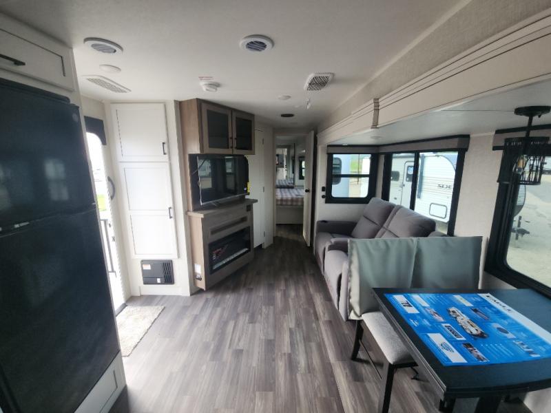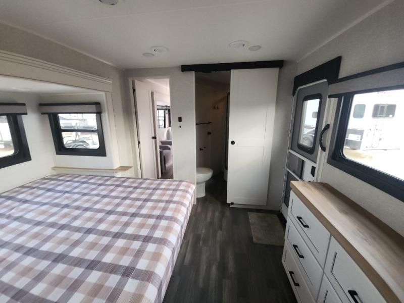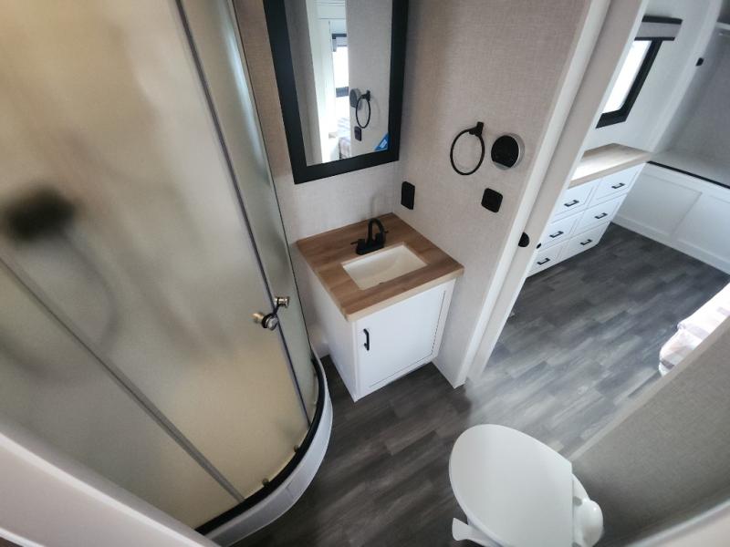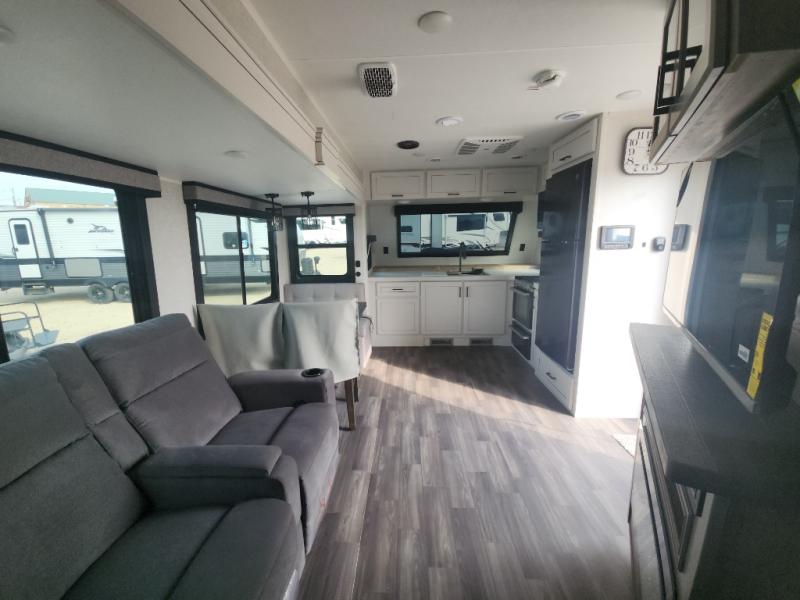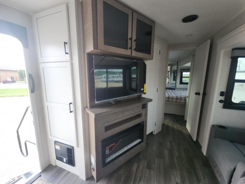 Escape the busyness of life for tranquil trips to the campground with this trailer. You will love the front kitchen with generous counter space, GE appliances, and a pantry by the entryway that can be used for food and more. If you're all hiked out, stay inside to relax on the theater seat across from the fireplace and entertainment center. There is also a free-standing table to dine at or play a game of cards. The dual entry bath will create a rear master suite, complete with a 66" x 80" Olympic queen bed across from a dresser, a private exit door, plus a full-width wardrobe with washer and dryer prep!