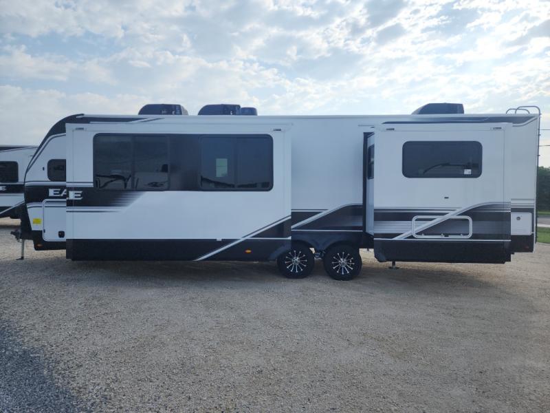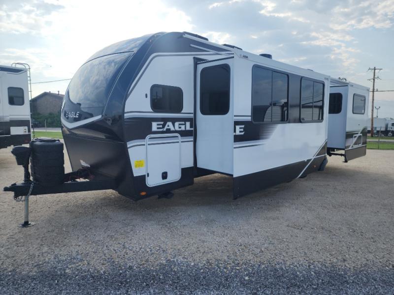 With any Eagle HT fifth wheel or travel trailer by Jayco you will enjoy a smooth drive thanks to the 4 Star Handling Package, Goodyear Endurance tires, and MORryde CRE-3000 rubberized suspension. The Customer Value Package includes amenities that are sure to make camping easier than ever, like the 60K on-demand water heater, Keyed-Alike lock system, 15,000 BTU "Whisper Quiet" A/C, and more. Handcrafted and glazed door/drawer fronts will make your space feel more like home, along with residential vinyl flooring throughout, GE appliances, and blackout roller shades with reflective side throughout to keep the sun out when you want to sleep in. Each model also includes a NuVo H2O water treatment system with filters included, interior and exterior "Blue Sync" audio connect with MB Quart Sound for your TV and phone, and 100% no floor vents for added comfort and convenience!