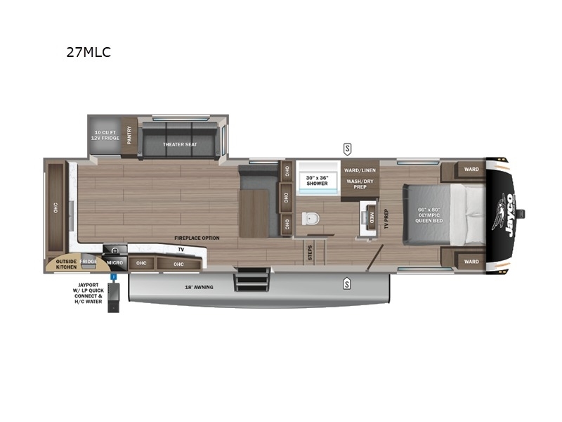 This fifth wheels is perfect for extended stays at the campground or weekend trips to the lake! Once you arrive at your destination, you can set up the 18' electric awning, then make lunch on the outside kitchen. The main living area will be a favorite place to join together since there is a theater seat across from the TV, an L-shaped dinette, and a fireplace option if you want to make this space even more cozy. Up front, a private bedroom includes an Olympic queen bed, dual wardrobes, plus washer and dryer prep if choose to add those appliances.