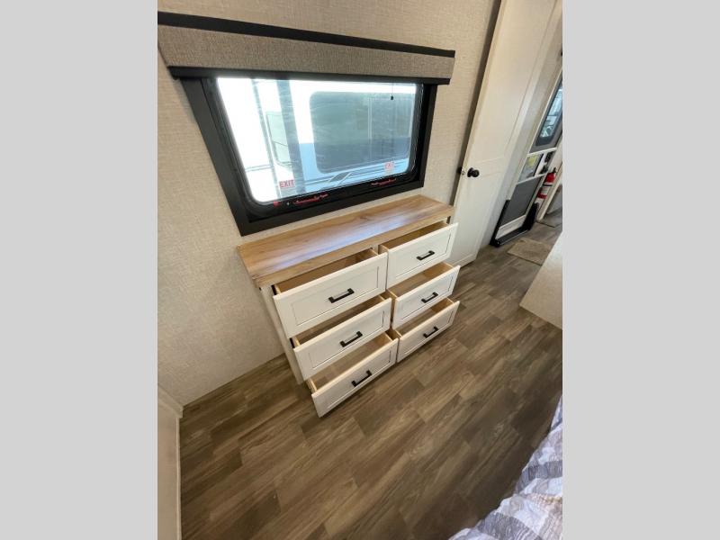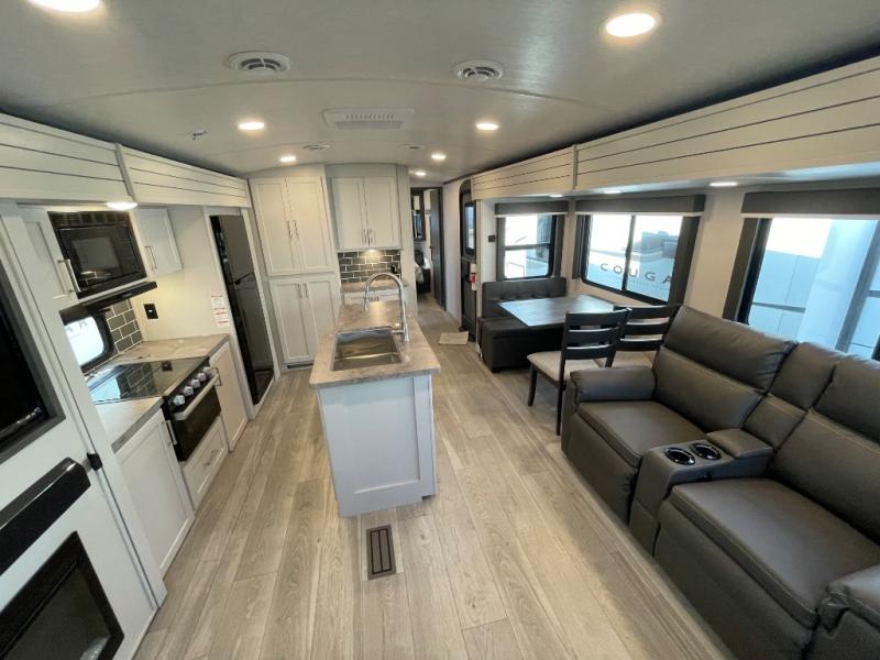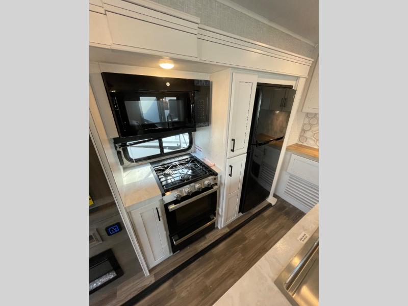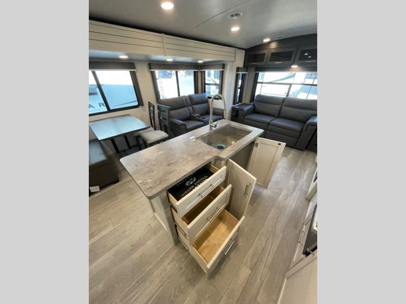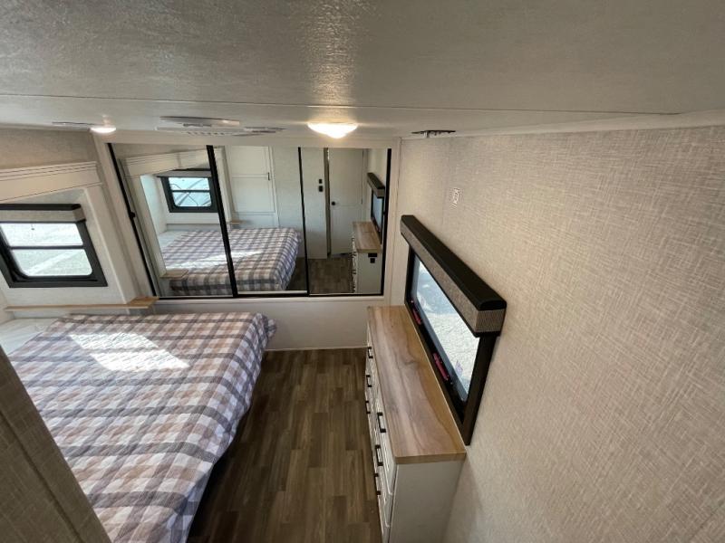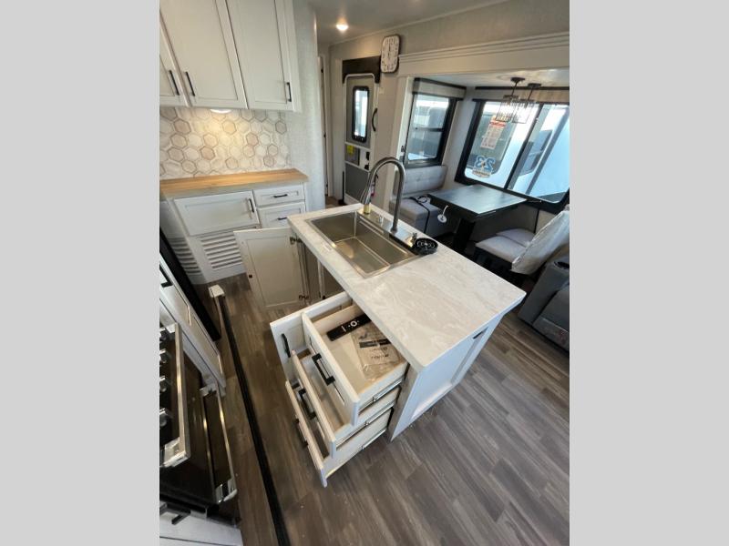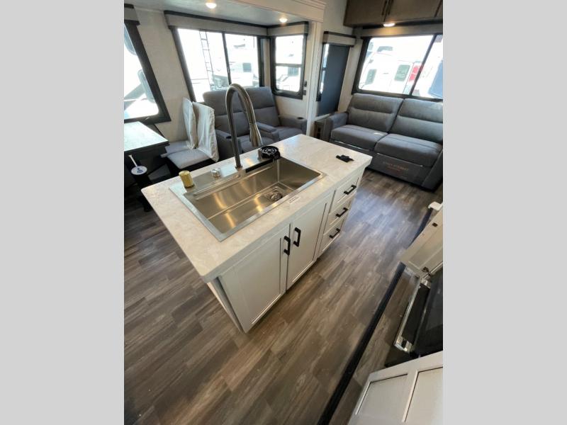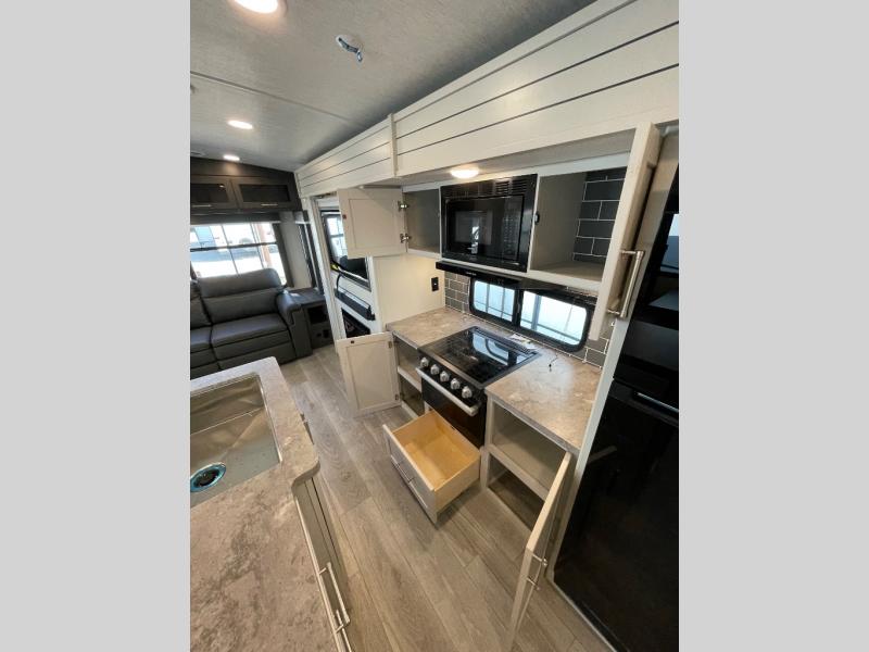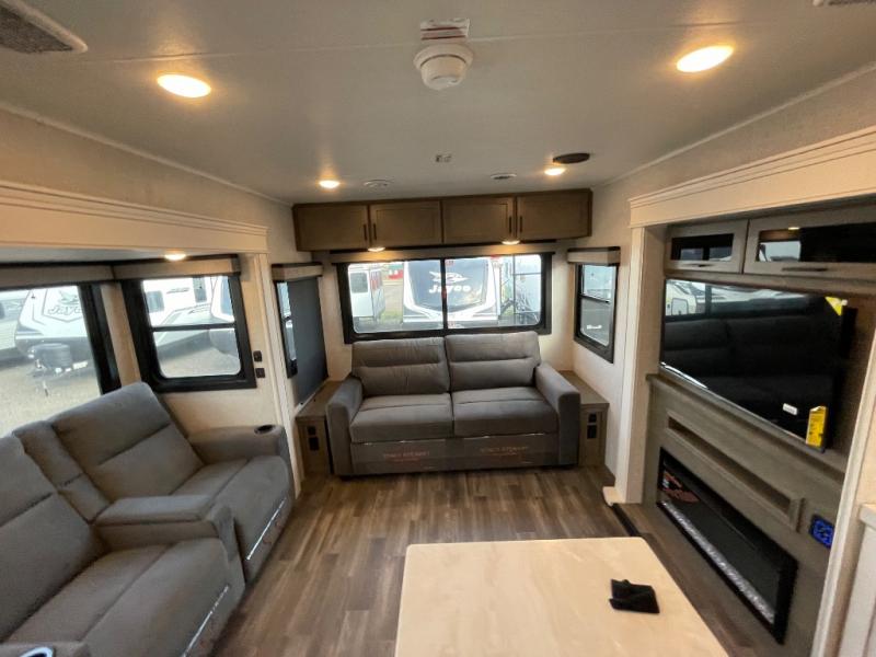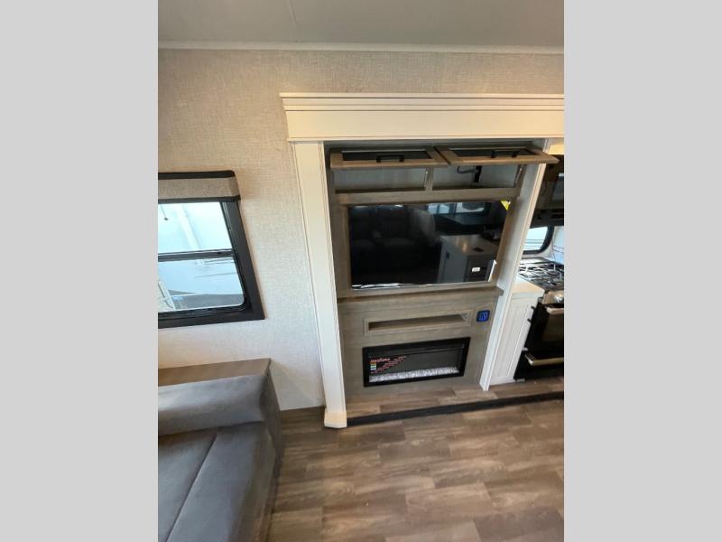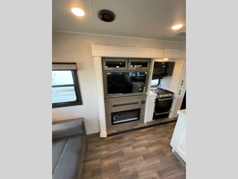 You will feel right at home camping in this travel trailer! It features a front private bedroom with an Olympic queen bed slide for more interior space, a dresser, a front wardrobe to hang your clothes, and a wardrobe that is prepped to add an optional washer and dryer. Start each morning getting squeaky clean in the full bathroom with the shower and then head to the kitchen to fry up some eggs on the stainless steel range. The kitchen island with a multi-functional sink will help make meal prepping easier too, plus there is a hutch to store your dishes. Enjoy a relaxing evening by the fireplace and watch your favorite movie with the entertainment center while sitting on either the rear tri-fold sofa or the theater seating!
