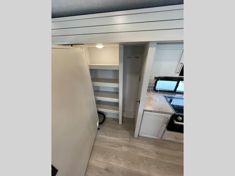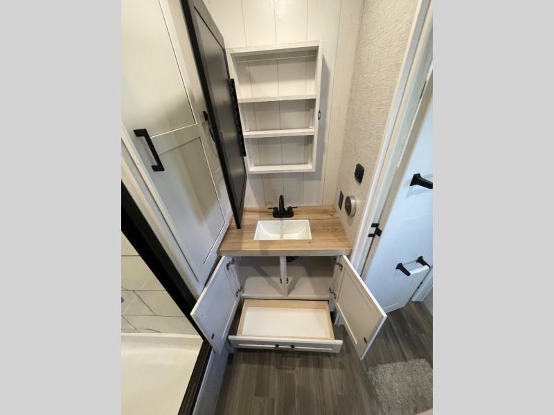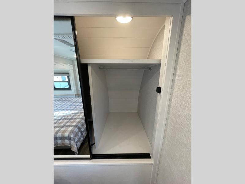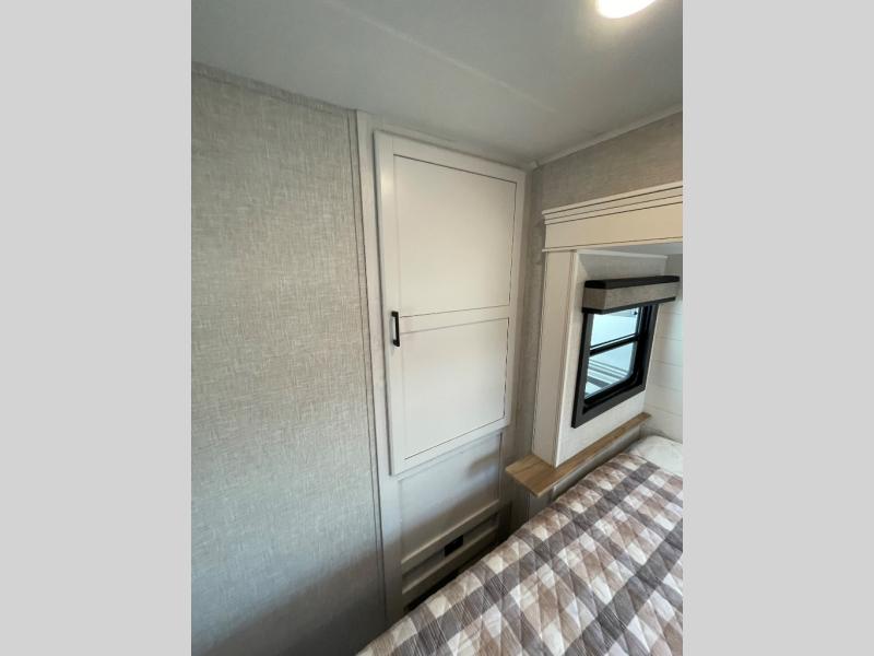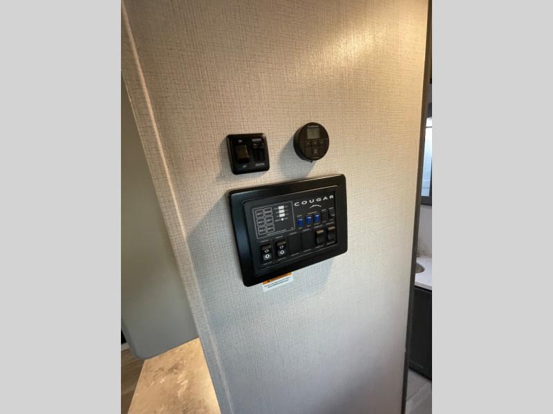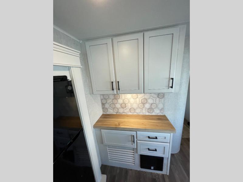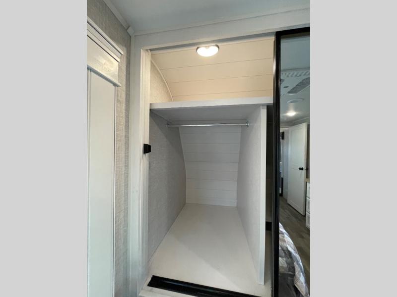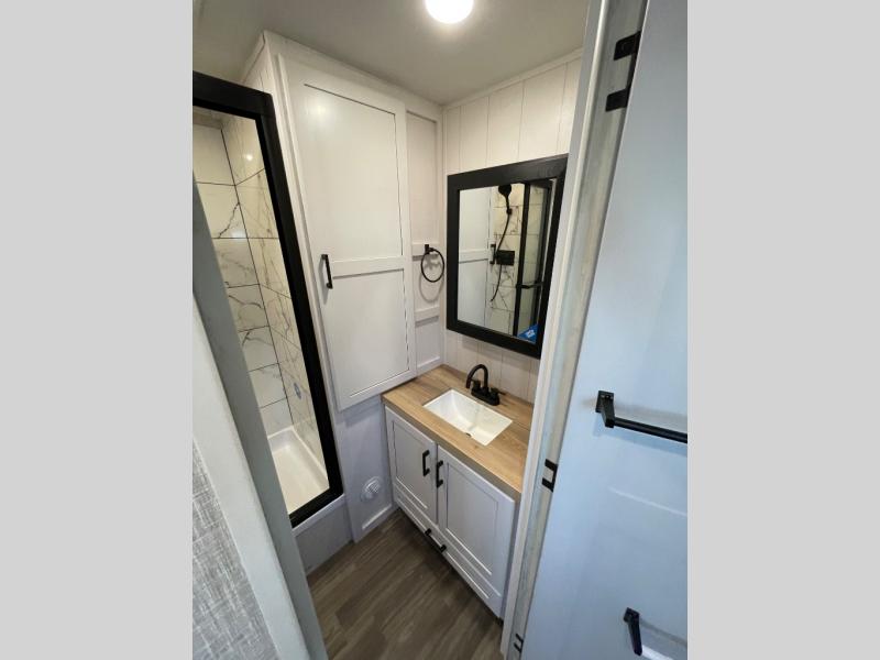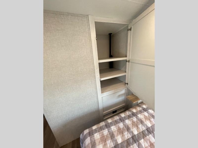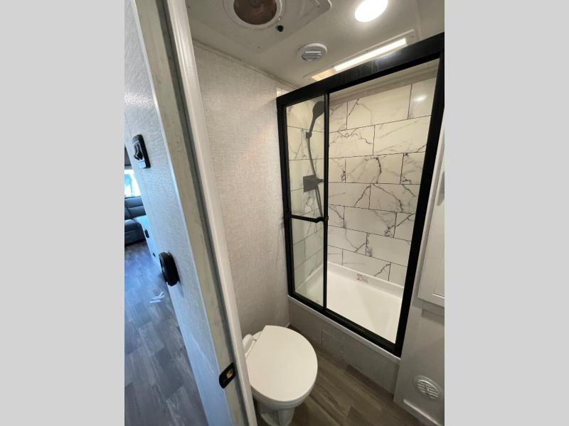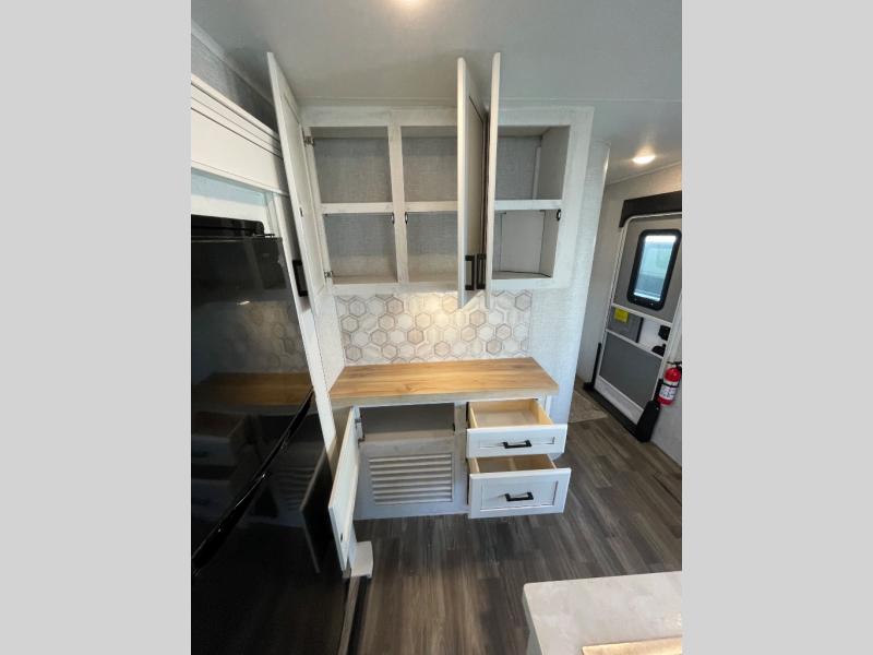 You will feel right at home camping in this travel trailer! It features a front private bedroom with an Olympic queen bed slide for more interior space, a dresser, a front wardrobe to hang your clothes, and a wardrobe that is prepped to add an optional washer and dryer. Start each morning getting squeaky clean in the full bathroom with the shower and then head to the kitchen to fry up some eggs on the stainless steel range. The kitchen island with a multi-functional sink will help make meal prepping easier too, plus there is a hutch to store your dishes. Enjoy a relaxing evening by the fireplace and watch your favorite movie with the entertainment center while sitting on either the rear tri-fold sofa or the theater seating!