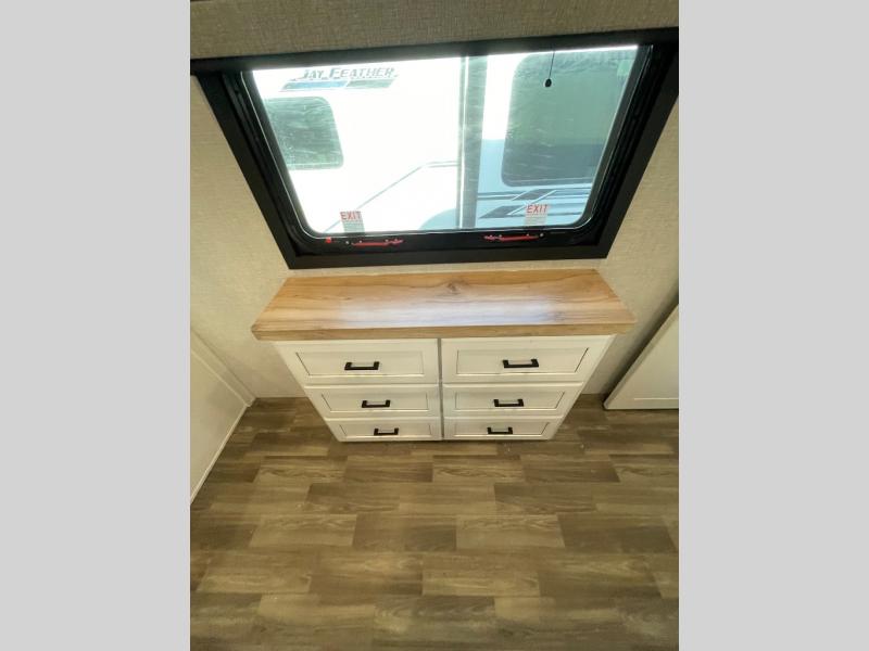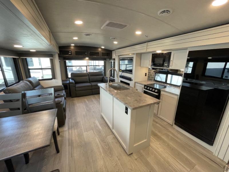 With any Eagle HT fifth wheel or travel trailer by Jayco you will enjoy a smooth drive thanks to the 4 Star Handling Package, Goodyear Endurance tires, and MORryde CRE-3000 rubberized suspension. The Customer Value Package includes amenities that are sure to make camping easier than ever, like the 60K on-demand water heater, Keyed-Alike lock system, 15,000 BTU "Whisper Quiet" A/C, and more. Handcrafted and glazed door/drawer fronts will make your space feel more like home, along with residential vinyl flooring throughout, GE appliances, and blackout roller shades with reflective side throughout to keep the sun out when you want to sleep in. Each model also includes a NuVo H2O water treatment system with filters included, interior and exterior "Blue Sync" audio connect with MB Quart Sound for your TV and phone, and 100% no floor vents for added comfort and convenience!