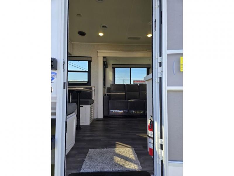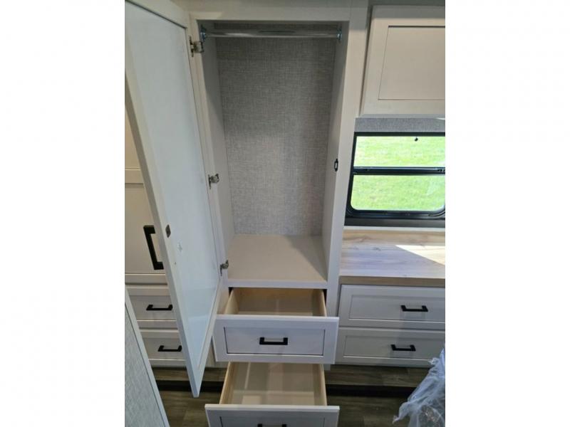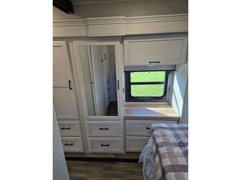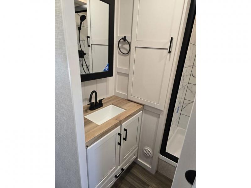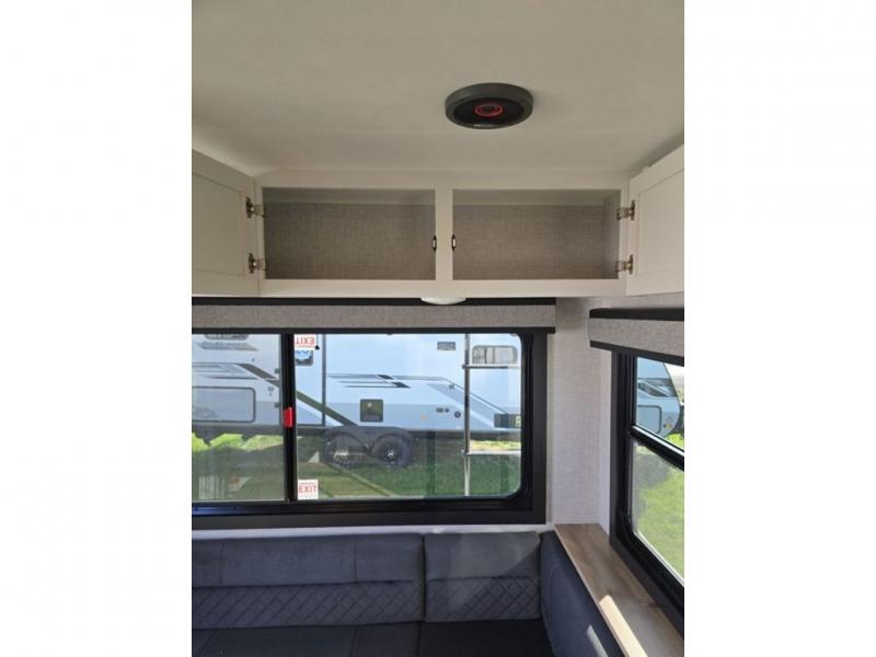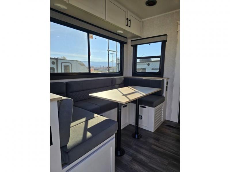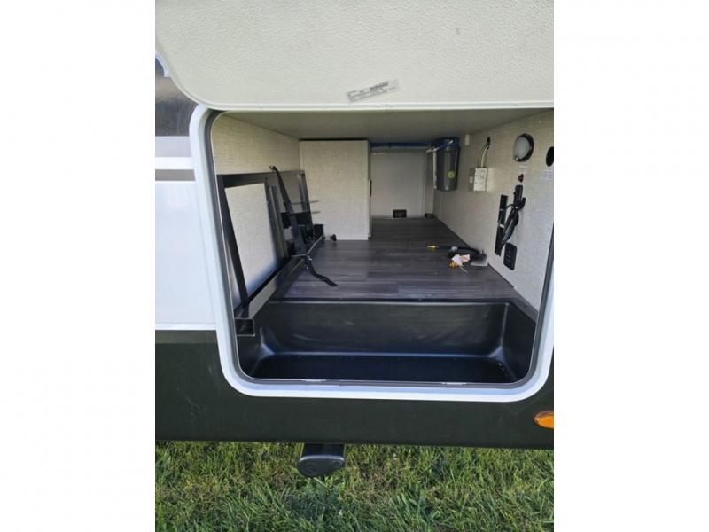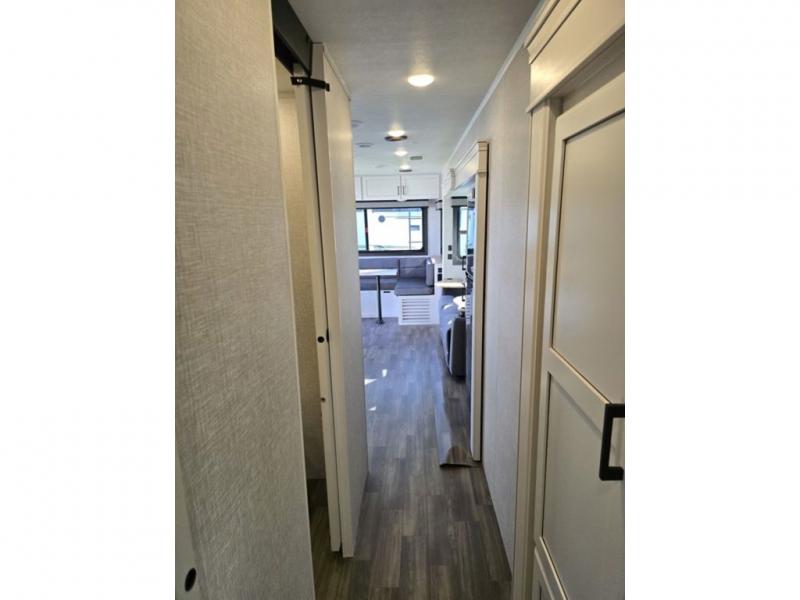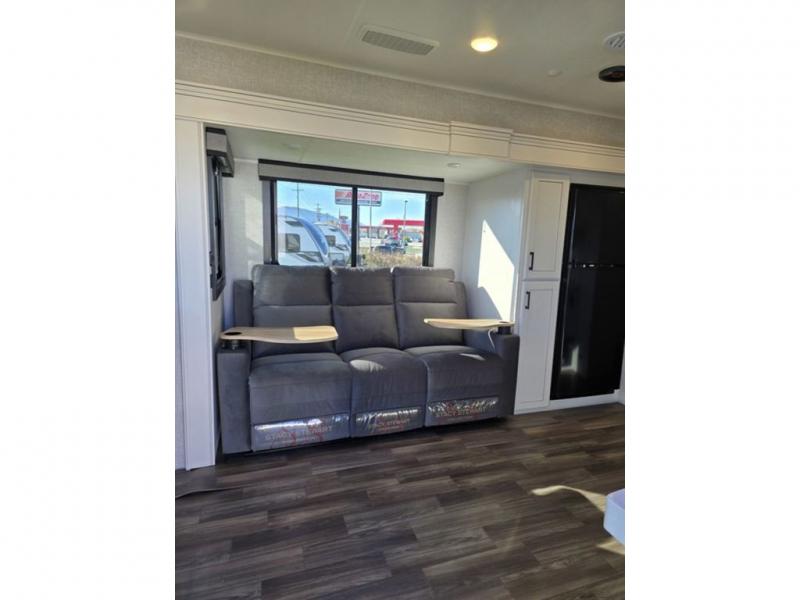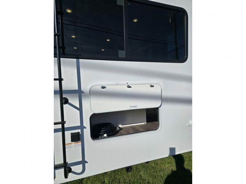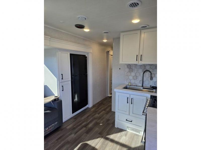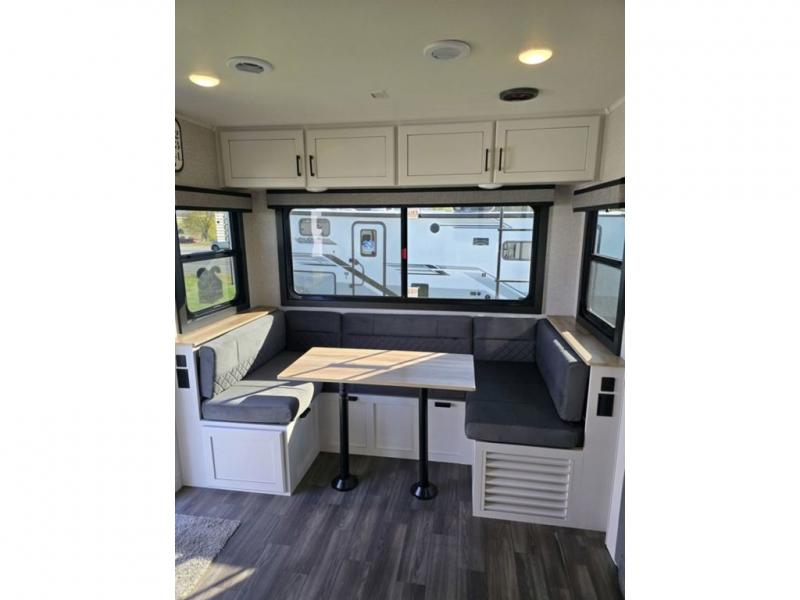 Wherever you decide to camp, you can count on at-home comforts with this travel trailer in tow! The large slide out in the main living area will provide your crew with more space to relax, and here you'll find a theater sofa in perfect view of the 40" 4K Ultra LED HD Smart TV. Once the chef of your group has prepared lunch on the three burner range, you can dine at the U-shaped dinette that will also double as your guests sleeping space at night. Up front, the private bedroom awaits you with an Olympic queen bed, dual wardrobes plus a bedroom slide out with a dresser, linen closet, and a wardrobe. This model also includes a full bath and a wardrobe with washer and dryer prep that will give the option to add those appliances!