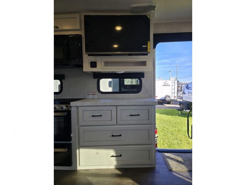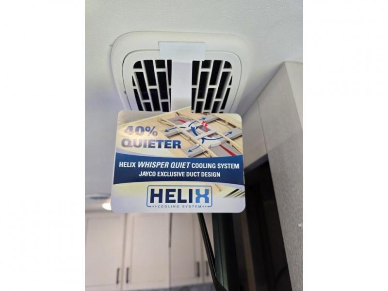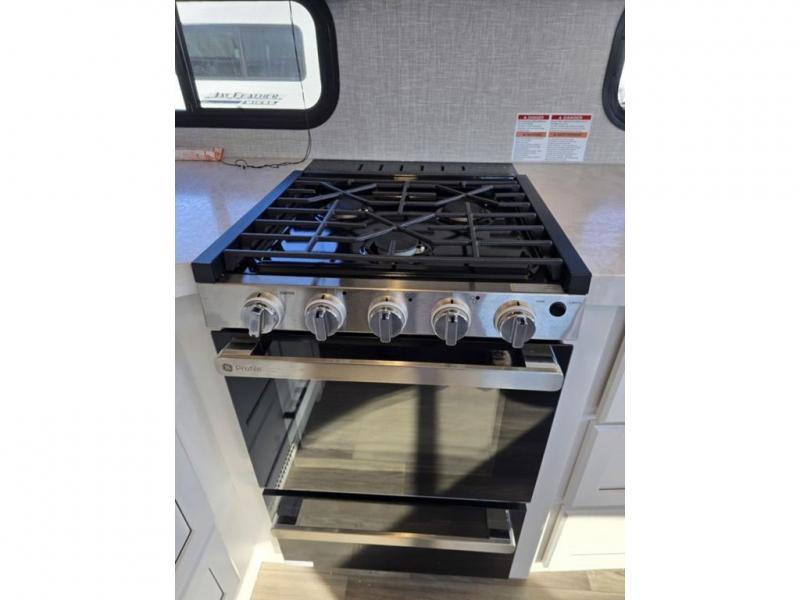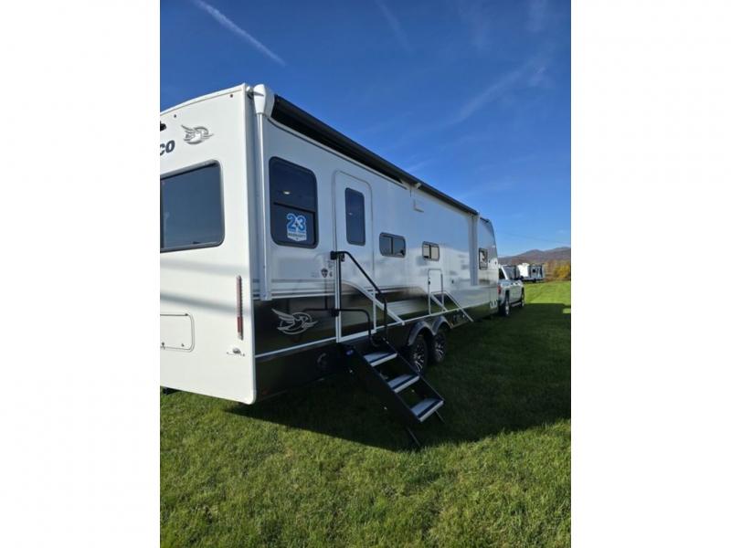 With any Eagle HT fifth wheel or travel trailer by Jayco you will enjoy a smooth drive thanks to the 4 Star Handling Package, Goodyear Endurance tires, and MORryde CRE-3000 rubberized suspension. The Customer Value Package includes amenities that are sure to make camping easier than ever, like the 60K on-demand water heater, Keyed-Alike lock system, 15,000 BTU "Whisper Quiet" A/C, and more. Handcrafted and glazed door/drawer fronts will make your space feel more like home, along with residential vinyl flooring throughout, GE appliances, and blackout roller shades with reflective side throughout to keep the sun out when you want to sleep in. Each model also includes a NuVo H2O water treatment system with filters included, interior and exterior "Blue Sync" audio connect with MB Quart Sound for your TV and phone, and 100% no floor vents for added comfort and convenience!