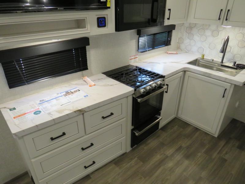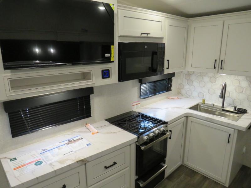With any Eagle HT fifth wheel or travel trailer by Jayco you will enjoy a smooth drive thanks to the 4 Star Handling Package, Goodyear Endurance tires, and MORryde CRE-3000 rubberized suspension. The Customer Value Package includes amenities that are sure to make camping easier than ever, like the 60K on-demand water heater, Keyed-Alike lock system, 15,000 BTU "Whisper Quiet" A/C, and more. Handcrafted and glazed door/drawer fronts will make your space feel more like home, along with residential vinyl flooring throughout, GE appliances, and blackout roller shades with reflective side throughout to keep the sun out when you want to sleep in. Each model also includes a NuVo H2O water treatment system with filters included, interior and exterior "Blue Sync" audio connect with MB Quart Sound for your TV and phone, and 100% no floor vents for added comfort and convenience!