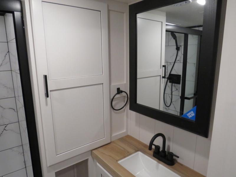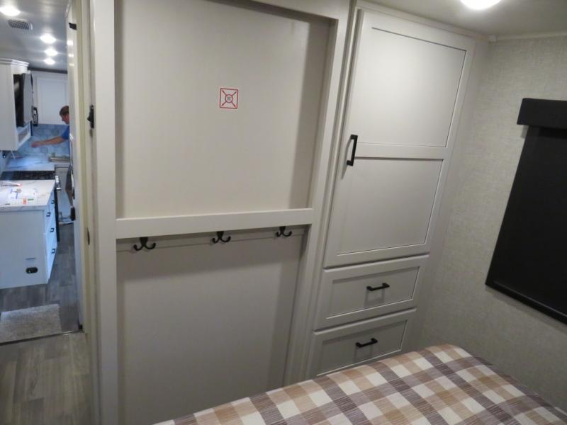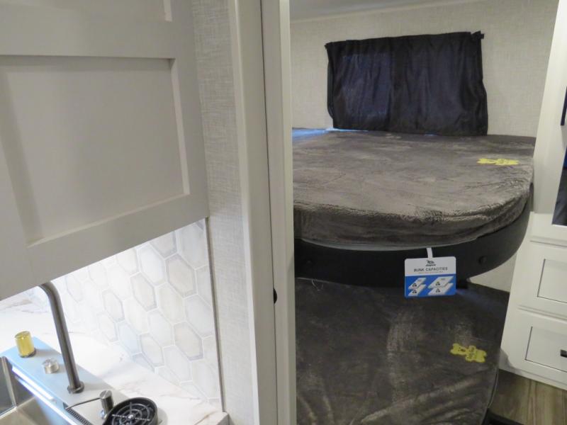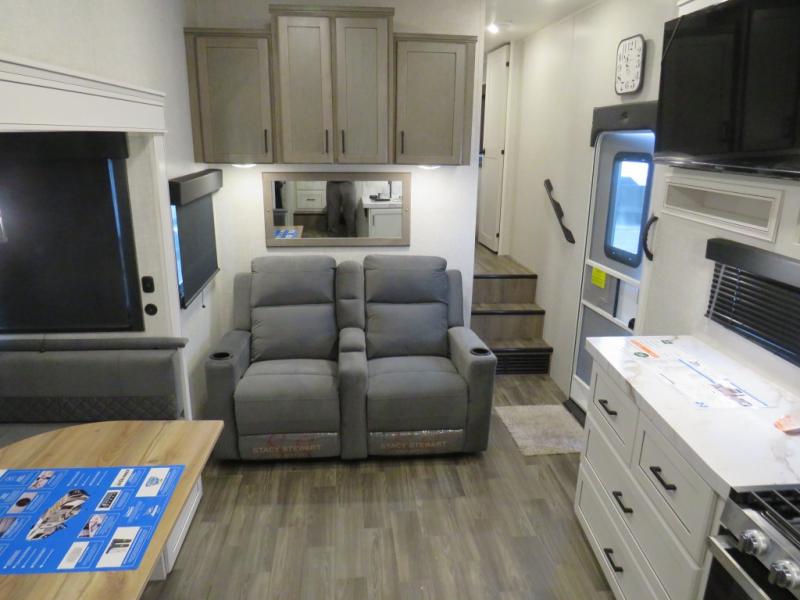 If you're needing a fifth wheel with more sleeping space, this unit will be perfect for you! There are double-size bunks in the back with a wardrobe for your guests' things and TV prep if you want to add a TV here. The front private bedroom up front will have you feeling right at home with its Olympic queen bed and dual wardrobes, and any additional guests you have can sleep on the U-shaped dinette within the slide out. There is also a theater seat here where you can relax with a good book in the evenings.