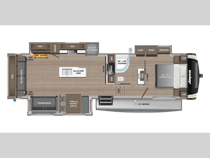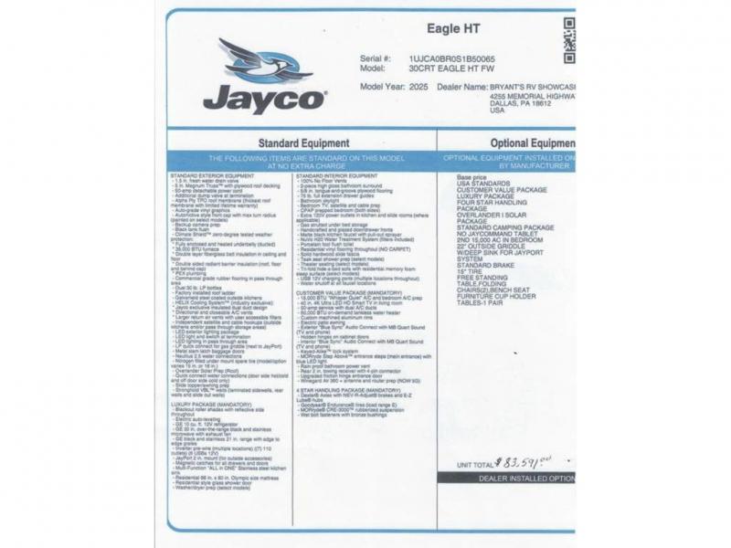 With any Eagle HT fifth wheel or travel trailer by Jayco you will enjoy a smooth drive thanks to the 4 Star Handling Package, Goodyear Endurance tires, and MORryde CRE-3000 rubberized suspension. The Customer Value Package includes amenities that are sure to make camping easier than ever, like the 60K on-demand water heater, Keyed-Alike lock system, 15,000 BTU "Whisper Quiet" A/C, and more. Handcrafted and glazed door/drawer fronts will make your space feel more like home, along with residential vinyl flooring throughout, GE appliances, and blackout roller shades with reflective side throughout to keep the sun out when you want to sleep in. Each model also includes a NuVo H2O water treatment system with filters included, interior and exterior "Blue Sync" audio connect with MB Quart Sound for your TV and phone, and 100% no floor vents for added comfort and convenience!