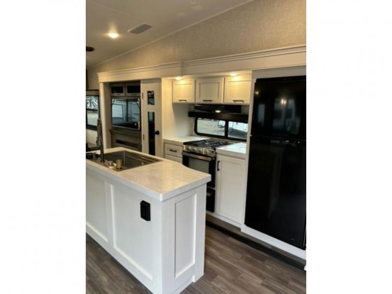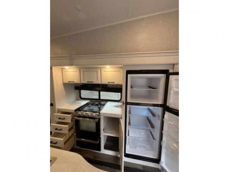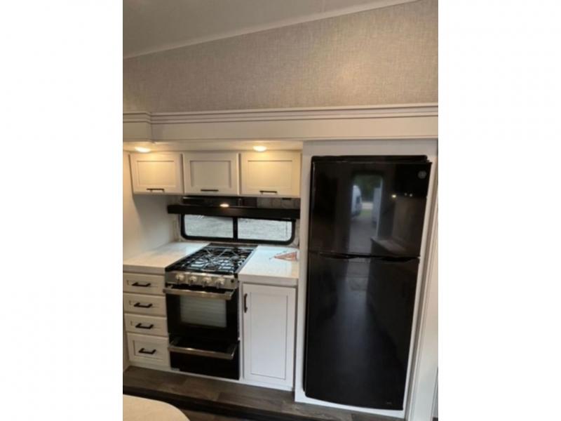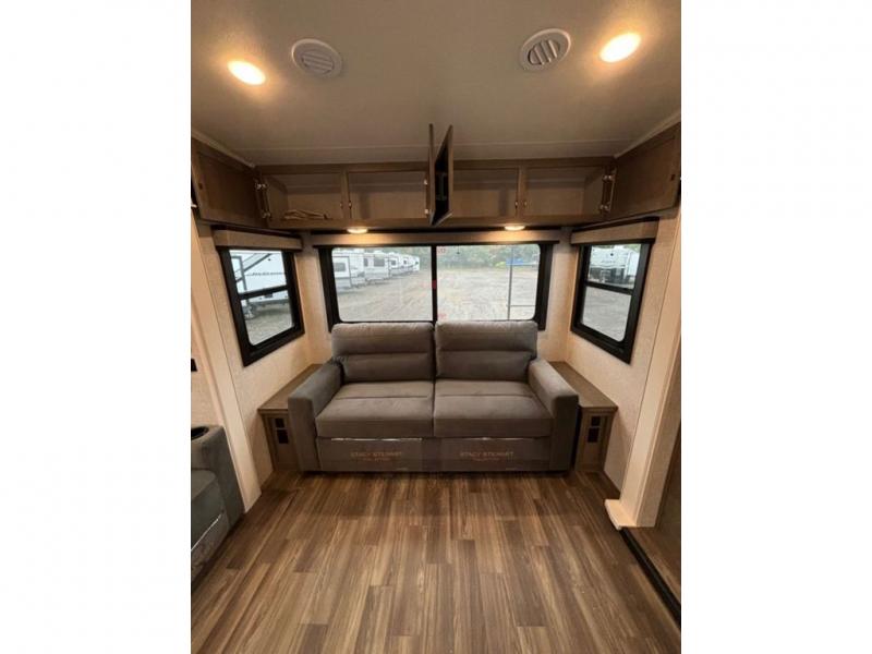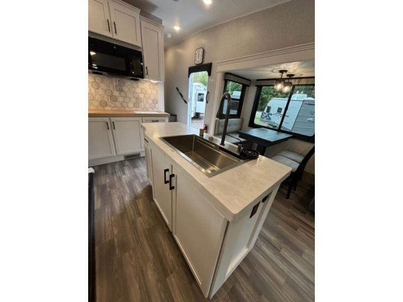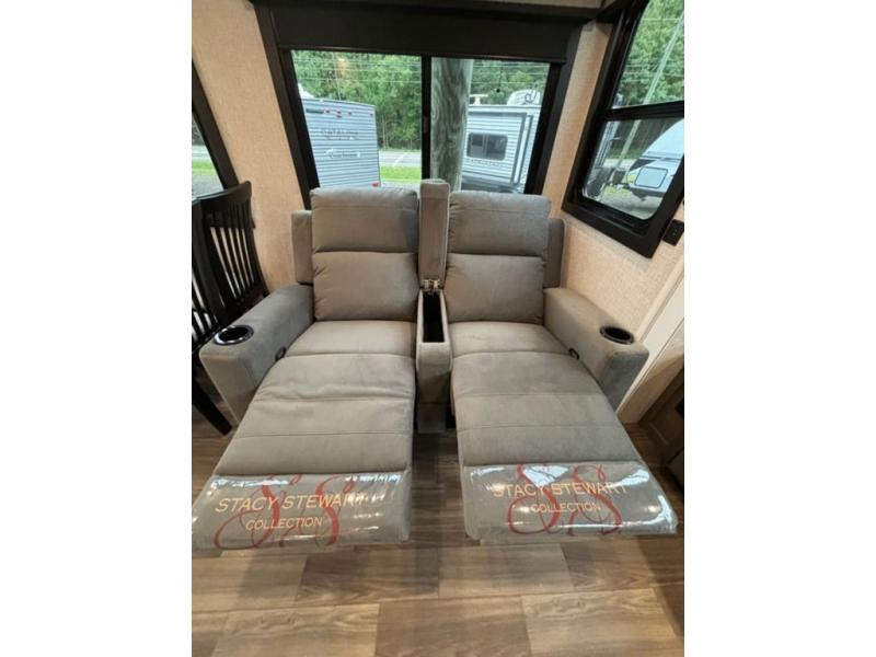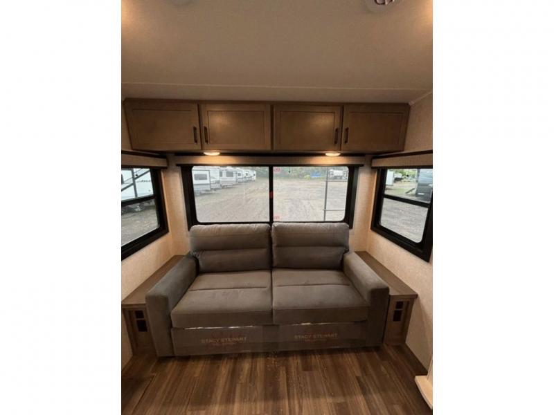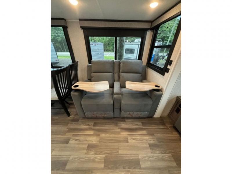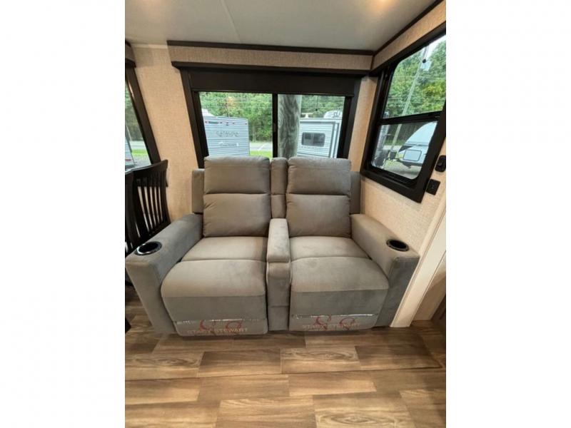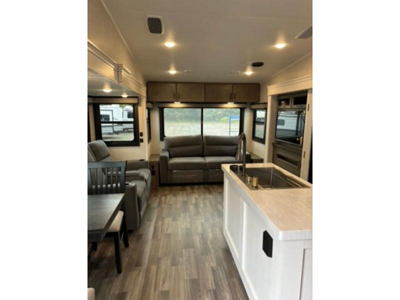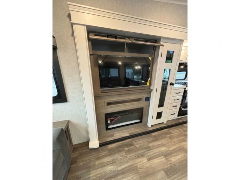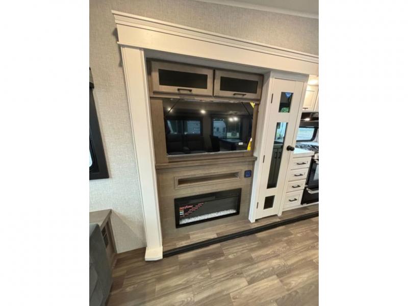 Pack your bags and head off on adventure in this spacious fifth wheel for four! The dual opposing slides in the kitchen and main living area will give your crew more space to relax. Speaking of relaxing, there is a theater seat across from the fireplace and TV plus a tri-fold sofa to make it a movie night. This unit includes a kitchen island with an All-In-One sink for easy cleaning, a hutch with added storage, plus a GE 10 cu. ft. 12V refrigerator. The front master bedroom includes an Olympic queen bed, dual wardrobes plus a third wardrobe within the bedroom slide out, and TV prep if you want the option to watch a show in bed!