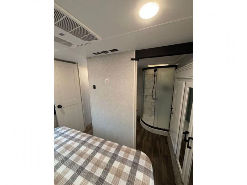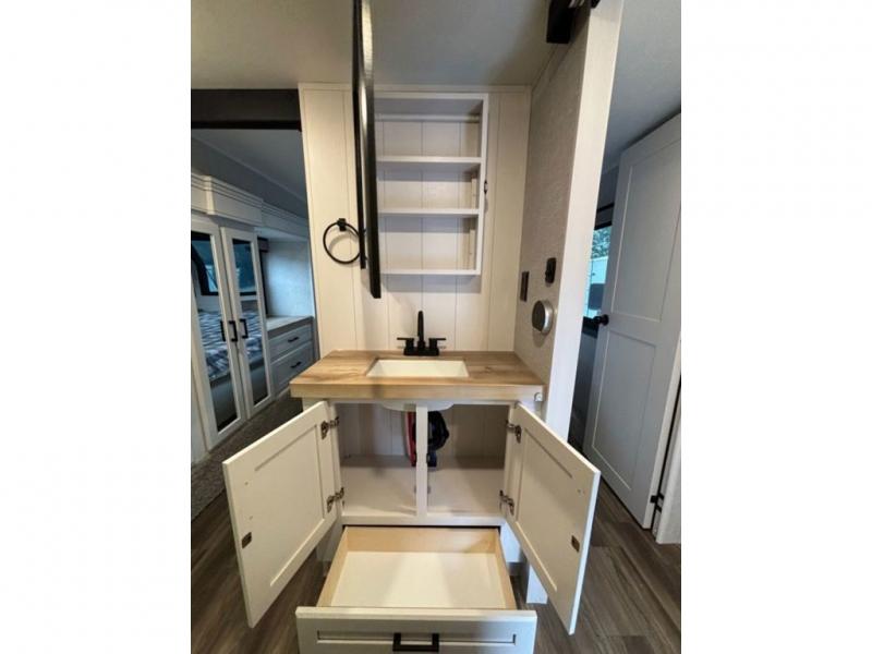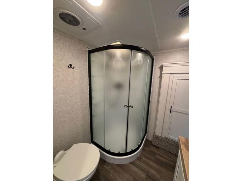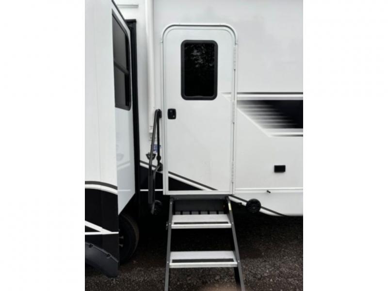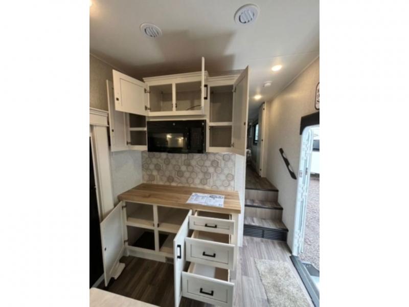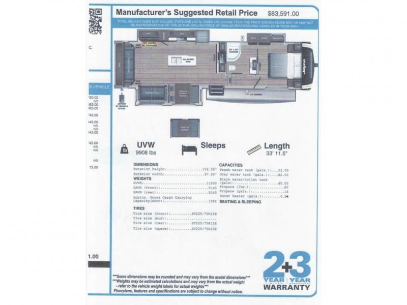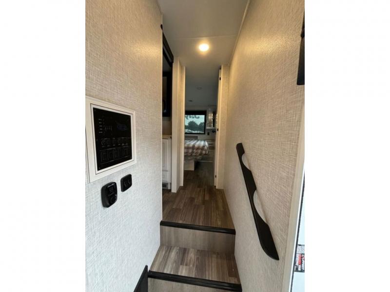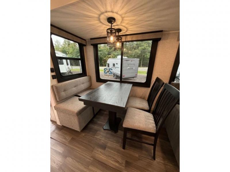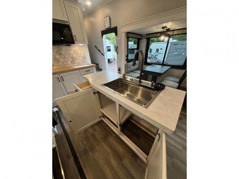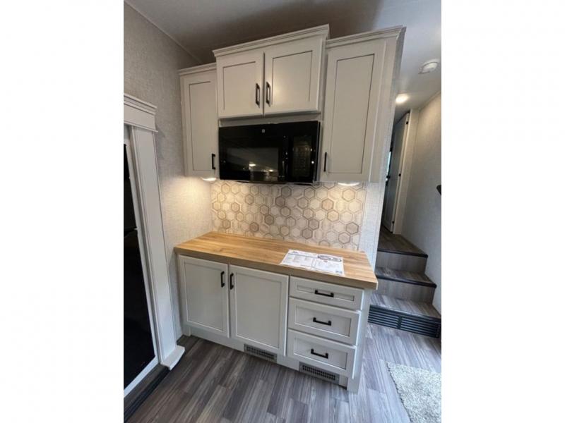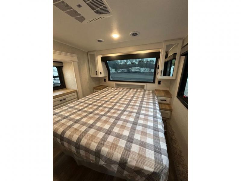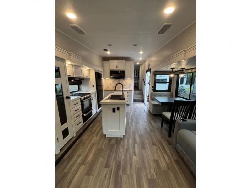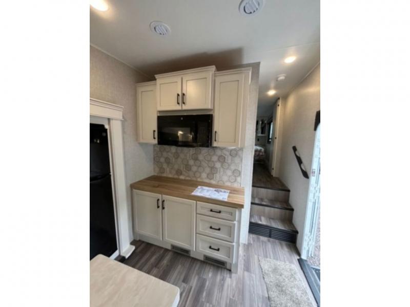 Pack your bags and head off on adventure in this spacious fifth wheel for four! The dual opposing slides in the kitchen and main living area will give your crew more space to relax. Speaking of relaxing, there is a theater seat across from the fireplace and TV plus a tri-fold sofa to make it a movie night. This unit includes a kitchen island with an All-In-One sink for easy cleaning, a hutch with added storage, plus a GE 10 cu. ft. 12V refrigerator. The front master bedroom includes an Olympic queen bed, dual wardrobes plus a third wardrobe within the bedroom slide out, and TV prep if you want the option to watch a show in bed!