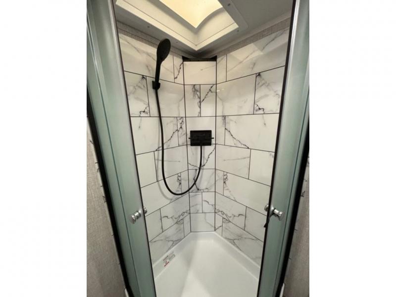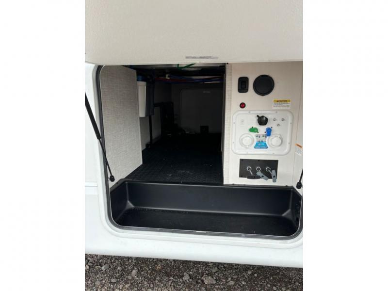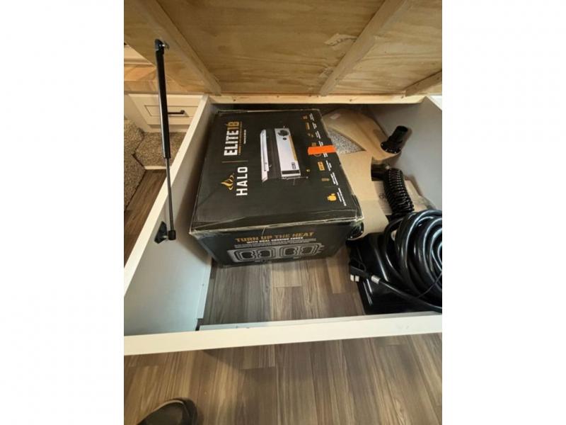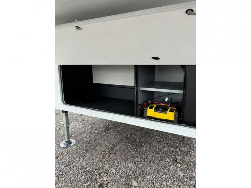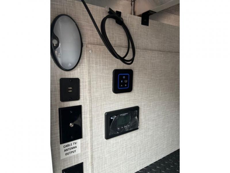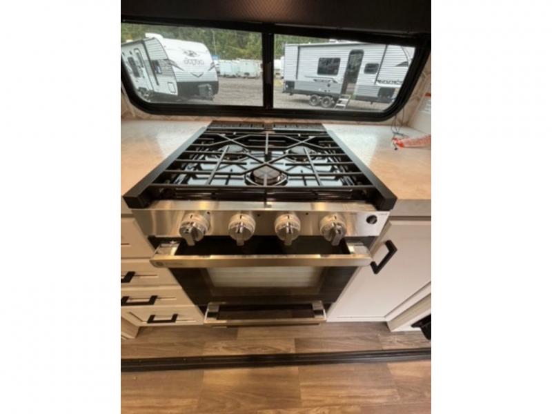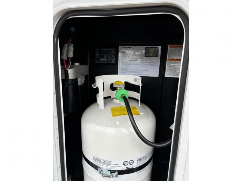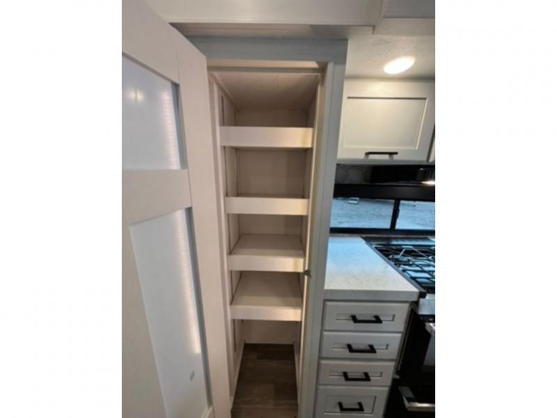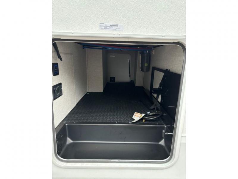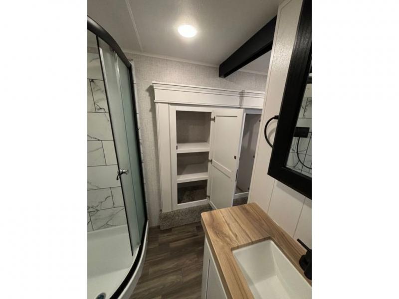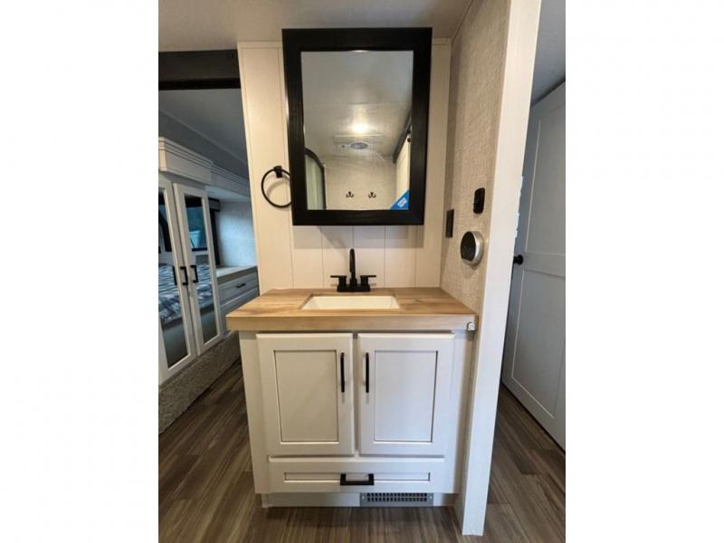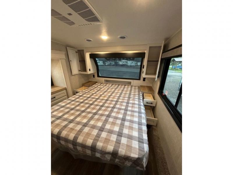 Pack your bags and head off on adventure in this spacious fifth wheel for four! The dual opposing slides in the kitchen and main living area will give your crew more space to relax. Speaking of relaxing, there is a theater seat across from the fireplace and TV plus a tri-fold sofa to make it a movie night. This unit includes a kitchen island with an All-In-One sink for easy cleaning, a hutch with added storage, plus a GE 10 cu. ft. 12V refrigerator. The front master bedroom includes an Olympic queen bed, dual wardrobes plus a third wardrobe within the bedroom slide out, and TV prep if you want the option to watch a show in bed!