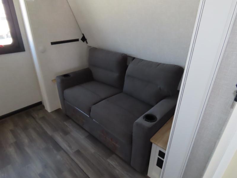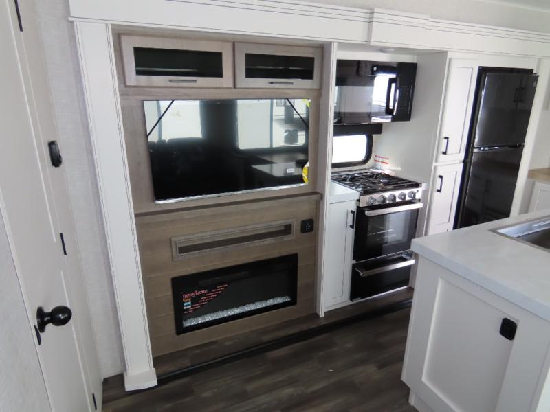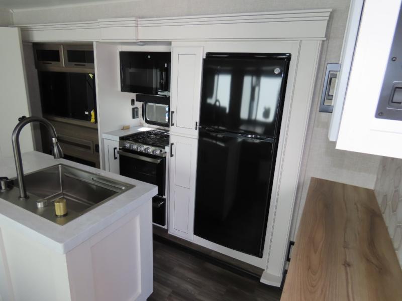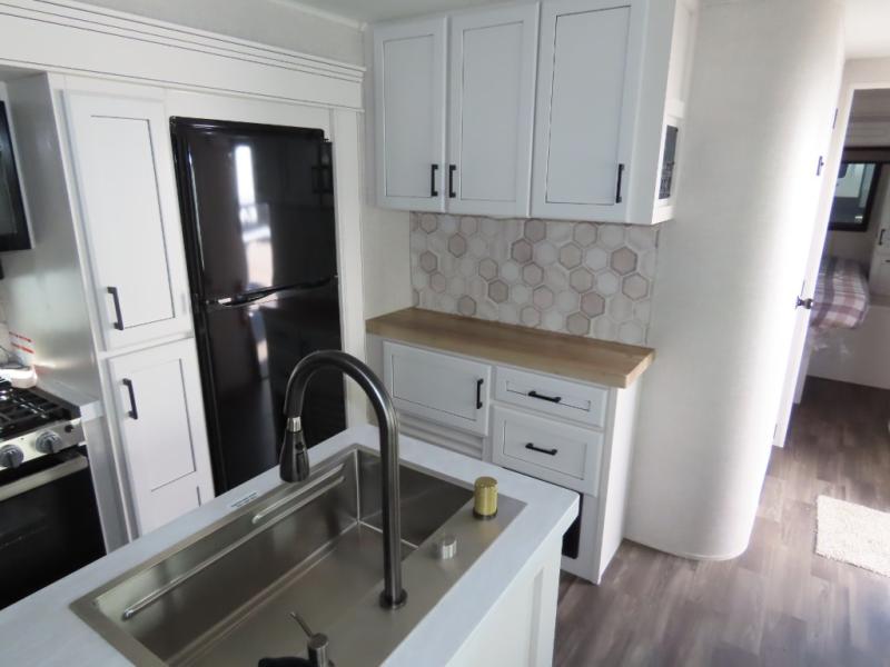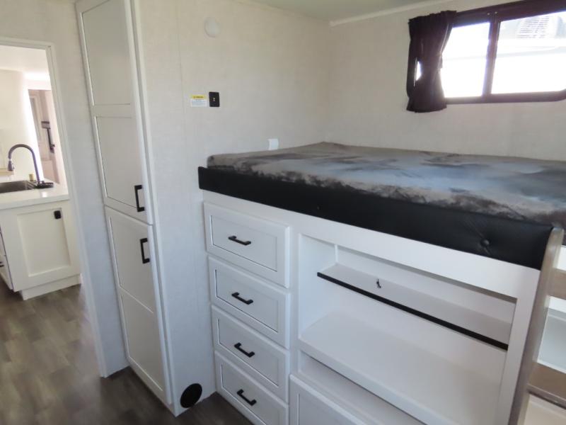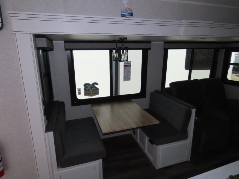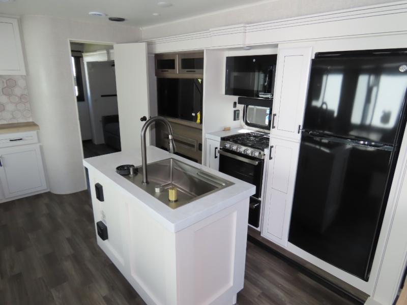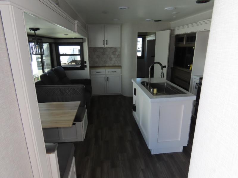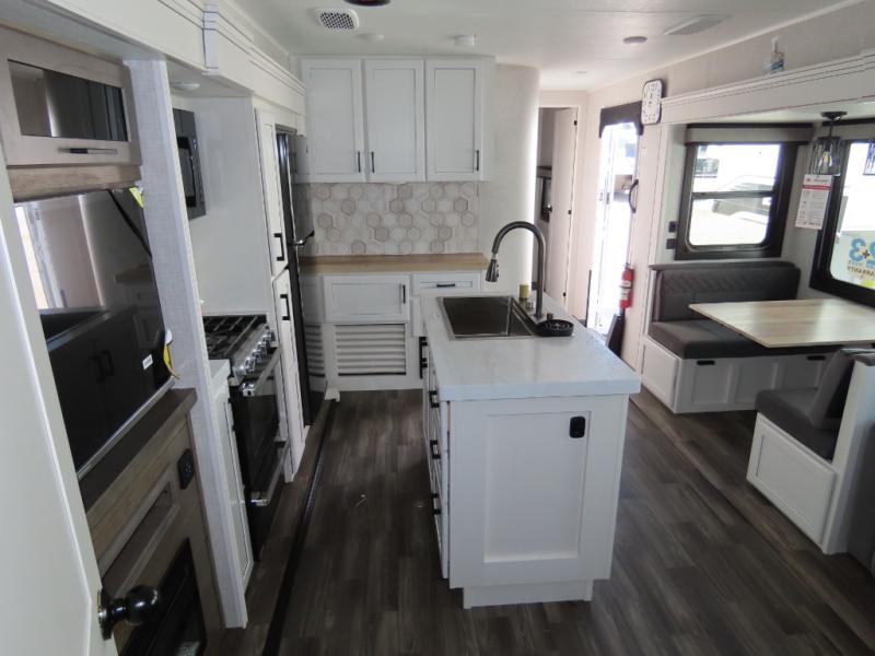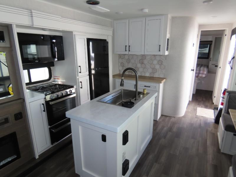 This travel trailer is perfect for your larger group or family! There is a rear private bunkhouse with two bunks, a tri-fold sofa, plus a slide out for more space. You will have the front private bedroom all to yourselves with a queen bed, and any other guests can sleep on the tri-fold sofa and booth dinette! There is also a wardrobe/linen closet with washer and dryer prep if you plan to add a washer and dyer for convenience. The chef can prepare their best meals with the kitchen island and will enjoy having two hutches to store the essentials. They could even cook at the outside kitchen to breathe in some fresh air and enjoy the beautiful scenery!