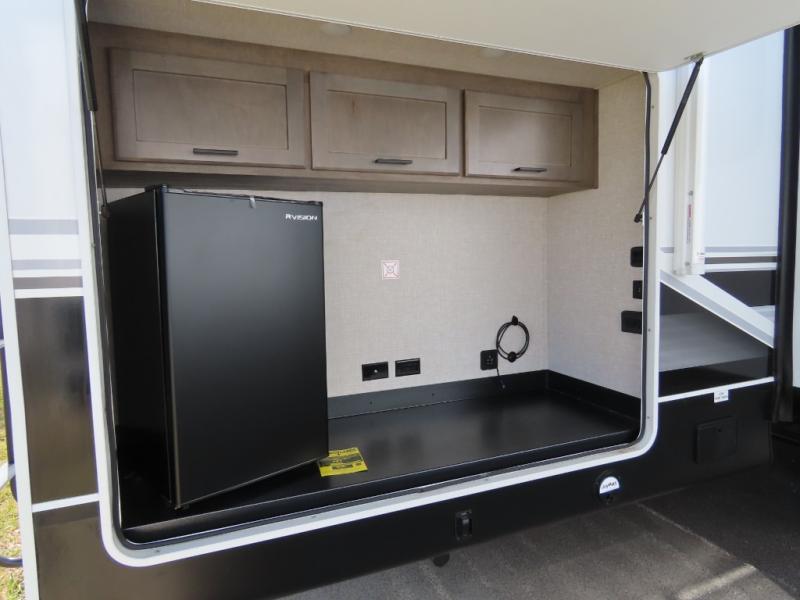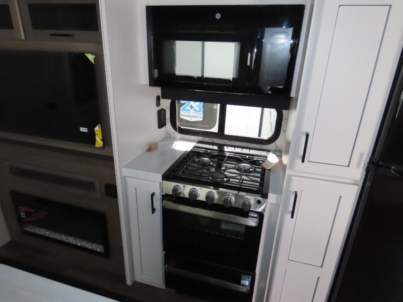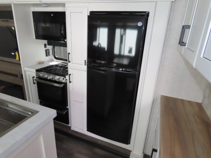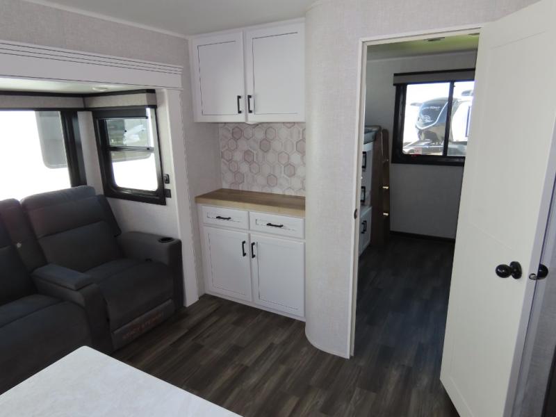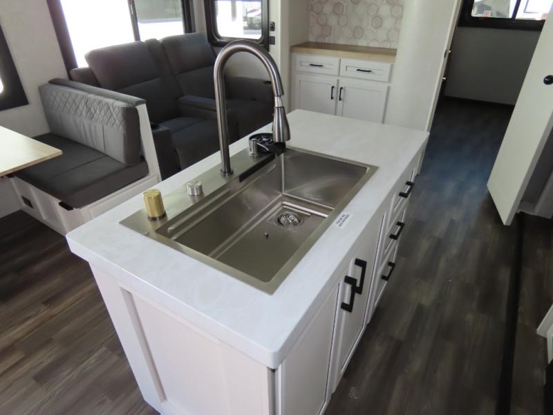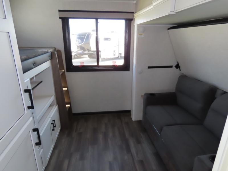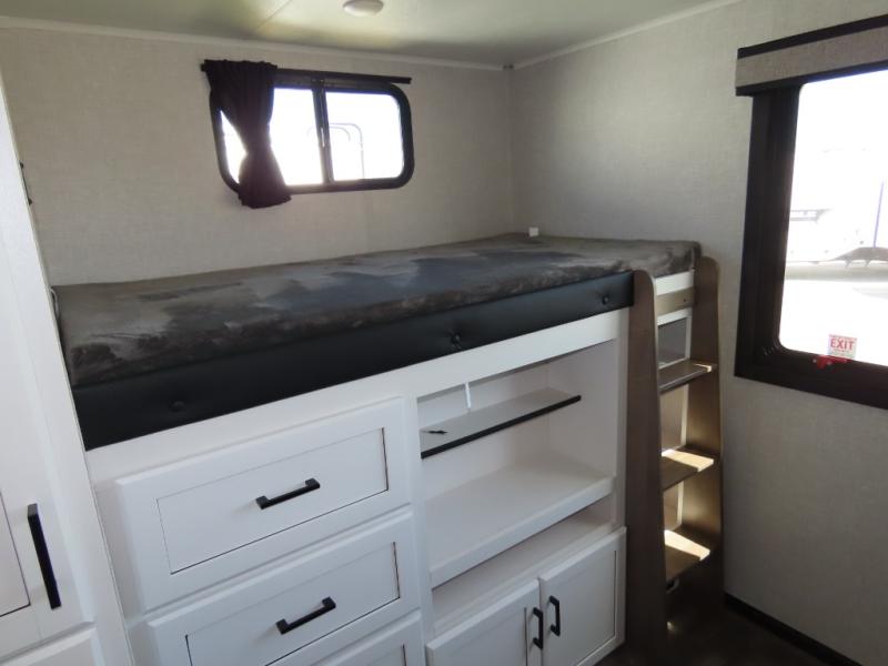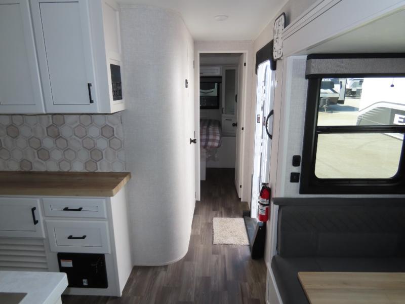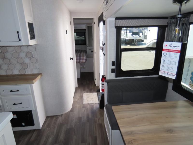This travel trailer is perfect for your larger group or family! There is a rear private bunkhouse with two bunks, a tri-fold sofa, plus a slide out for more space. You will have the front private bedroom all to yourselves with a queen bed, and any other guests can sleep on the tri-fold sofa and booth dinette! There is also a wardrobe/linen closet with washer and dryer prep if you plan to add a washer and dyer for convenience. The chef can prepare their best meals with the kitchen island and will enjoy having two hutches to store the essentials. They could even cook at the outside kitchen to breathe in some fresh air and enjoy the beautiful scenery!