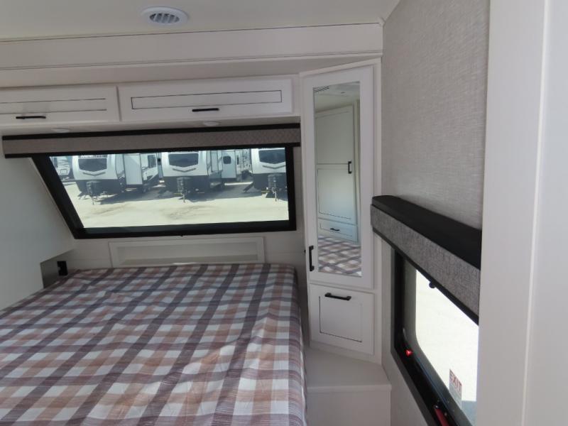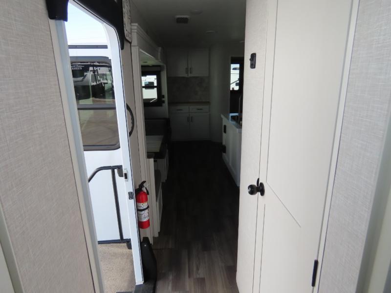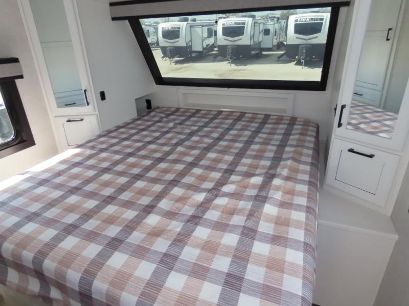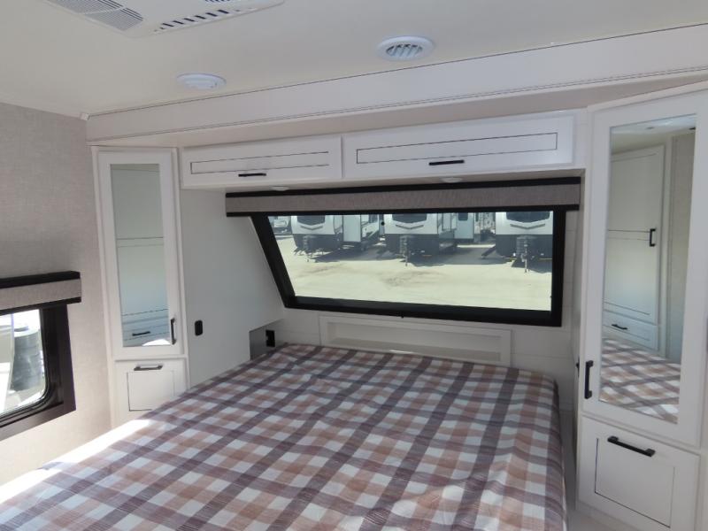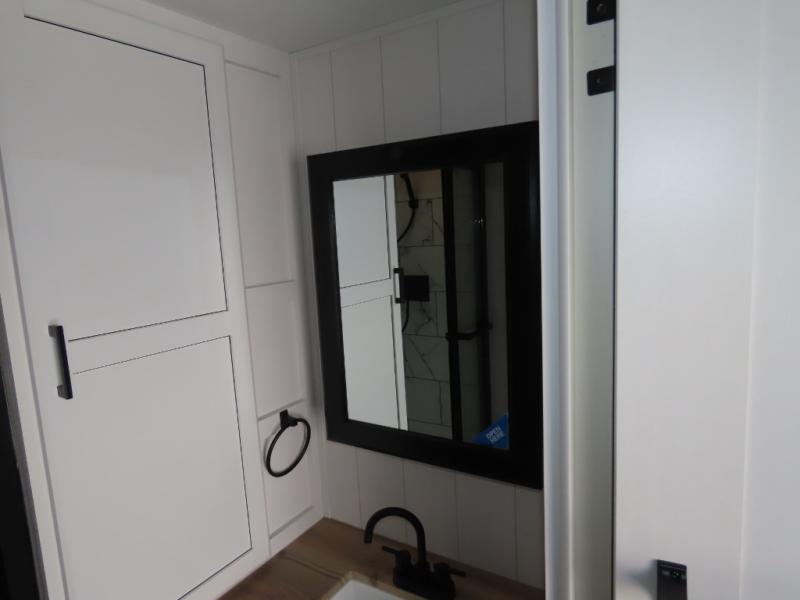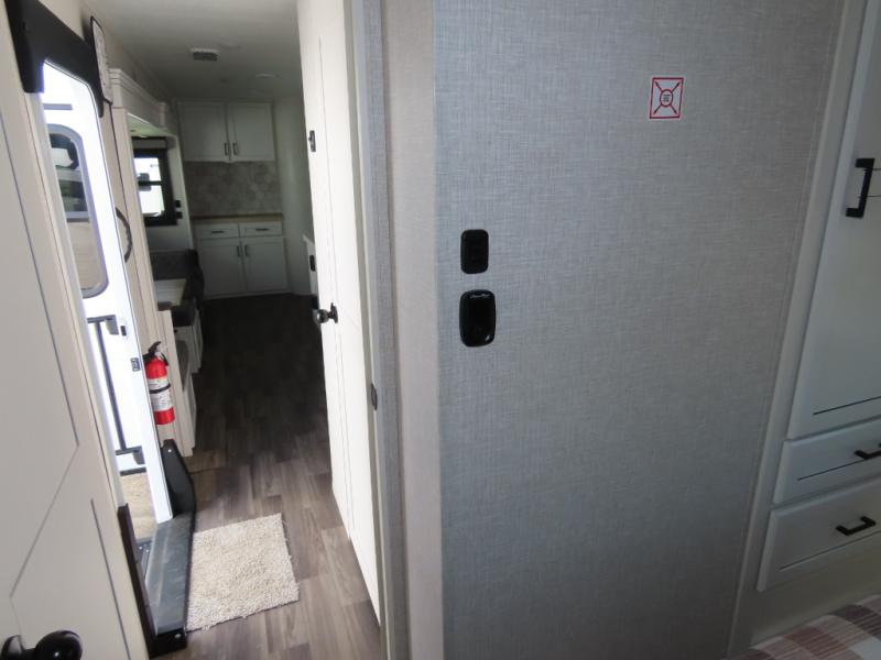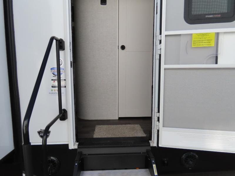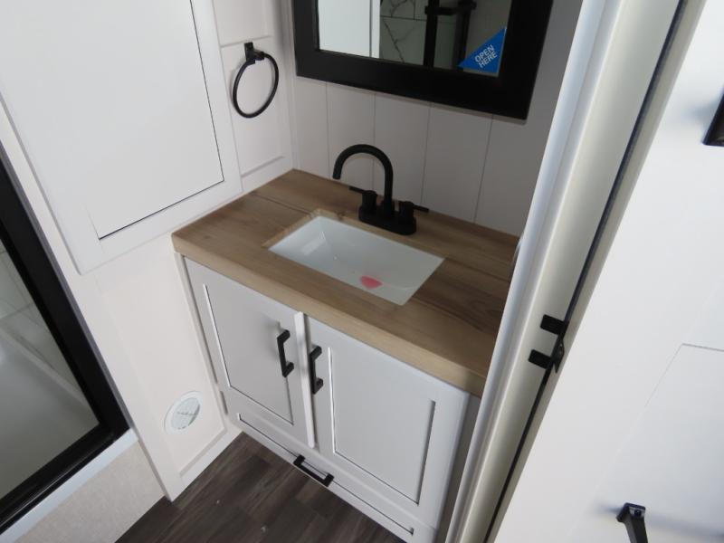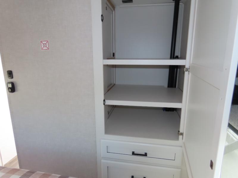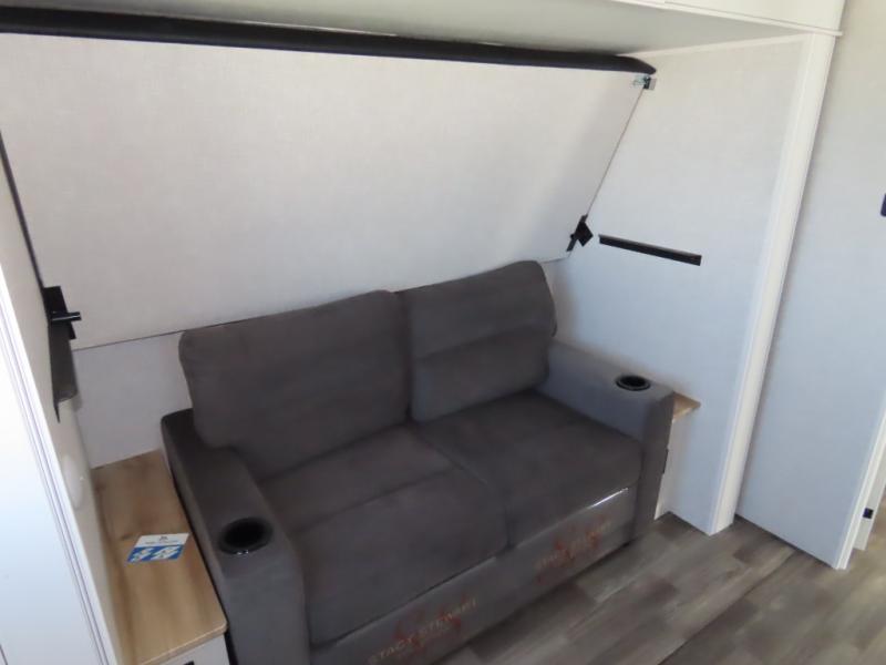This travel trailer is perfect for your larger group or family! There is a rear private bunkhouse with two bunks, a tri-fold sofa, plus a slide out for more space. You will have the front private bedroom all to yourselves with a queen bed, and any other guests can sleep on the tri-fold sofa and booth dinette! There is also a wardrobe/linen closet with washer and dryer prep if you plan to add a washer and dyer for convenience. The chef can prepare their best meals with the kitchen island and will enjoy having two hutches to store the essentials. They could even cook at the outside kitchen to breathe in some fresh air and enjoy the beautiful scenery!