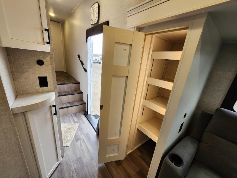 You can't go wrong with this fifth wheel in tow! Once you've unloaded the pass-through storage, you can put out the 19' electric awning and relax in your camp chairs. There is an outside kitchen to cook lunch on, and the fully-equipped kitchen inside lets you cook indoors when the weather isn't cooperating. A rear booth dinette provides a place to play games, and a theater sofa across from the TV and fireplace will be the perfect place to relax with a movie. Your guests can sleep in the middle bunkhouse that includes a tri-fold sofa with a flip-top bunk, a dresser, plus TV prep if you want to add a television here! You'll enjoy your own space up front in the private bedroom that includes an Olympic queen bed, dual wardrobes plus a third wardrobe with washer and dryer prep!
