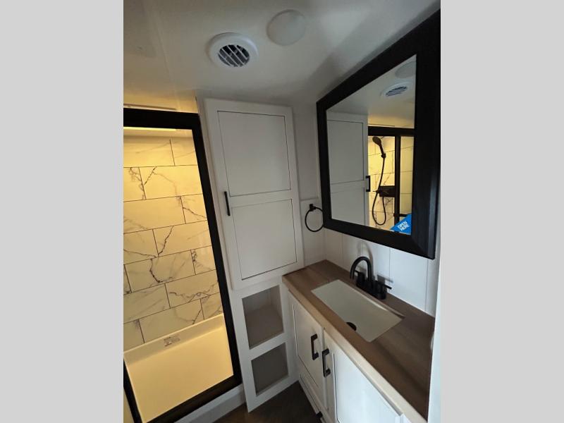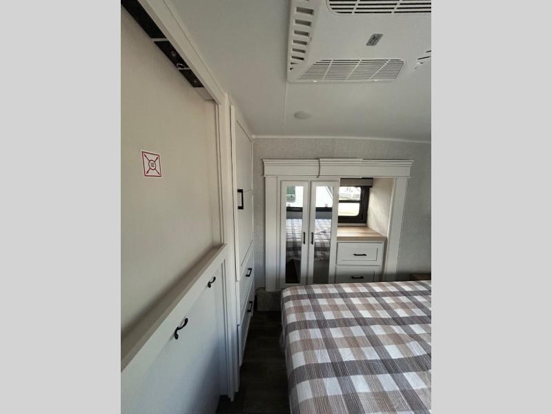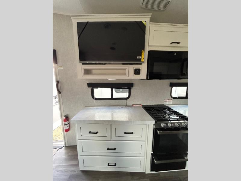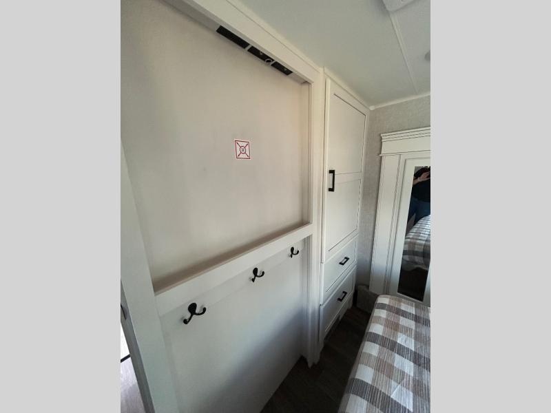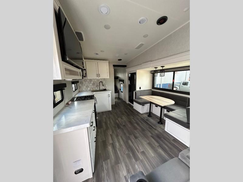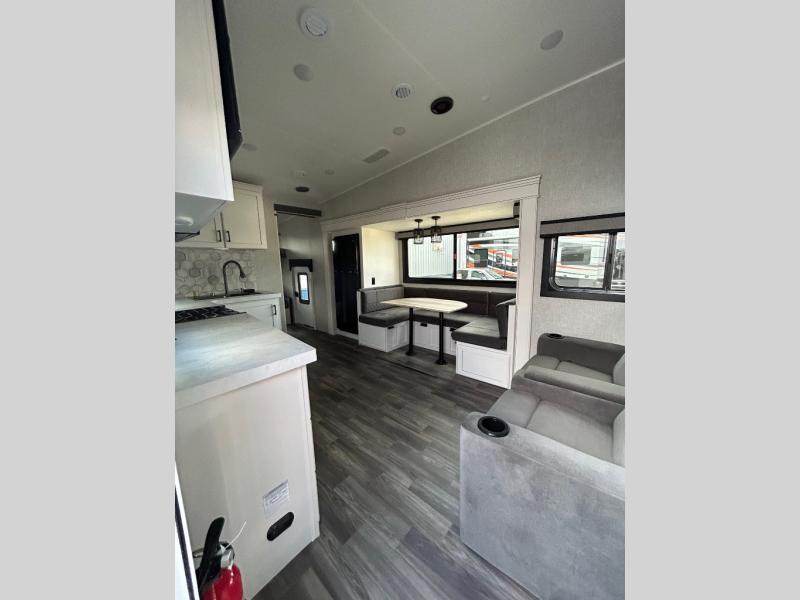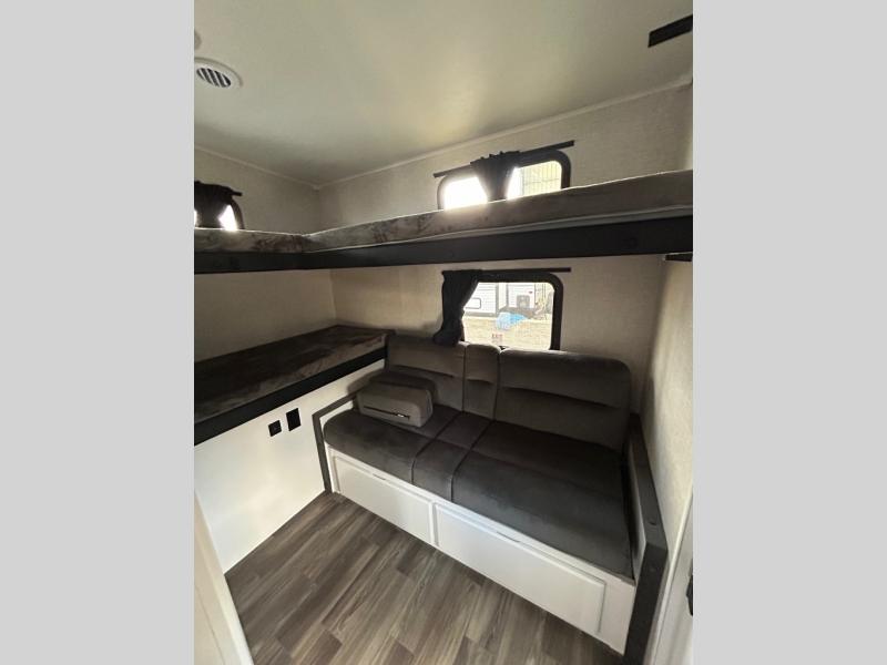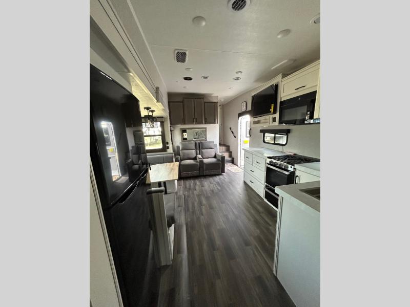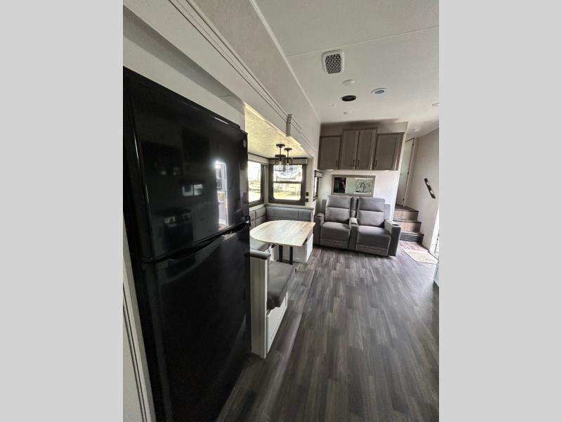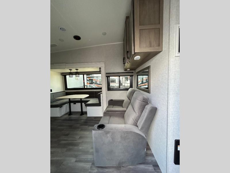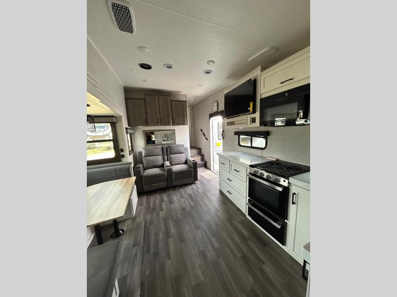 This fifth wheel is not only packed with amenities, but it can sleep up to eight people each night for fun camping trips! The rear private bunkhouse includes bunk beds plus a third bunk above a jack-knife sofa, and there is a bike storage door here so you can easily pack in gear. You can claim the front private bedroom all to yourselves with an Olympic bed, a wardrobe slide plus a second wardrobe with washer and dryer prep. Everyone can come together in the combined kitchen and living room that features a U-shaped dinette across from the TV and a theater seat for added comfort!