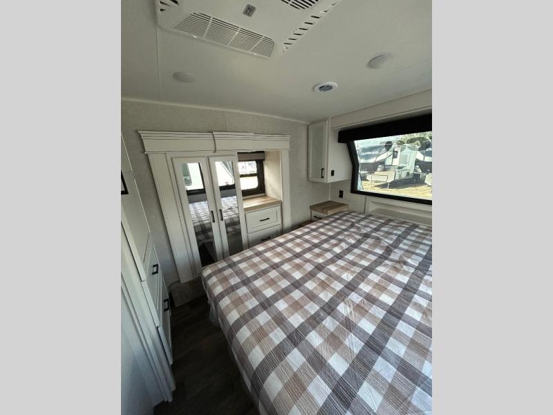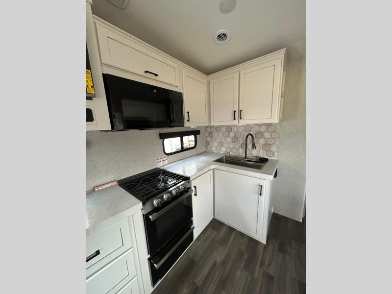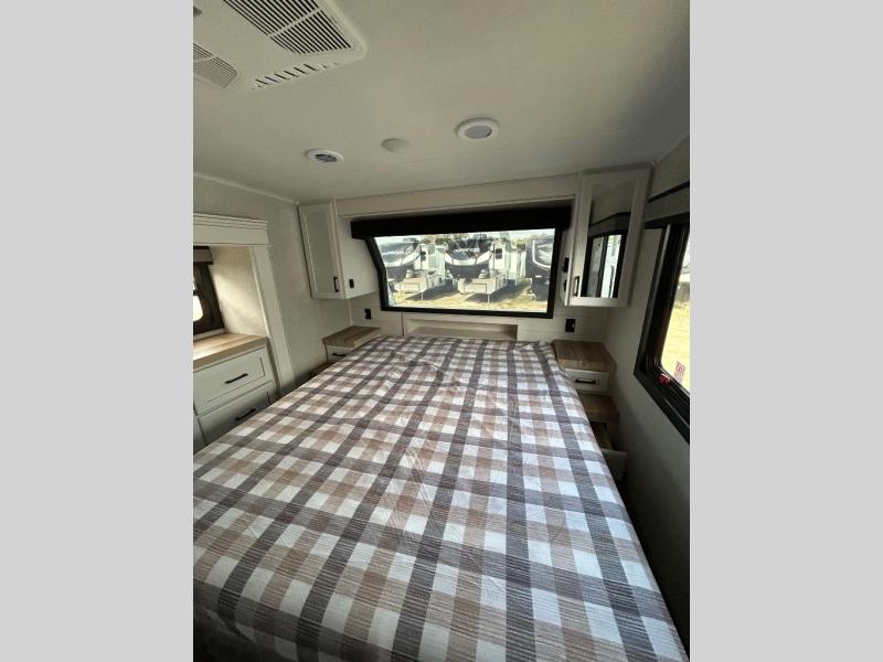 With any Eagle HT fifth wheel or travel trailer by Jayco you will enjoy a smooth drive thanks to the 4 Star Handling Package, Goodyear Endurance tires, and MORryde CRE-3000 rubberized suspension. The Customer Value Package includes amenities that are sure to make camping easier than ever, like the 60K on-demand water heater, Keyed-Alike lock system, 15,000 BTU "Whisper Quiet" A/C, and more. Handcrafted and glazed door/drawer fronts will make your space feel more like home, along with residential vinyl flooring throughout, GE appliances, and blackout roller shades with reflective side throughout to keep the sun out when you want to sleep in. Each model also includes a NuVo H2O water treatment system with filters included, interior and exterior "Blue Sync" audio connect with MB Quart Sound for your TV and phone, and 100% no floor vents for added comfort and convenience!