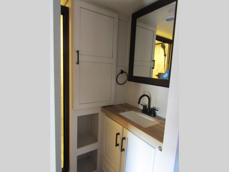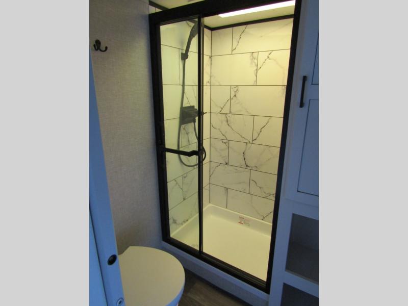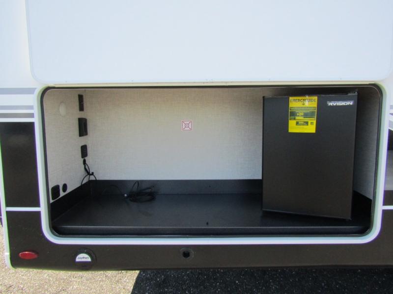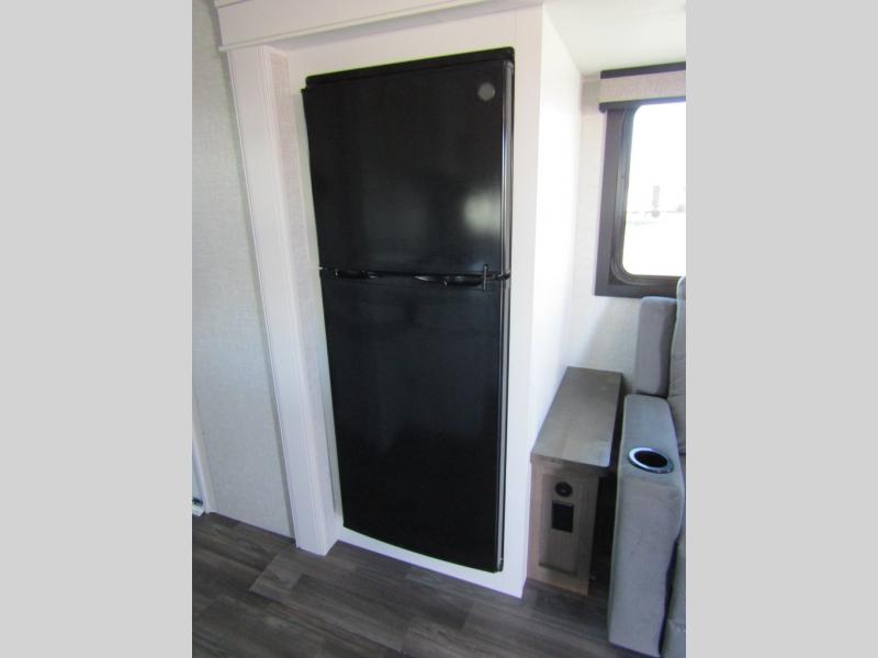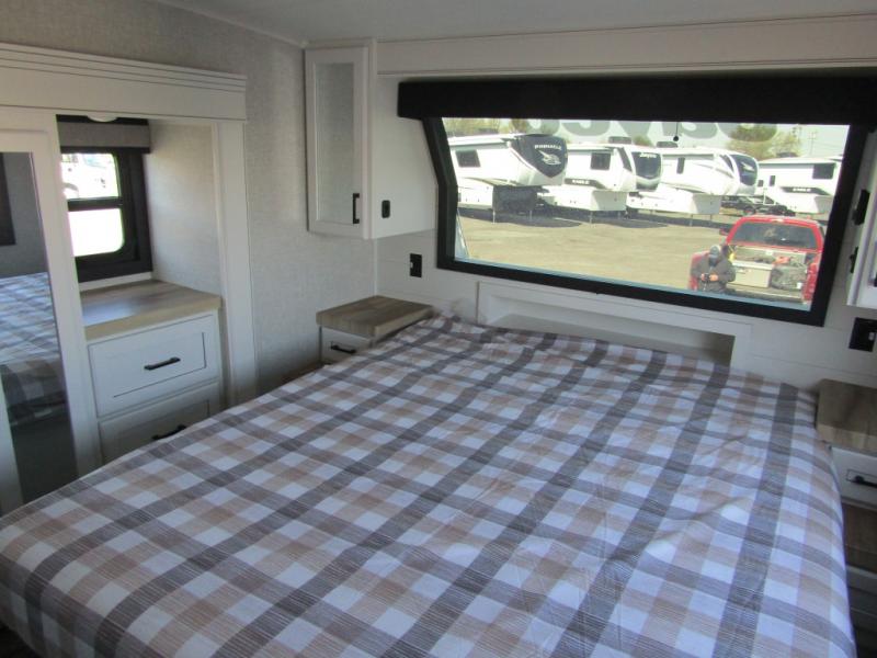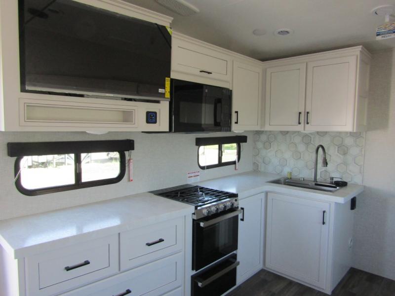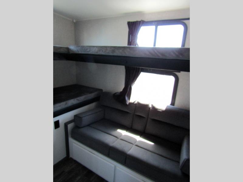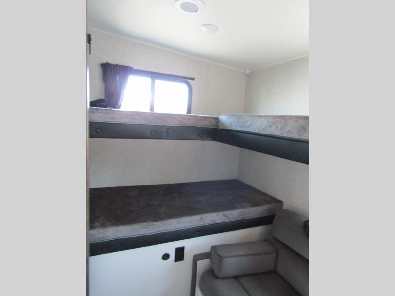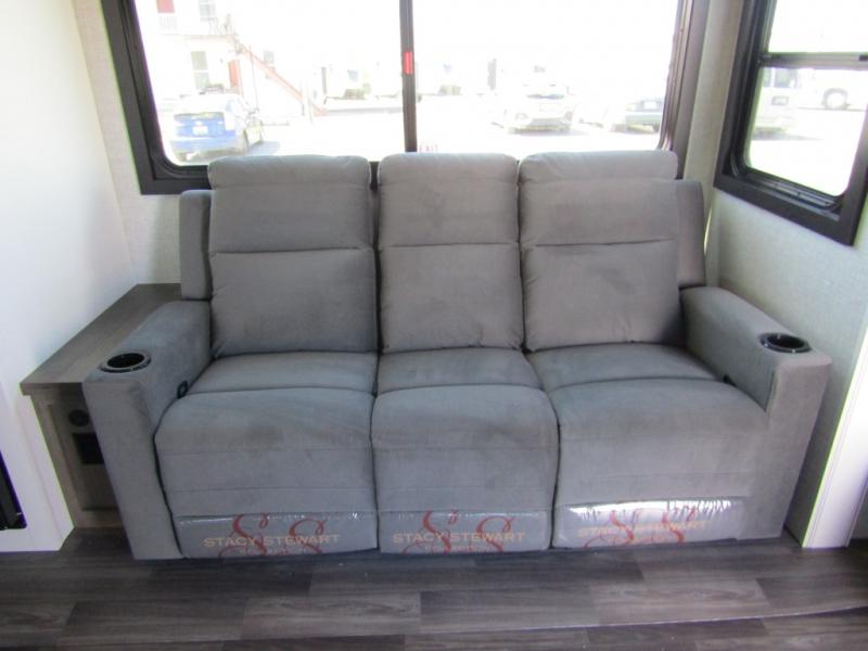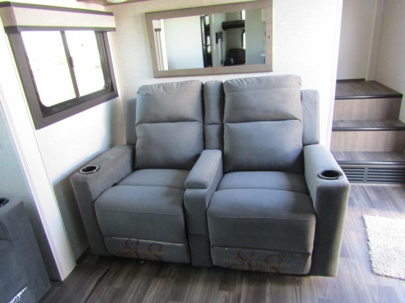 This fifth wheel is not only packed with amenities, but it can sleep up to eight people each night for fun camping trips! The rear private bunkhouse includes bunk beds plus a third bunk above a jack-knife sofa, and there is a bike storage door here so you can easily pack in gear. You can claim the front private bedroom all to yourselves with an Olympic bed, a wardrobe slide plus a second wardrobe with washer and dryer prep. Everyone can come together in the combined kitchen and living room that features a U-shaped dinette across from the TV and a theater seat for added comfort!