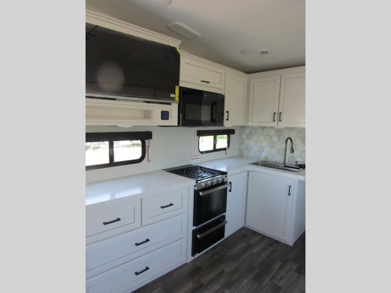 With any Eagle HT fifth wheel or travel trailer by Jayco you will enjoy a smooth drive thanks to the 4 Star Handling Package, Goodyear Endurance tires, and MORryde CRE-3000 rubberized suspension. The Customer Value Package includes amenities that are sure to make camping easier than ever, like the 60K on-demand water heater, Keyed-Alike lock system, 15,000 BTU "Whisper Quiet" A/C, and more. Handcrafted and glazed door/drawer fronts will make your space feel more like home, along with residential vinyl flooring throughout, GE appliances, and blackout roller shades with reflective side throughout to keep the sun out when you want to sleep in. Each model also includes a NuVo H2O water treatment system with filters included, interior and exterior "Blue Sync" audio connect with MB Quart Sound for your TV and phone, and 100% no floor vents for added comfort and convenience!