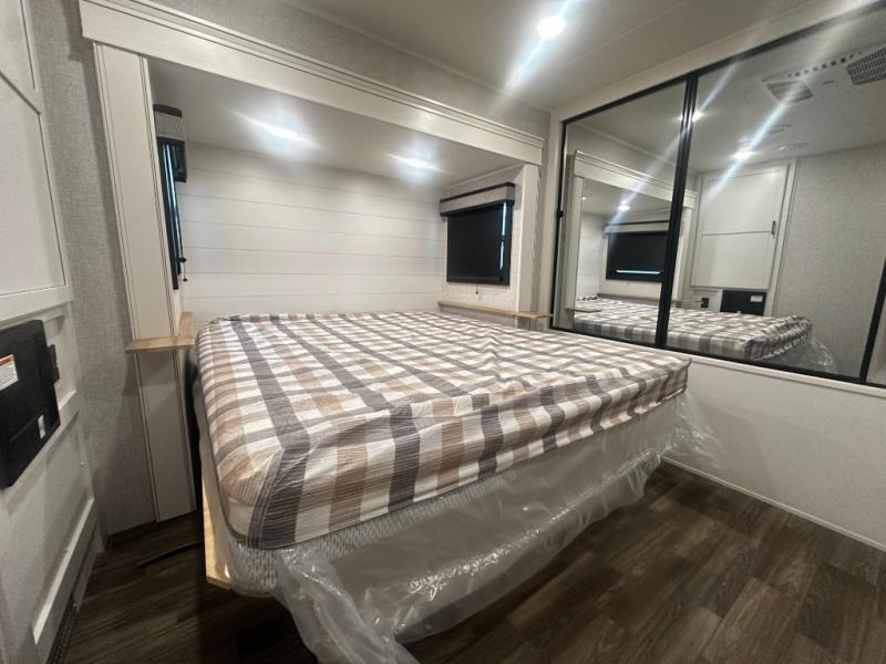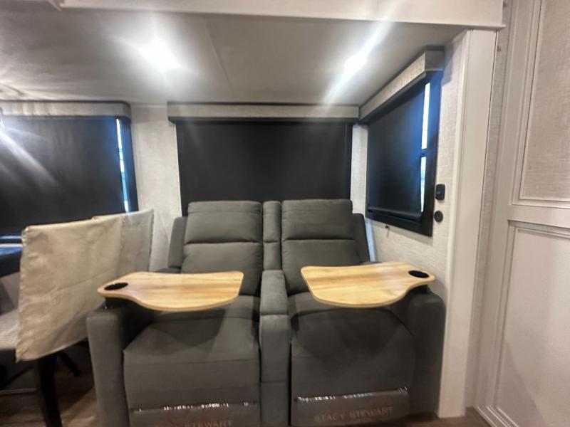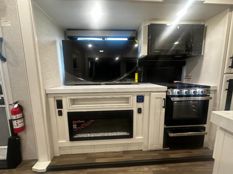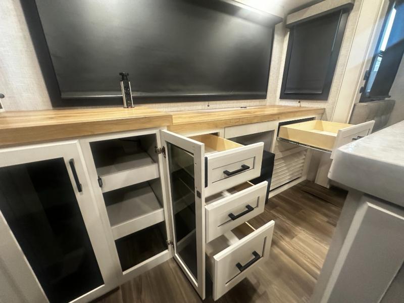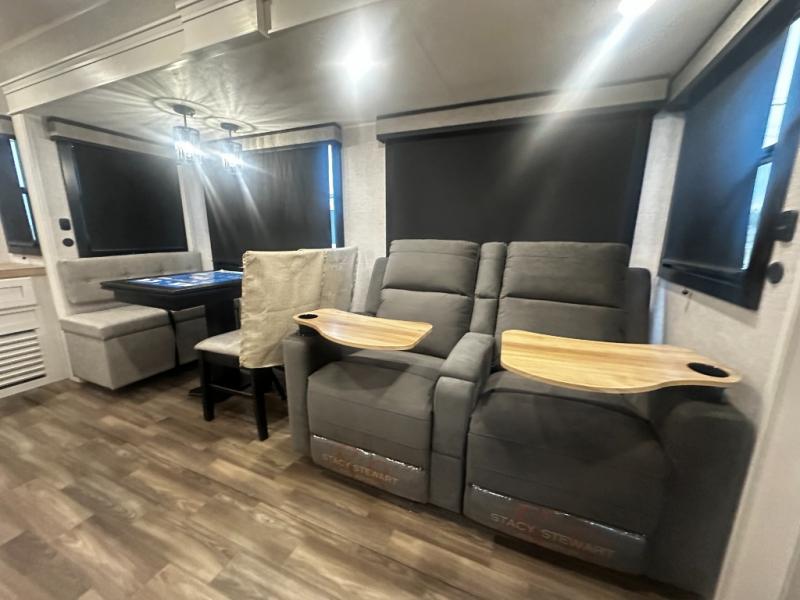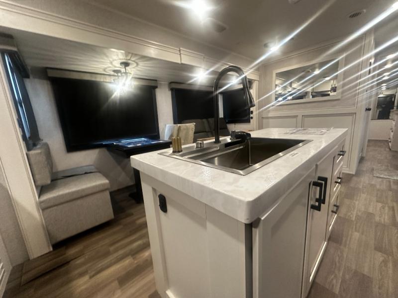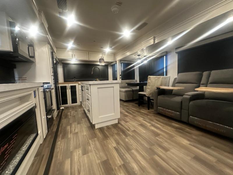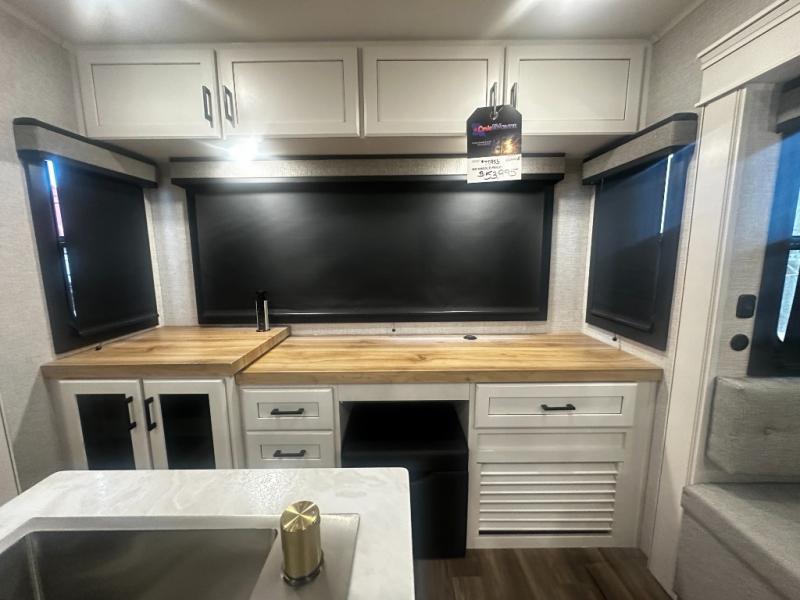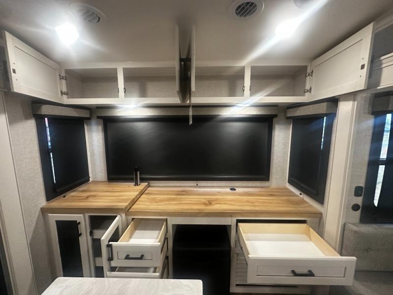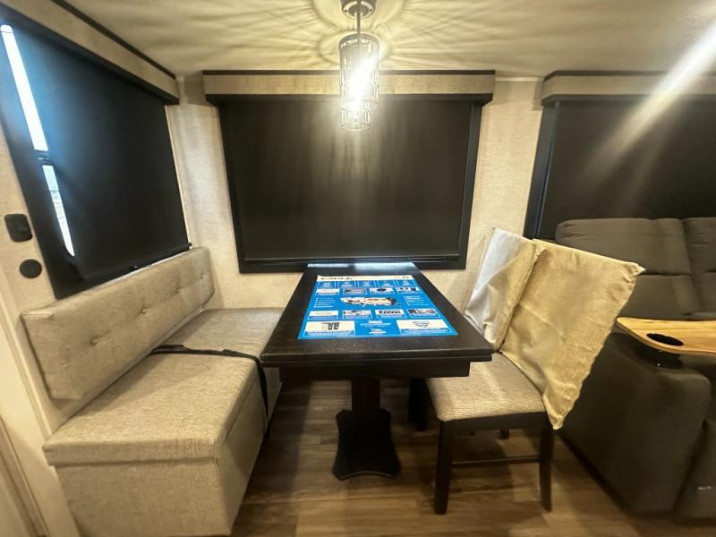 You will feel right at home camping in this travel trailer! It features a front private bedroom with an Olympic queen bed slide for more interior space, a dresser, a front wardrobe to hang your clothes, and a wardrobe with washer and dryer prep. Start each morning getting squeaky clean in the full bathroom with the shower, then head to the kitchen to fry up some eggs on the stainless steel range. The kitchen island provides more counter space to prep meals, and there are two pantries for dry goods and snacks. There is also a table and chairs with a bench seat plus a tri-fold sofa within the large slide out. And a desk with a bench seat lets you get some work done!