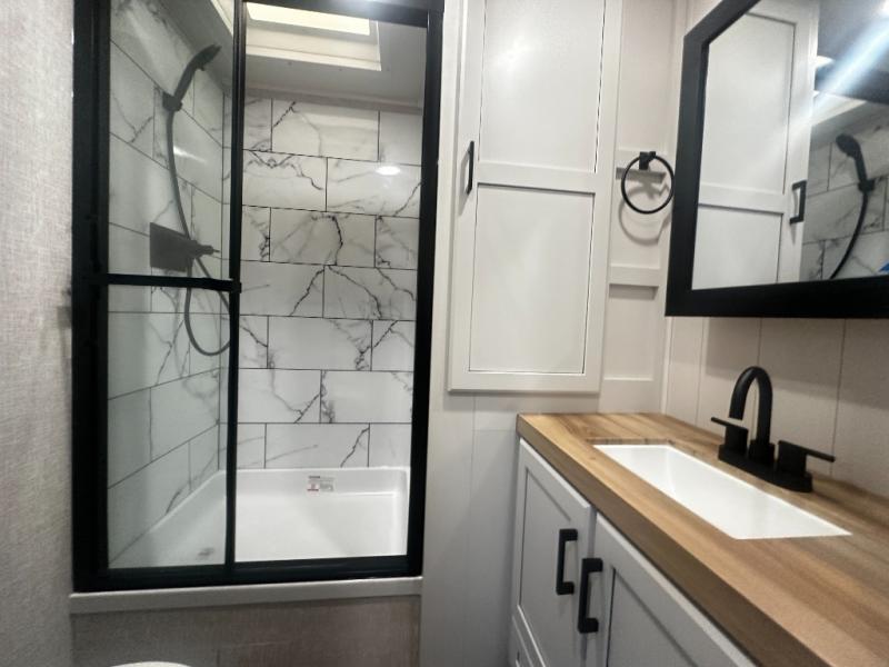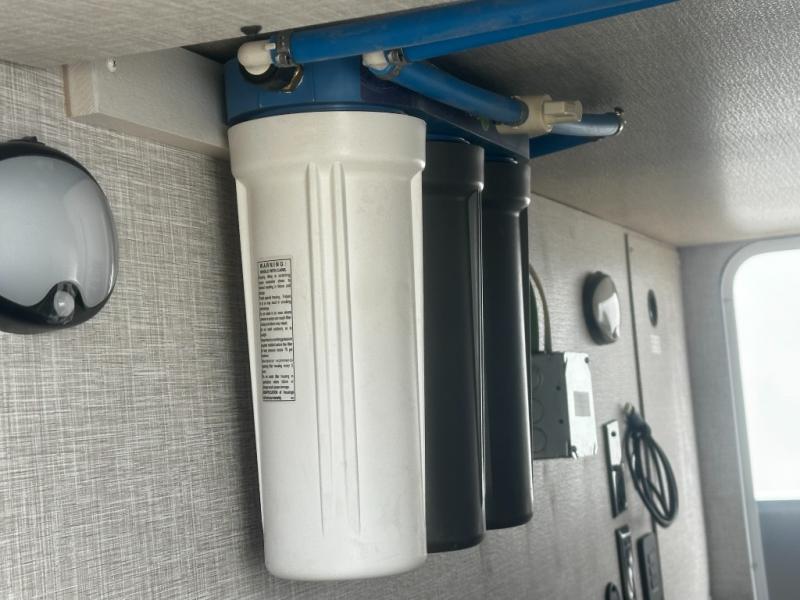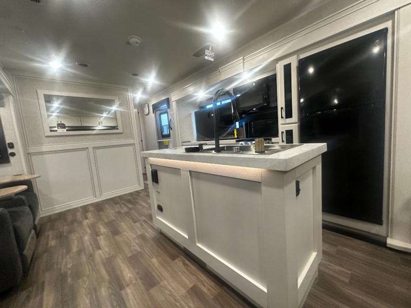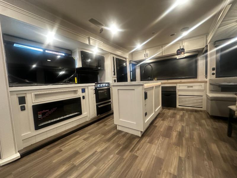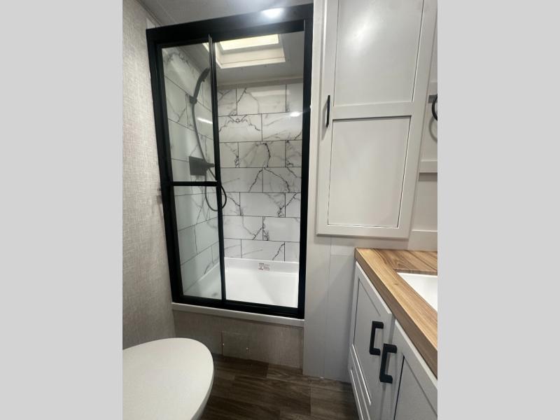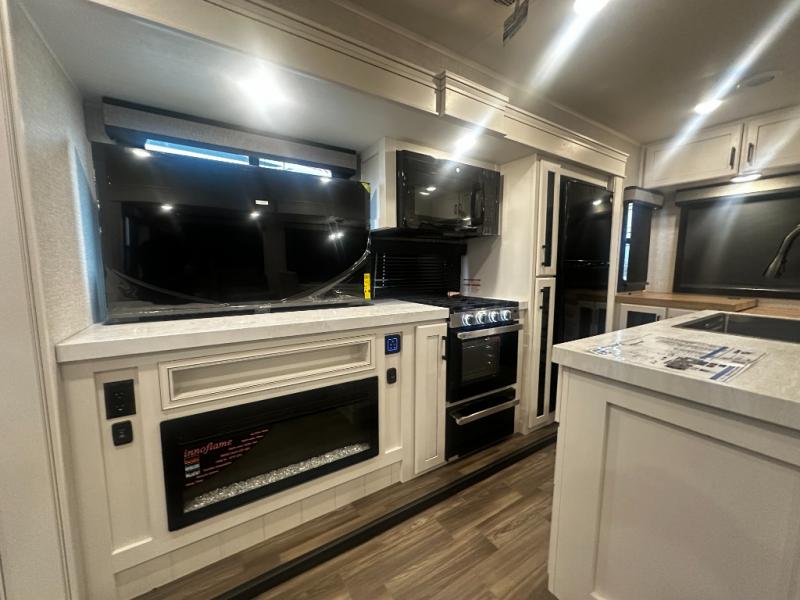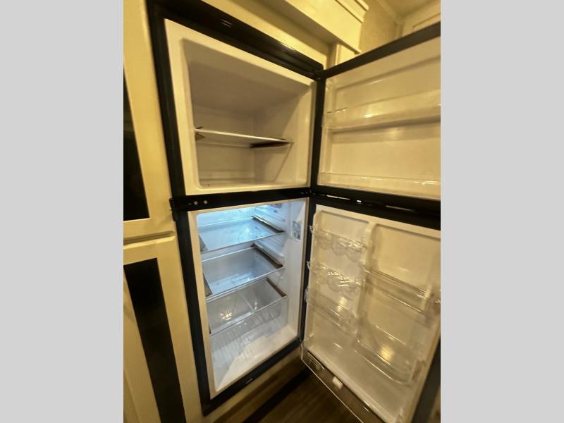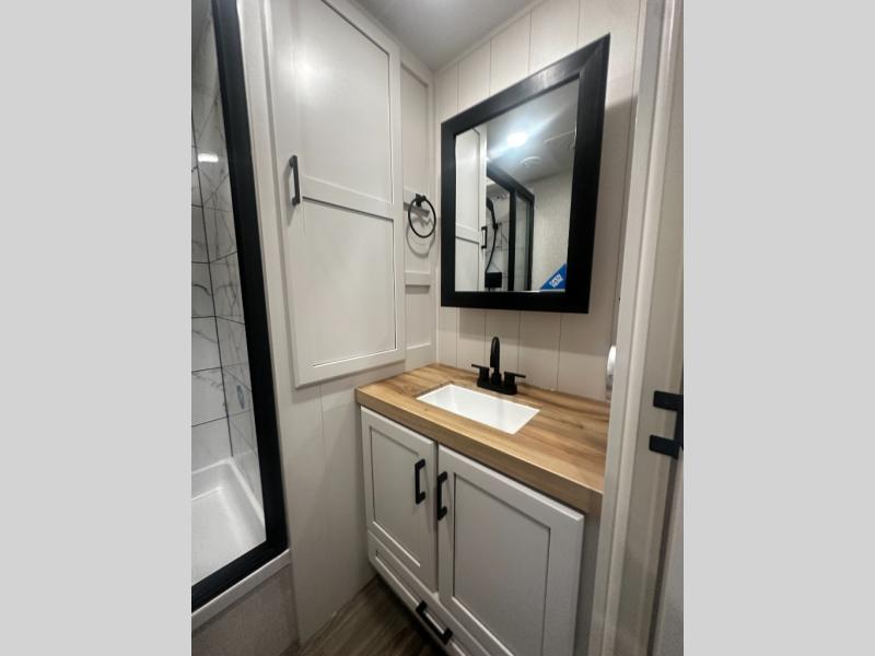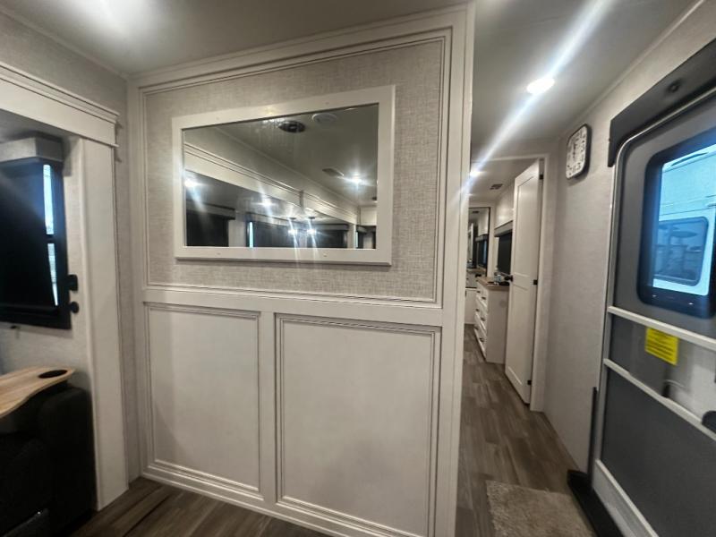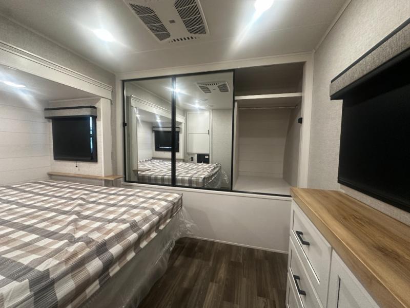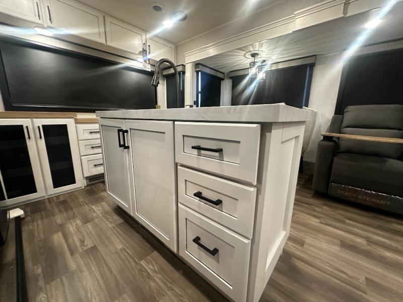 You will feel right at home camping in this travel trailer! It features a front private bedroom with an Olympic queen bed slide for more interior space, a dresser, a front wardrobe to hang your clothes, and a wardrobe with washer and dryer prep. Start each morning getting squeaky clean in the full bathroom with the shower, then head to the kitchen to fry up some eggs on the stainless steel range. The kitchen island provides more counter space to prep meals, and there are two pantries for dry goods and snacks. There is also a table and chairs with a bench seat plus a tri-fold sofa within the large slide out. And a desk with a bench seat lets you get some work done!