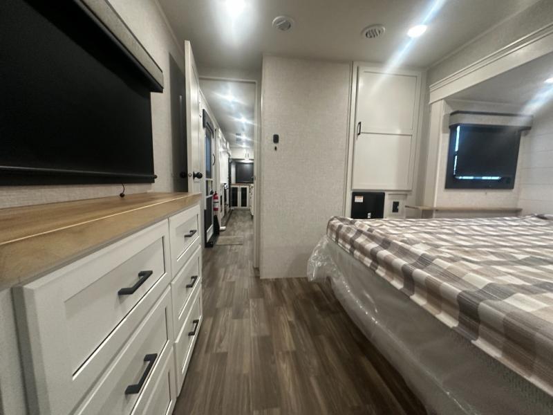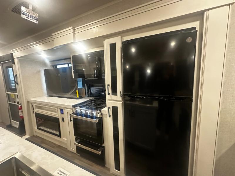 With any Eagle HT fifth wheel or travel trailer by Jayco you will enjoy a smooth drive thanks to the 4 Star Handling Package, Goodyear Endurance tires, and MORryde CRE-3000 rubberized suspension. The Customer Value Package includes amenities that are sure to make camping easier than ever, like the 60K on-demand water heater, Keyed-Alike lock system, 15,000 BTU "Whisper Quiet" A/C, and more. Handcrafted and glazed door/drawer fronts will make your space feel more like home, along with residential vinyl flooring throughout, GE appliances, and blackout roller shades with reflective side throughout to keep the sun out when you want to sleep in. Each model also includes a NuVo H2O water treatment system with filters included, interior and exterior "Blue Sync" audio connect with MB Quart Sound for your TV and phone, and 100% no floor vents for added comfort and convenience!