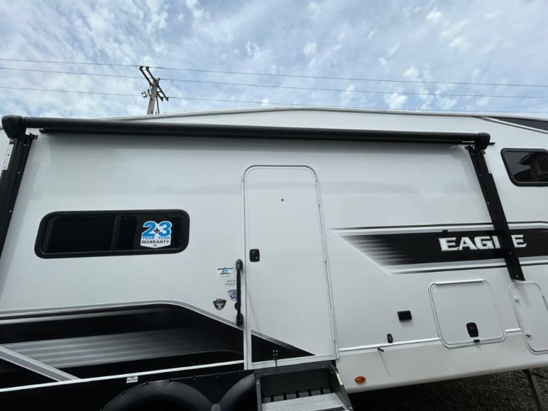 With any Eagle SLE fifth wheel by Jayco, you will enjoy a lighter tow weight, high-end finishes, and the same quality construction you've come to expect from Jayco! There is an Alpha Ply TPO roof membrane, a fully enclosed and heated underbelly, plus Stronghold VBL walls for added durability. There is also a rear 2" towing receiver outside, along with metal slam latch baggage doors, MORryde Step Above entry steps, and a Winegard Air 360 antenna with router prep if you want to stay connected as you camp. Once inside you'll enjoy the handcrafted and glazed door/drawer fronts, blackout pleated shades throughout, and residential vinyl flooring throughout with no carpet for an easier clean. The on-demand water heater, 30K BTU furnace, and 15K BTU "Whisper Quiet" A/C will ensure your comfort year around, and the optional Overland 1 Solar Package can be added if you need off-grid capabilities!