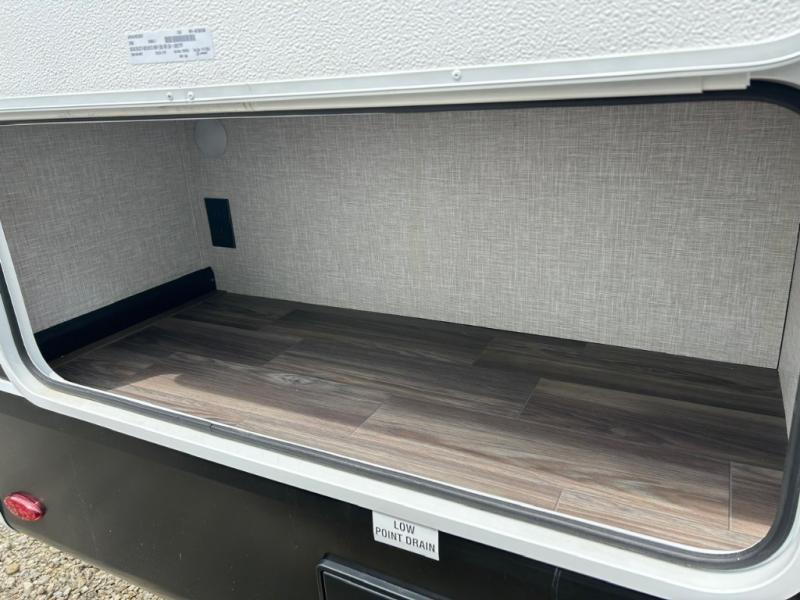 Camping just got a whole lot sweeter in this fifth wheel with double slides, a rear kitchen, and sleeping space for five to six. You'll love waking up each morning in the front private bedroom that includes a queen bed, dual nightstands and overhead cabinets, plus a wardrobe and dresser slide. Your guests who slept on the tri-fold sofa and booth dinette can convert these back to seating space in the morning, and breakfast can be made in the rear kitchen. Here, you'll find ample counter space, a microwave and range, plus a pantry and 12V refrigerator for food storage. Outside, gear can be stored in the pass-thru storage area, and you're sure to enjoy the 16' power awning with LED Lights!