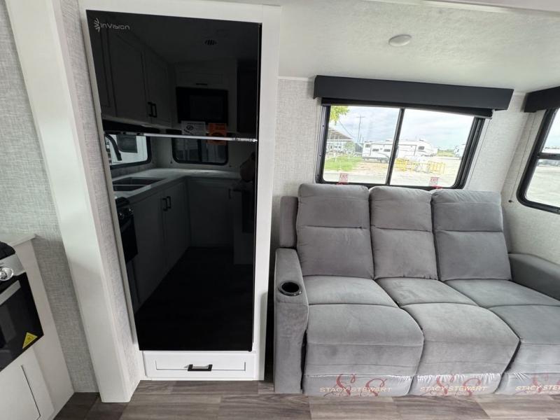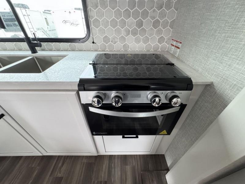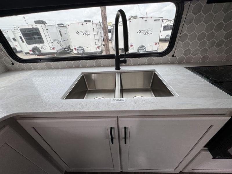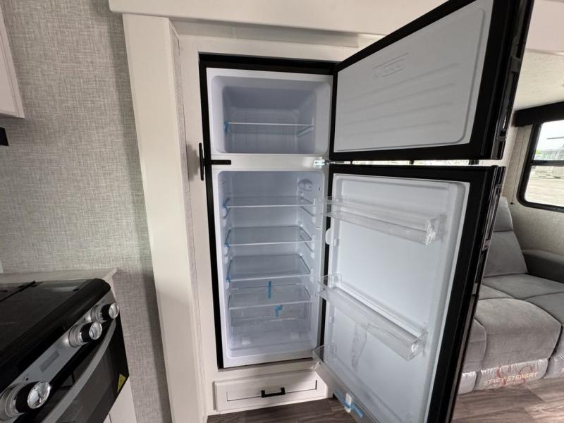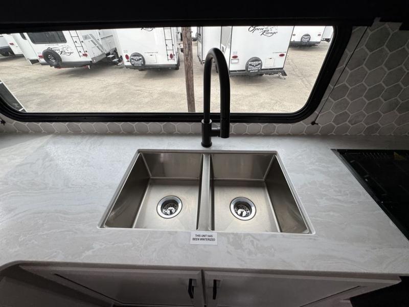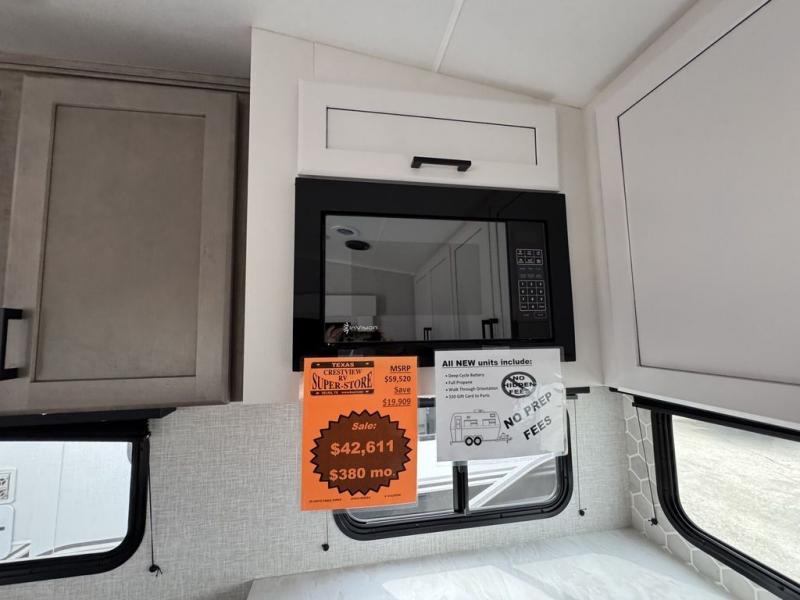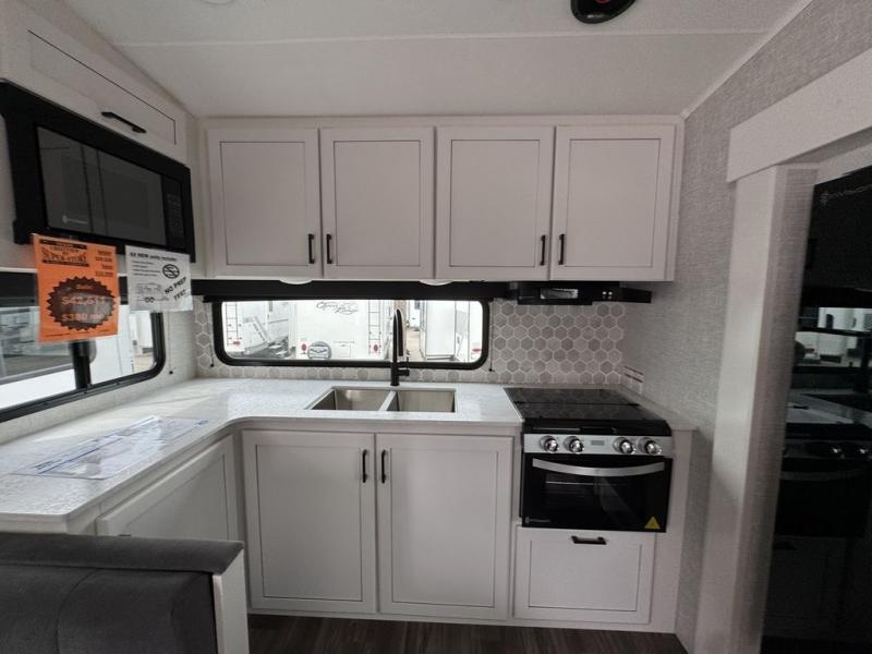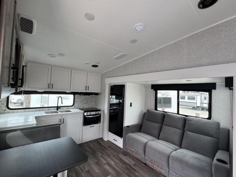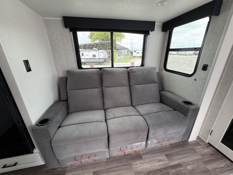 Camping just got a whole lot sweeter in this fifth wheel with double slides, a rear kitchen, and sleeping space for five to six. You'll love waking up each morning in the front private bedroom that includes a queen bed, dual nightstands and overhead cabinets, plus a wardrobe and dresser slide. Your guests who slept on the tri-fold sofa and booth dinette can convert these back to seating space in the morning, and breakfast can be made in the rear kitchen. Here, you'll find ample counter space, a microwave and range, plus a pantry and 12V refrigerator for food storage. Outside, gear can be stored in the pass-thru storage area, and you're sure to enjoy the 16' power awning with LED Lights!