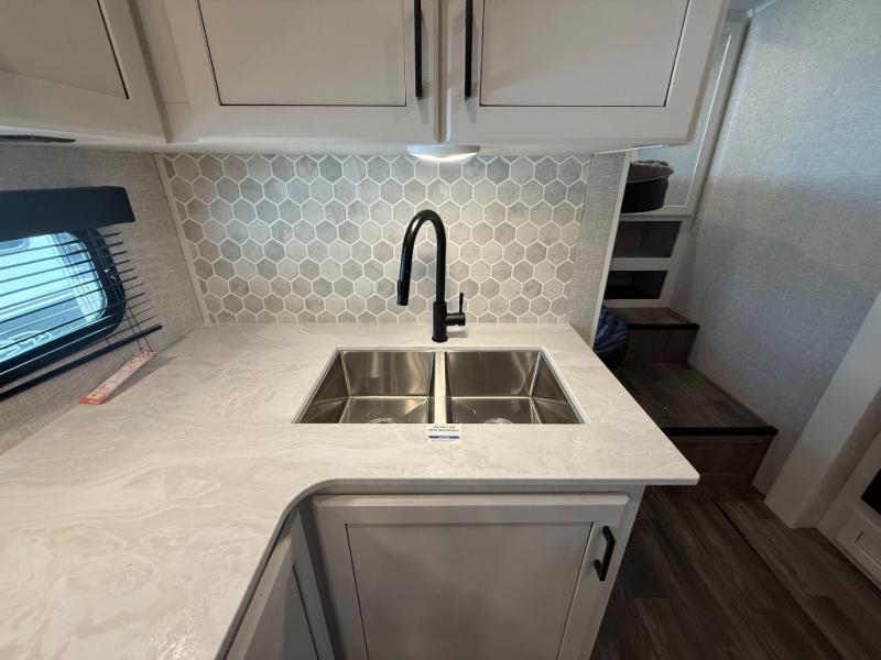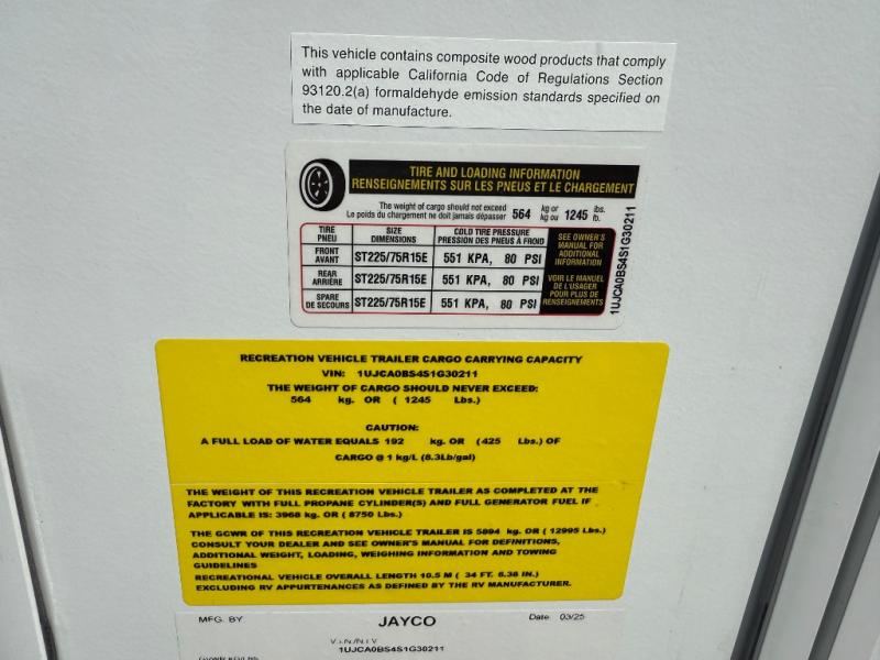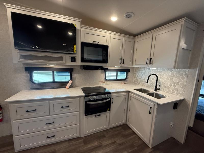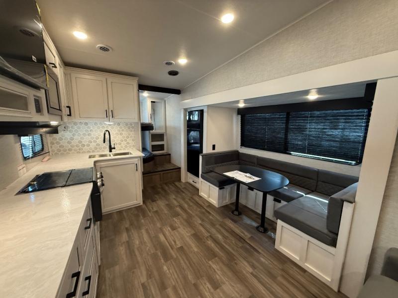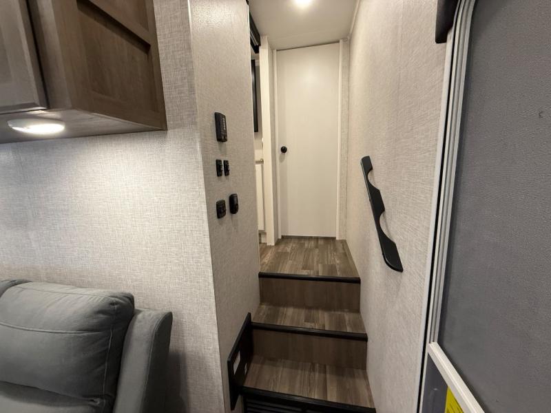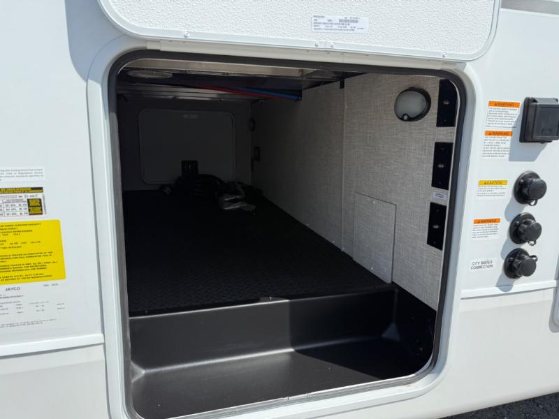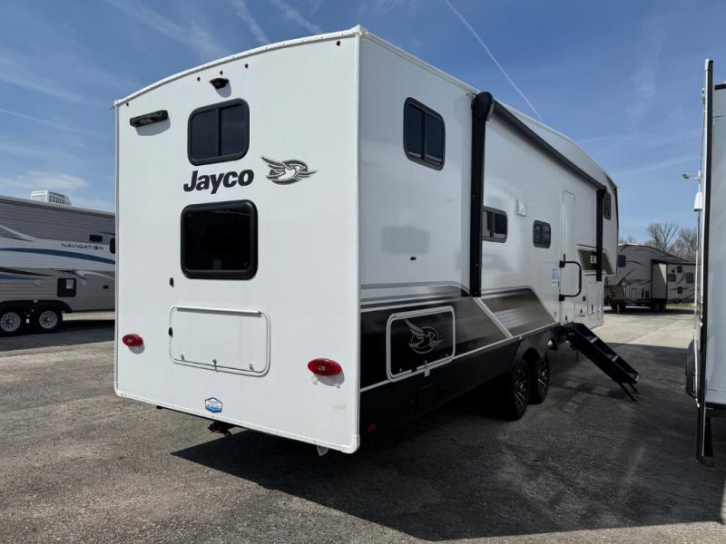 With any Eagle SLE fifth wheel by Jayco, you will enjoy a lighter tow weight, high-end finishes, and the same quality construction you've come to expect from Jayco! There is an Alpha Ply TPO roof membrane, a fully enclosed and heated underbelly, plus Stronghold VBL walls for added durability. There is also a rear 2" towing receiver outside, along with metal slam latch baggage doors, MORryde Step Above entry steps, and a Winegard Air 360 antenna with router prep if you want to stay connected as you camp. Once inside you'll enjoy the handcrafted and glazed door/drawer fronts, blackout pleated shades throughout, and residential vinyl flooring throughout with no carpet for an easier clean. The on-demand water heater, 30K BTU furnace, and 15K BTU "Whisper Quiet" A/C will ensure your comfort year around, and the optional Overland 1 Solar Package can be added if you need off-grid capabilities!