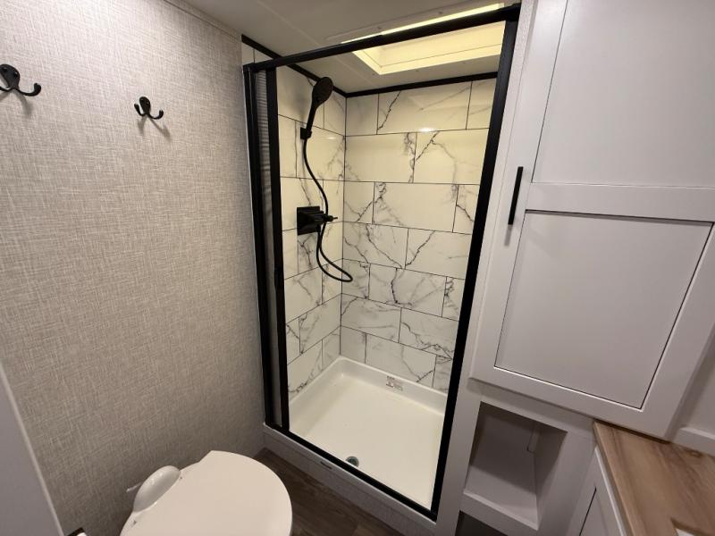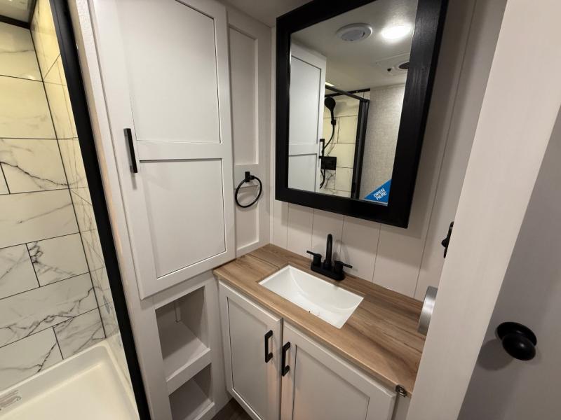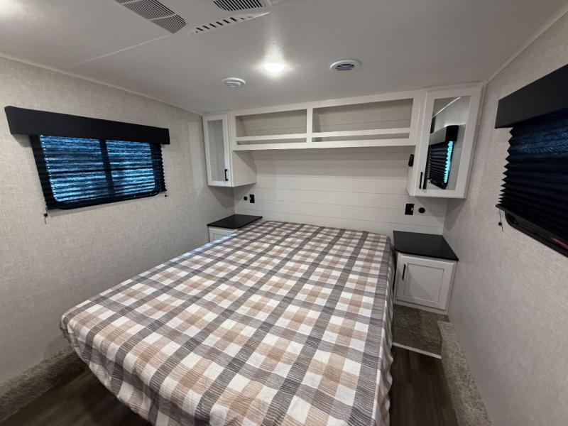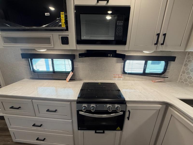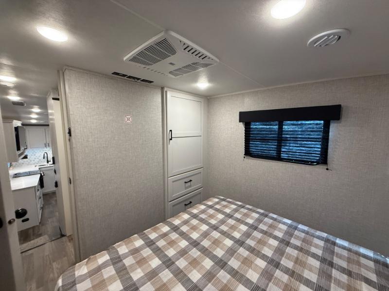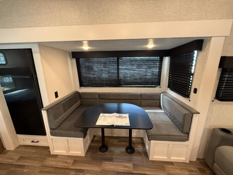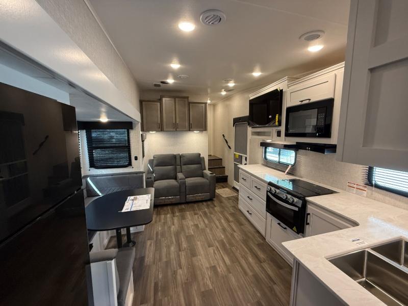 With any Eagle SLE fifth wheel by Jayco, you will enjoy a lighter tow weight, high-end finishes, and the same quality construction you've come to expect from Jayco! There is an Alpha Ply TPO roof membrane, a fully enclosed and heated underbelly, plus Stronghold VBL walls for added durability. There is also a rear 2" towing receiver outside, along with metal slam latch baggage doors, MORryde Step Above entry steps, and a Winegard Air 360 antenna with router prep if you want to stay connected as you camp. Once inside you'll enjoy the handcrafted and glazed door/drawer fronts, blackout pleated shades throughout, and residential vinyl flooring throughout with no carpet for an easier clean. The on-demand water heater, 30K BTU furnace, and 15K BTU "Whisper Quiet" A/C will ensure your comfort year around, and the optional Overland 1 Solar Package can be added if you need off-grid capabilities!