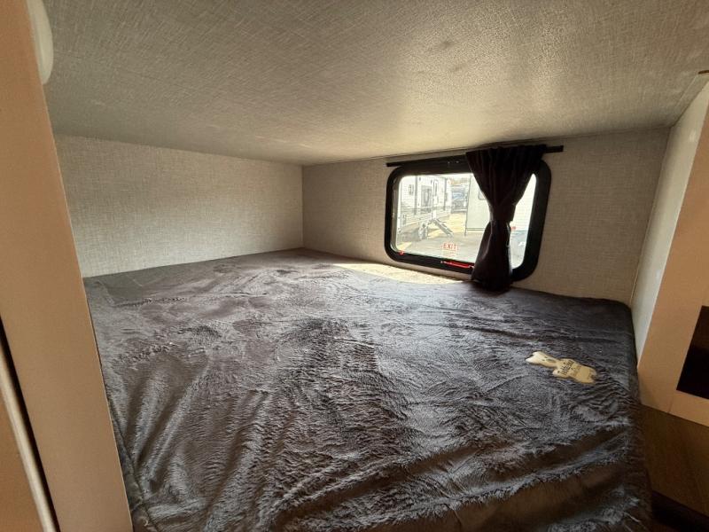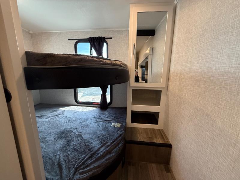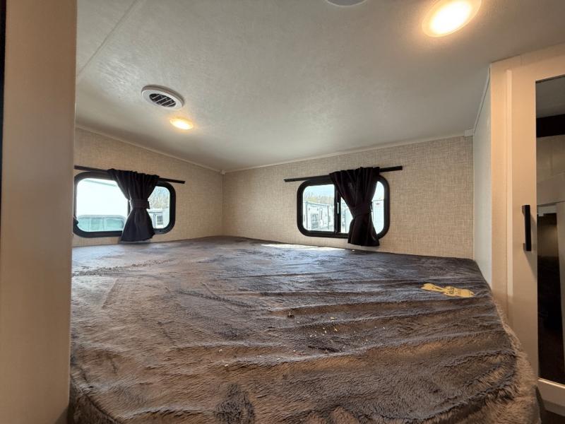 If you enjoy camping with a larger group, this fifth wheel is perfect for you! The rear bunkhouse includes double-size bunks, bunk storage and a wardrobe to keep this space tidy. You'll have the front private bedroom all to yourselves with a queen bed, and if you have any other guests, they can sleep on the tri-fold sofa and U-shaped dinette in the main living area. This space is also shared with the full kitchen, complete with a microwave and range, 12V refrigerator, and plenty of overhead cabinets for storage. After dinner, head outdoors to enjoy the 19' power awning with LED lights as you relax in your camp chairs!