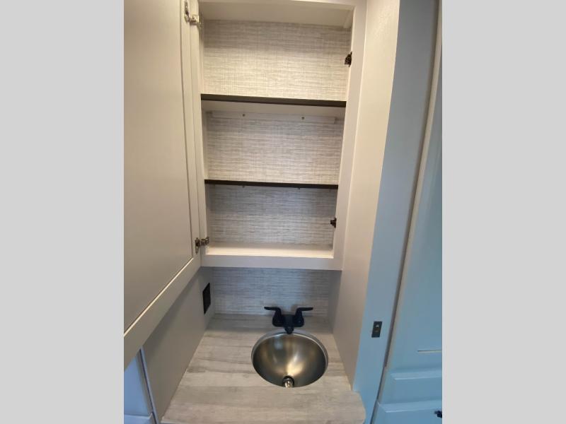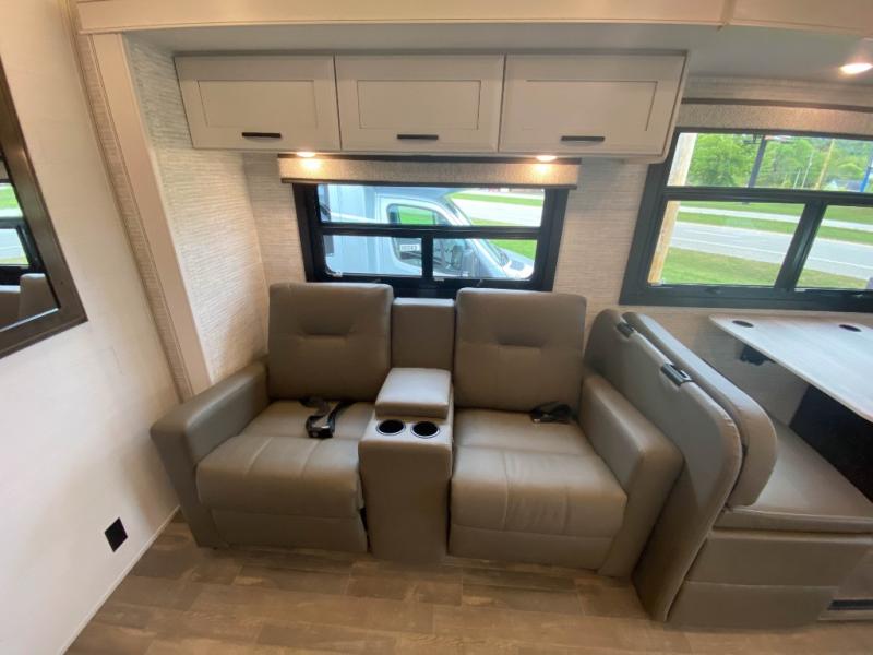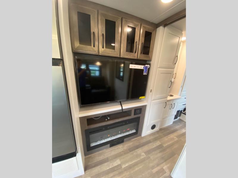 Pack your bags and head to your favorite camping spot in this spacious motorhome for six to seven. The little ones will love the cab-over bunk, and you'll have your own private bedroom in the back. There is also 72" theater seating and a 42" x 70" booth dinette that will serve as seating and sleeping space as well. This model will feel more like home with its fireplace, entertainment center with a 50" TV, and spacious living area. There is also a private toilet and shower, with the sink across the hall for convenience.
