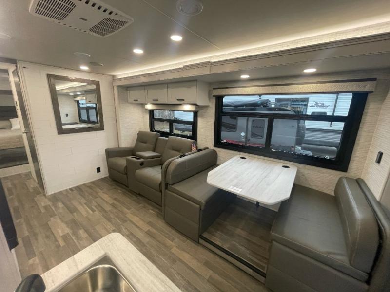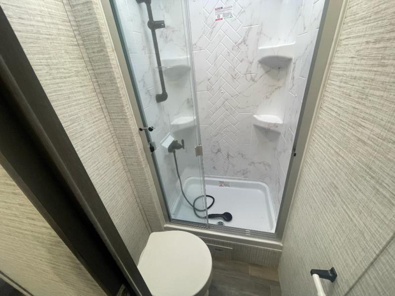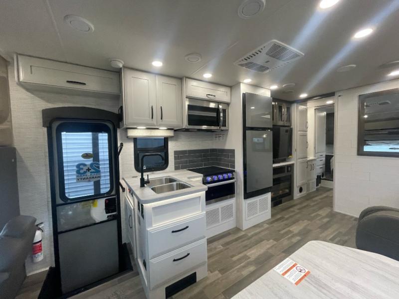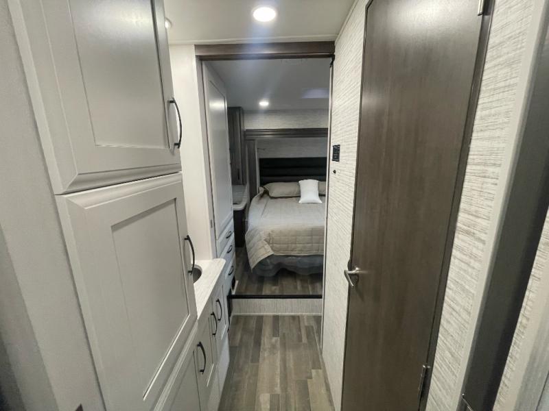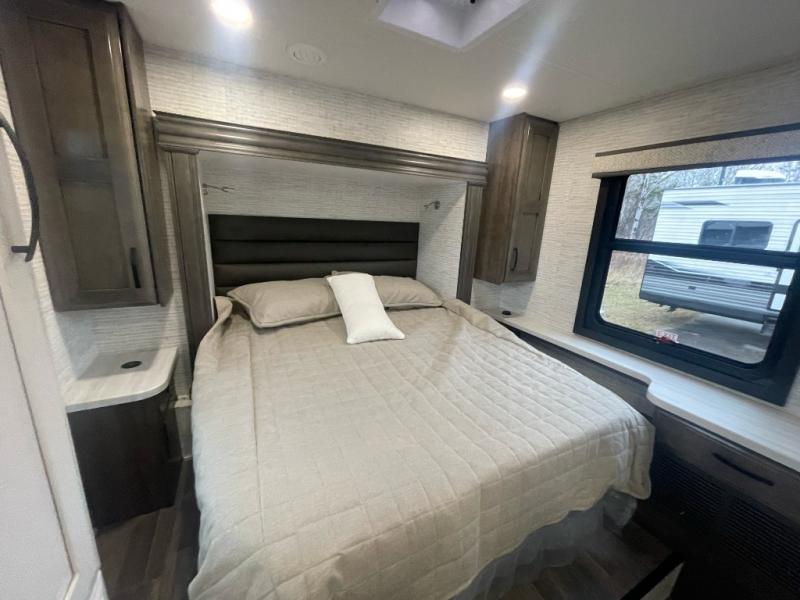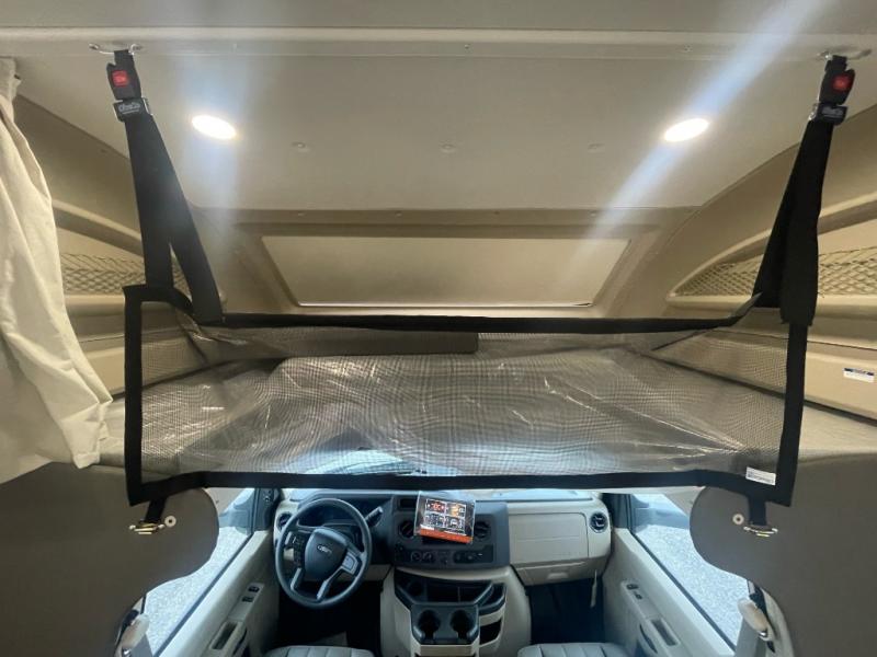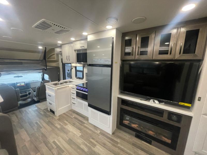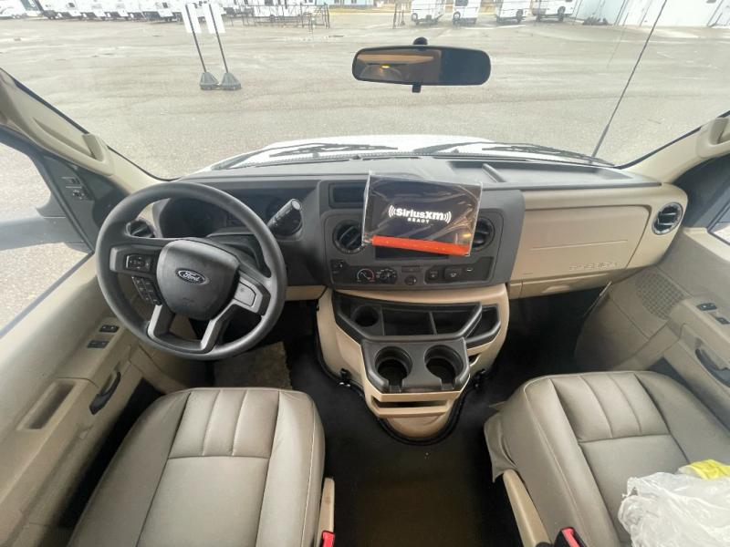 With any Greyhawk Class C gas motorhome by Jayco you will experience smooth sailing thanks to the JRIDE PLUS that comes with Koni shock absorbers, a computer-balanced driveshaft, Hellwig helper springs, and more. The Ford E-450 chassis with a 7.3L V8 325 HP engine will power your excursions, and you'll appreciate the added safety features for your peace of mind. Each model features a Sony infotainment center with Apple CarPlay and Android Auto, backup and side-view cameras, and a tire pressure monitor system the driver is sure to appreciate. Durable construction begins with Stronghold VBL roof, floor and sidewalls, bead-foam insulation, and a one-piece seamless fiberglass front cap. Head inside to find blackout night roller shades, LED-lit pressed countertops, an 84" interior ceiling height, and hardwood cabinet doors and drawers.