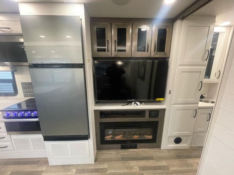 Pack your bags and head to your favorite camping spot in this spacious motorhome for six to seven. The little ones will love the cab-over bunk, and you'll have your own private bedroom in the back. There is also 72" theater seating and a 42" x 70" booth dinette that will serve as seating and sleeping space as well. This model will feel more like home with its fireplace, entertainment center with a 50" TV, and spacious living area. There is also a private toilet and shower, with the sink across the hall for convenience.