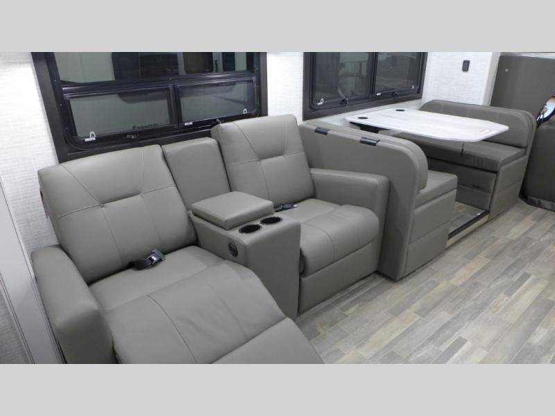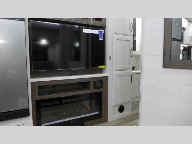 Pack your bags and head to your favorite camping spot in this spacious motorhome for six to seven. The little ones will love the cab-over bunk, and you'll have your own private bedroom in the back. There is also 72" theater seating and a 42" x 70" booth dinette that will serve as seating and sleeping space as well. This model will feel more like home with its fireplace, entertainment center with a 50" TV, and spacious living area. There is also a private toilet and shower, with the sink across the hall for convenience.