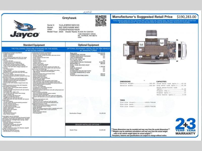With any Greyhawk Class C gas motorhome by Jayco you will experience smooth sailing thanks to the JRIDE PLUS that comes with Koni shock absorbers, a computer-balanced driveshaft, Hellwig helper springs, and more. The Ford E-450 chassis with a 7.3L V8 325 HP engine will power your excursions, and you'll appreciate the added safety features for your peace of mind. Each model features a Sony infotainment center with Apple CarPlay and Android Auto, backup and side-view cameras, and a tire pressure monitor system the driver is sure to appreciate. Durable construction begins with Stronghold VBL roof, floor and sidewalls, bead-foam insulation, and a one-piece seamless fiberglass front cap. Head inside to find blackout night roller shades, LED-lit pressed countertops, an 84" interior ceiling height, and hardwood cabinet doors and drawers.