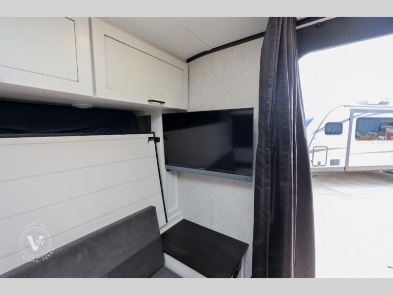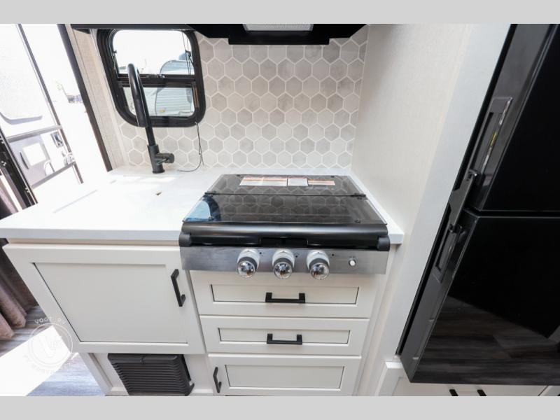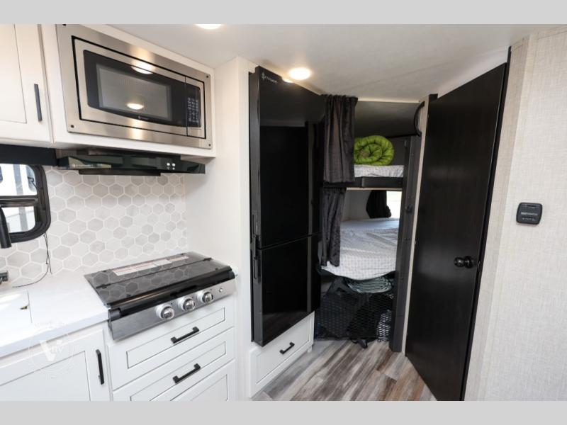 Jayco's lightest travel trailer, the Jay Feather Micro is ready for adventure at the drop of a hat! The Climate Shield weather protection will let you camp well into the colder months and the Stronghold VBL with double-sized Azdel is ultra durable. The Jay Pro Package includes 16-inch American-made Goodyear off-road tires with self-adjusting brakes, a rear-mounted roof ladder, and the Overlander 1 Solar Package with a 200W solar panel. Additional exterior features include marine grade exterior speakers with blue LED accent lighting, a swing-out entry door assist handle, a power tongue jack, and more! Inside, you will love the 4-inch high-density dinette cushions with vinyl backing for easy cleaning, along with the handcrafted hardwood door/drawer fronts, residential style kitchen countertops, and decorative roller shades with a reflective barrier for better insulation.