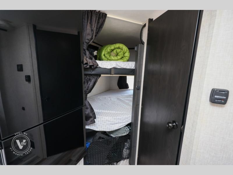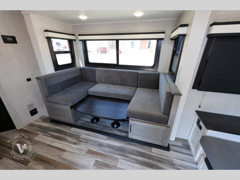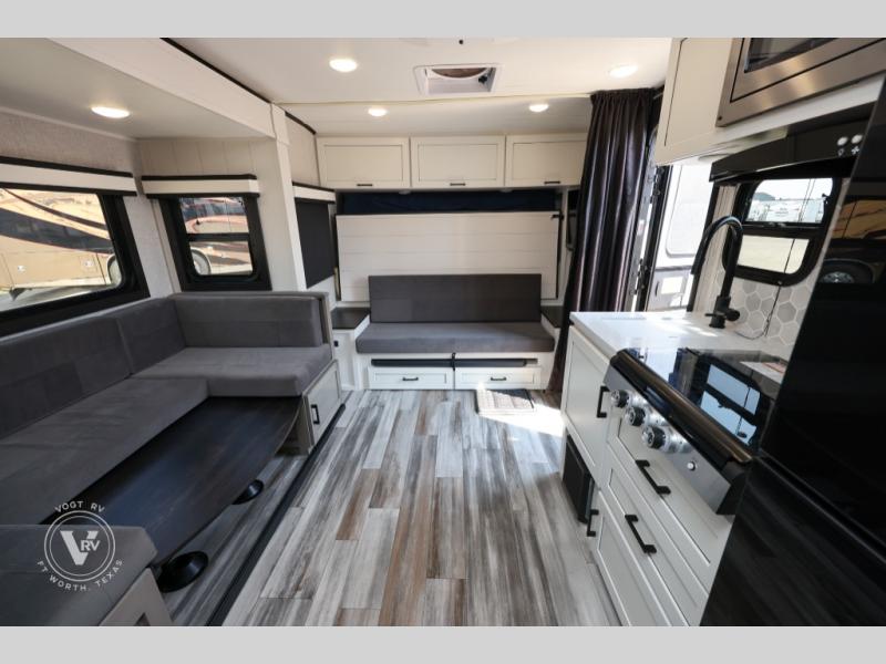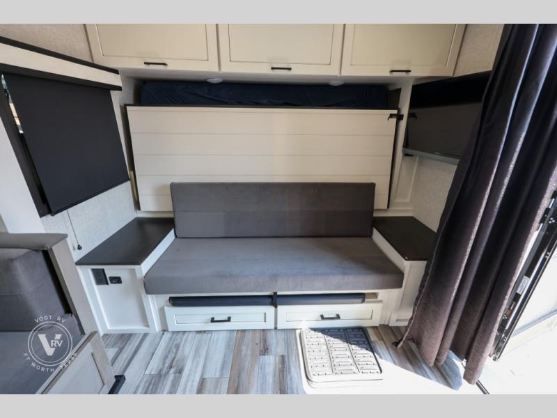 Pack up the family and head to your local state park in this cozy travel trailer for eight. The little ones will love the double-size bunks, and the full bath is close by for convenience. There is a Murphy bed up front that you can fold up each morning to relax on the sofa. If you have any other guests, they can sleep on the U-shaped dinette within the slide out. This model includes a three burner cooktop and a microwave oven, plus an outside kitchen to give the chef a choice where to cook. The 15' power awning will provide shade while the meal is being made, and there is exterior storage for your camp chairs.