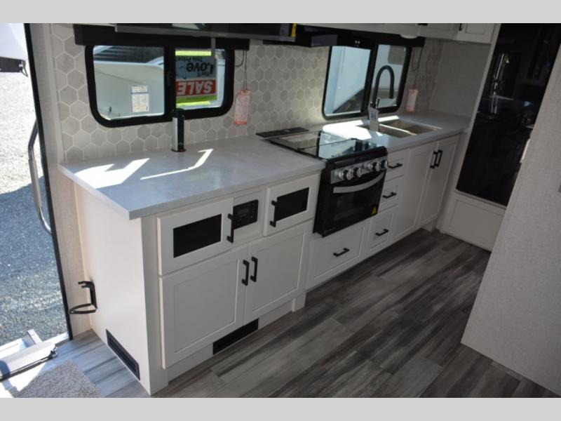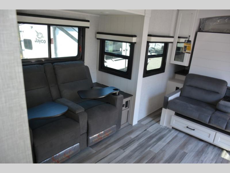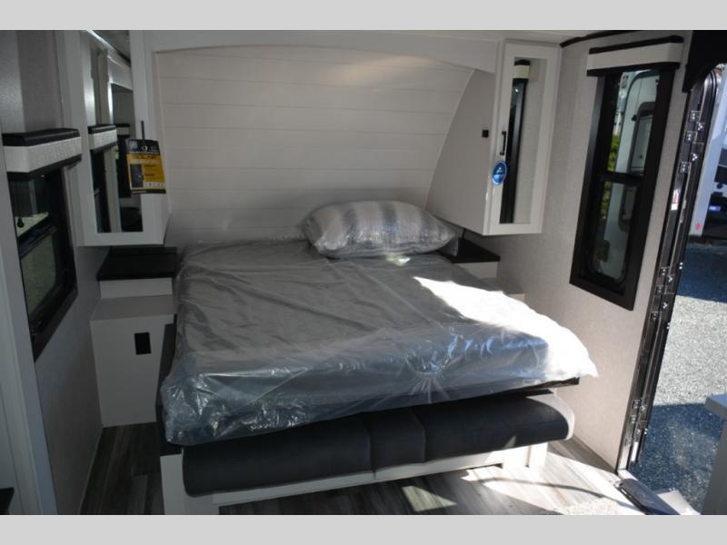 With any Jay Feather travel trailer by Jayco, you will enjoy lightweight towing, convenient exterior amenities, and at-home comforts inside! The Overlander 1 Solar Package included within the Jay Sport Package comes with a 200W solar panel and a 30-amp digital controller so you can enjoy some off-grid camping. There is also a modern graphics package with a dual-colored sidewall, LCI Solid Step fold-down aluminum tread steps on the main entry door, and Climate Shield 0 -100° F tested weather insulation package that will allow you to camp in all sorts of climates. The Customer Value Package will make time outdoors easier than ever with a power tongue jack and a Rock Solid stabilizer system, plus American-made nitro-filled Goodyear tires with self-adjusting electric brakes. More exterior features include a Keyed-Alike locking system, marine grade exterior speakers, a Magnum Truss roof system, and the list goes on! And we haven't even touched on the interior comforts, like the residential style seamless countertops and vinyl flooring throughout, decorative backsplash, handcrafted hardwood door/drawer fronts, and multiple USB charging ports to keep you going!
