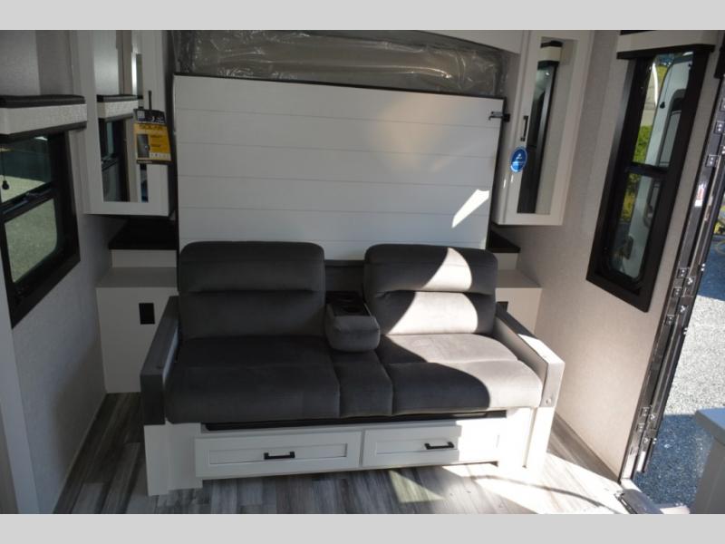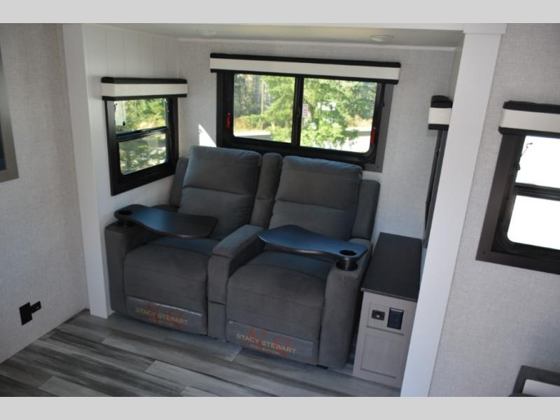 This travel trailer offers a lot of possibilities! During the day, relax in the spacious front living area with a jackknife sofa plus a pair of theater seats, both positioned for a great view of the entertainment center. A fully equipped kitchen with stainless steel double bowl sink, microwave, and three-burner range makes meals easy, and the theater seats have swing-out trays for you to dine. At night, pull down the 60" x 75" Murphy bed for a great night's sleep! wardrobes on either side of the bed provide plenty of storage for your clothing. The rear corner bath is convenient and private, and offers a linen closet plus a medicine cabinet for additional storage capability. Outside you will be sheltered from the sun beneath the 15' awning, and there is an LP Quick Connect if you want to hook up your personal grill.