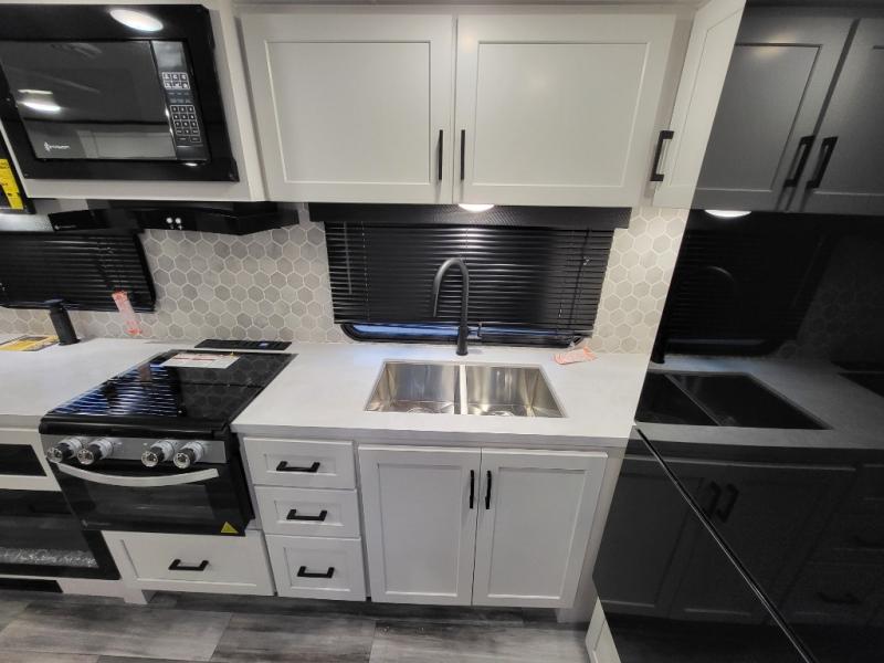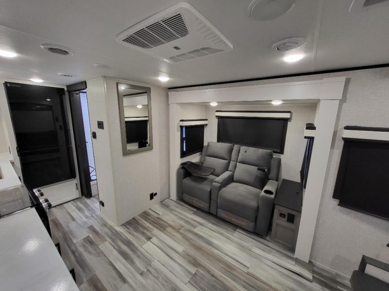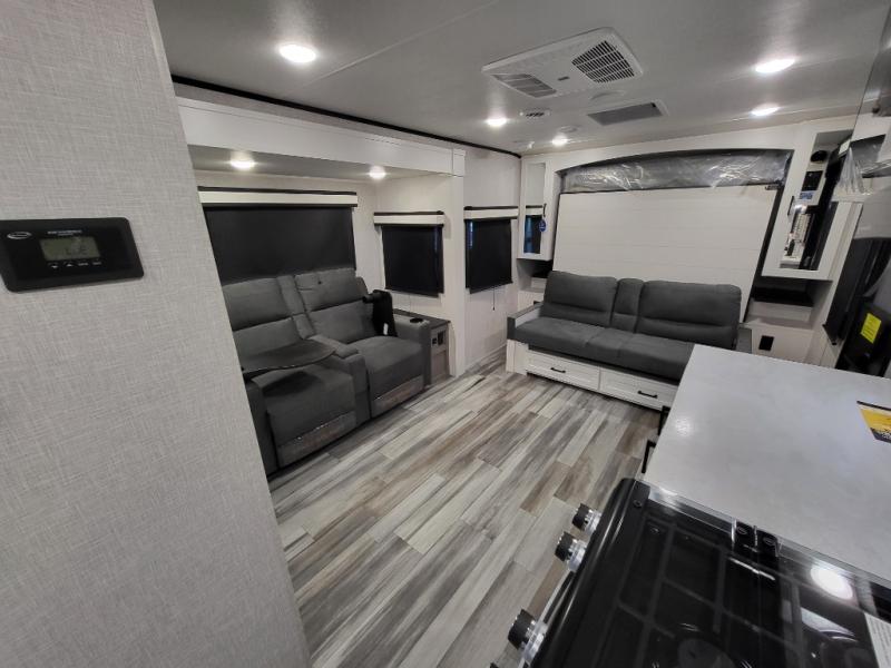 This travel trailer offers a lot of possibilities! During the day, relax in the spacious front living area with a jackknife sofa plus a pair of theater seats, both positioned for a great view of the entertainment center. A fully equipped kitchen with stainless steel double bowl sink, microwave, and three-burner range makes meals easy, and the theater seats have swing-out trays for you to dine. At night, pull down the 60" x 75" Murphy bed for a great night's sleep! wardrobes on either side of the bed provide plenty of storage for your clothing. The rear corner bath is convenient and private, and offers a linen closet plus a medicine cabinet for additional storage capability. Outside you will be sheltered from the sun beneath the 15' awning, and there is an LP Quick Connect if you want to hook up your personal grill.