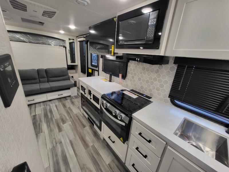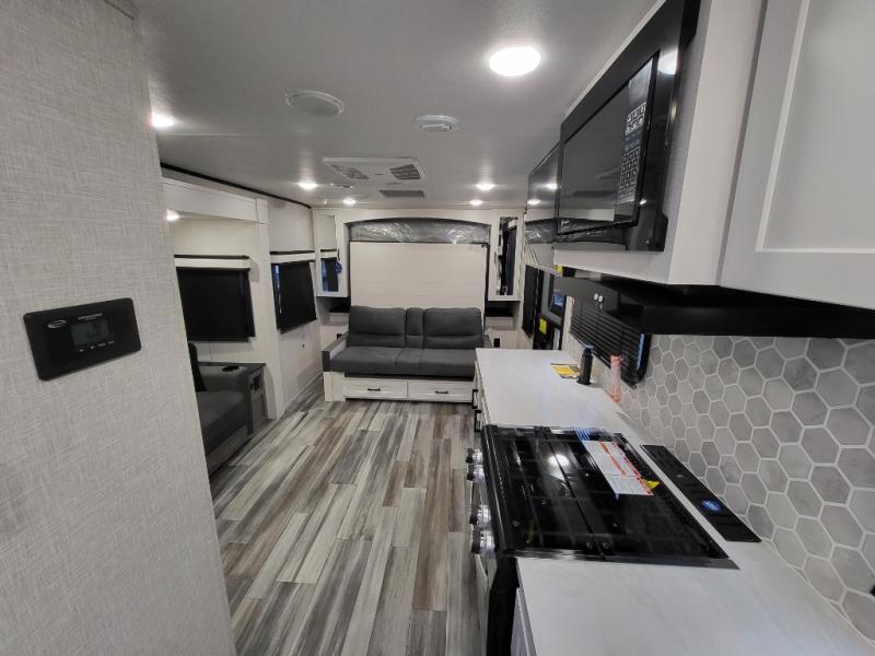 With any Jay Feather travel trailer by Jayco, you will enjoy lightweight towing, convenient exterior amenities, and at-home comforts inside! The Overlander 1 Solar Package included within the Jay Sport Package comes with a 200W solar panel and a 30-amp digital controller so you can enjoy some off-grid camping. There is also a modern graphics package with a dual-colored sidewall, LCI Solid Step fold-down aluminum tread steps on the main entry door, and Climate Shield 0 -100° F tested weather insulation package that will allow you to camp in all sorts of climates. The Customer Value Package will make time outdoors easier than ever with a power tongue jack and a Rock Solid stabilizer system, plus American-made nitro-filled Goodyear tires with self-adjusting electric brakes. More exterior features include a Keyed-Alike locking system, marine grade exterior speakers, a Magnum Truss roof system, and the list goes on! And we haven't even touched on the interior comforts, like the residential style seamless countertops and vinyl flooring throughout, decorative backsplash, handcrafted hardwood door/drawer fronts, and multiple USB charging ports to keep you going!