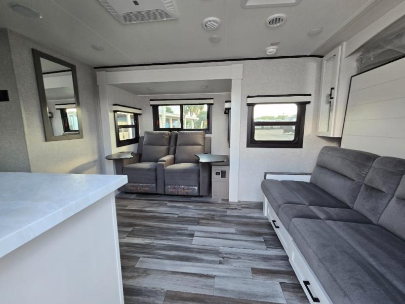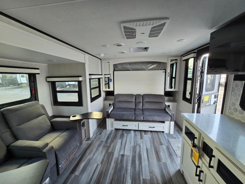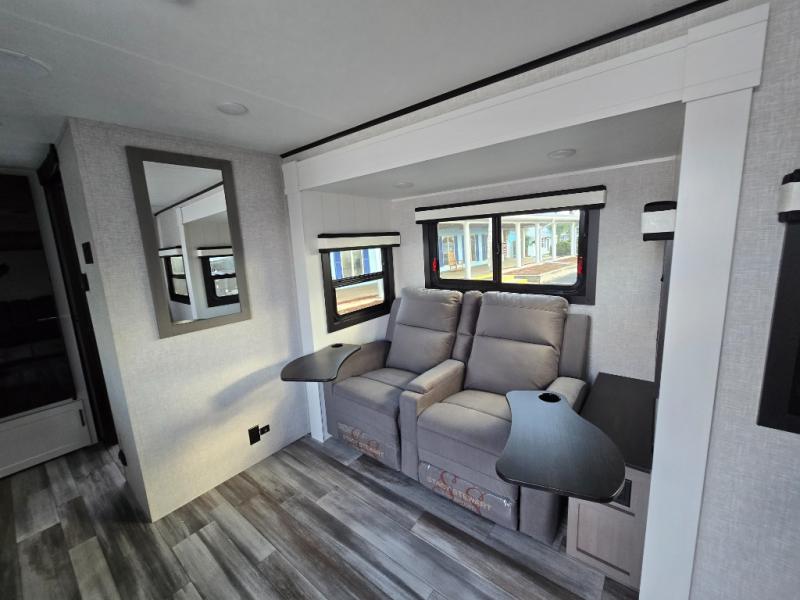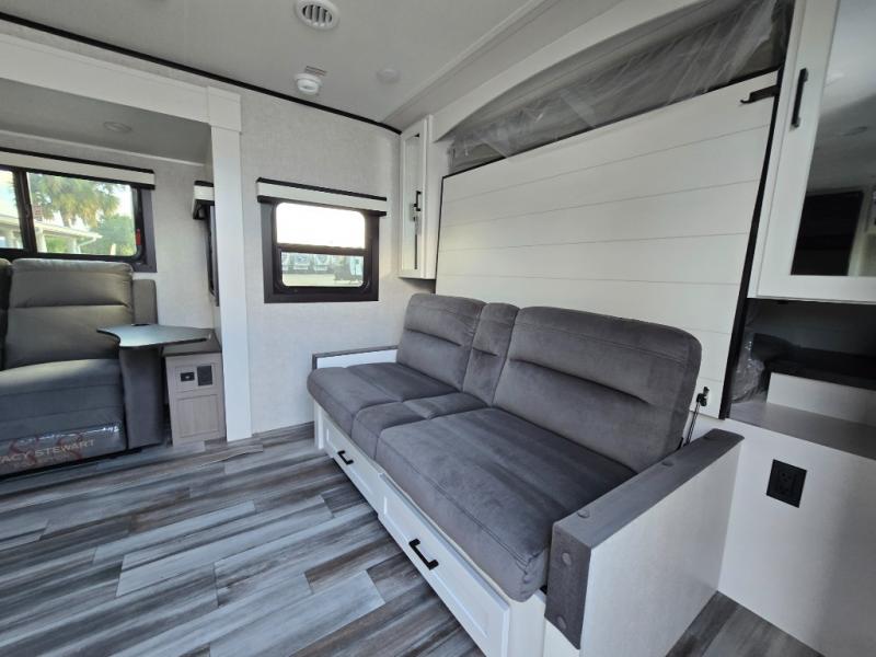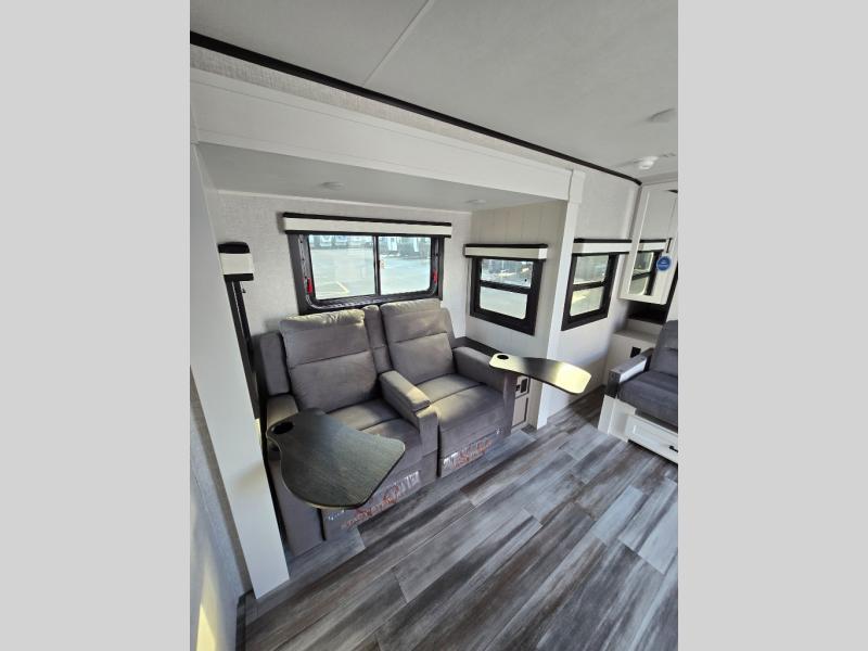 This travel trailer offers a lot of possibilities! During the day, relax in the spacious front living area with a jackknife sofa plus a pair of theater seats, both positioned for a great view of the entertainment center. A fully equipped kitchen with stainless steel double bowl sink, microwave, and three-burner range makes meals easy, and the theater seats have swing-out trays for you to dine. At night, pull down the 60" x 75" Murphy bed for a great night's sleep! wardrobes on either side of the bed provide plenty of storage for your clothing. The rear corner bath is convenient and private, and offers a linen closet plus a medicine cabinet for additional storage capability. Outside you will be sheltered from the sun beneath the 15' awning, and there is an LP Quick Connect if you want to hook up your personal grill.