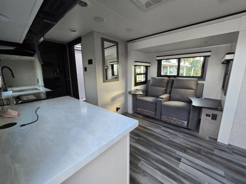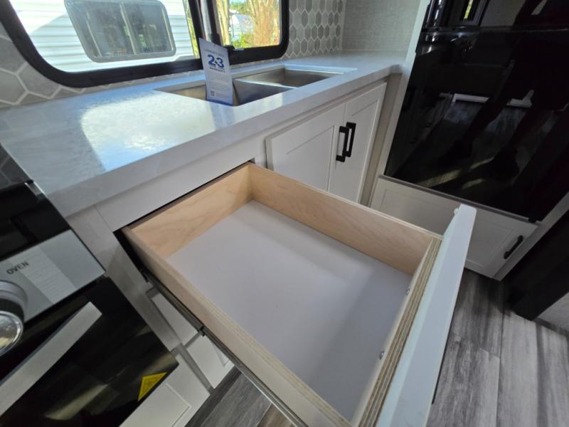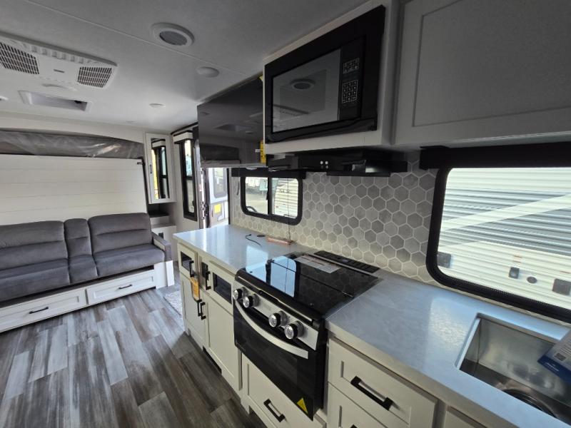 With any Jay Feather travel trailer by Jayco, you will enjoy lightweight towing, convenient exterior amenities, and at-home comforts inside! The Overlander 1 Solar Package included within the Jay Sport Package comes with a 200W solar panel and a 30-amp digital controller so you can enjoy some off-grid camping. There is also a modern graphics package with a dual-colored sidewall, LCI Solid Step fold-down aluminum tread steps on the main entry door, and Climate Shield 0 -100° F tested weather insulation package that will allow you to camp in all sorts of climates. The Customer Value Package will make time outdoors easier than ever with a power tongue jack and a Rock Solid stabilizer system, plus American-made nitro-filled Goodyear tires with self-adjusting electric brakes. More exterior features include a Keyed-Alike locking system, marine grade exterior speakers, a Magnum Truss roof system, and the list goes on! And we haven't even touched on the interior comforts, like the residential style seamless countertops and vinyl flooring throughout, decorative backsplash, handcrafted hardwood door/drawer fronts, and multiple USB charging ports to keep you going!