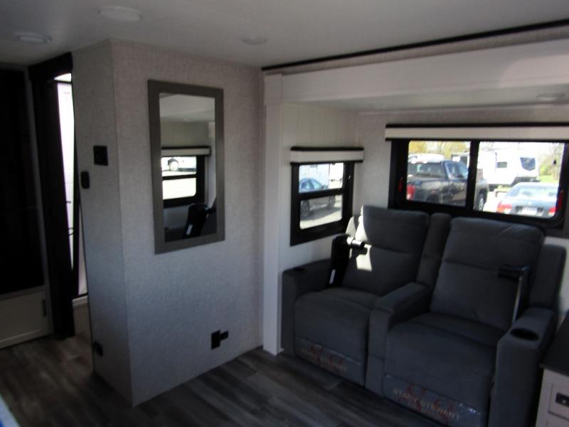 This travel trailer offers a lot of possibilities! During the day, relax in the spacious front living area with a jackknife sofa plus a pair of theater seats, both positioned for a great view of the entertainment center. A fully equipped kitchen with stainless steel double bowl sink, microwave, and three-burner range makes meals easy, and the theater seats have swing-out trays for you to dine. At night, pull down the 60" x 75" Murphy bed for a great night's sleep! wardrobes on either side of the bed provide plenty of storage for your clothing. The rear corner bath is convenient and private, and offers a linen closet plus a medicine cabinet for additional storage capability. Outside you will be sheltered from the sun beneath the 15' awning, and there is an LP Quick Connect if you want to hook up your personal grill.